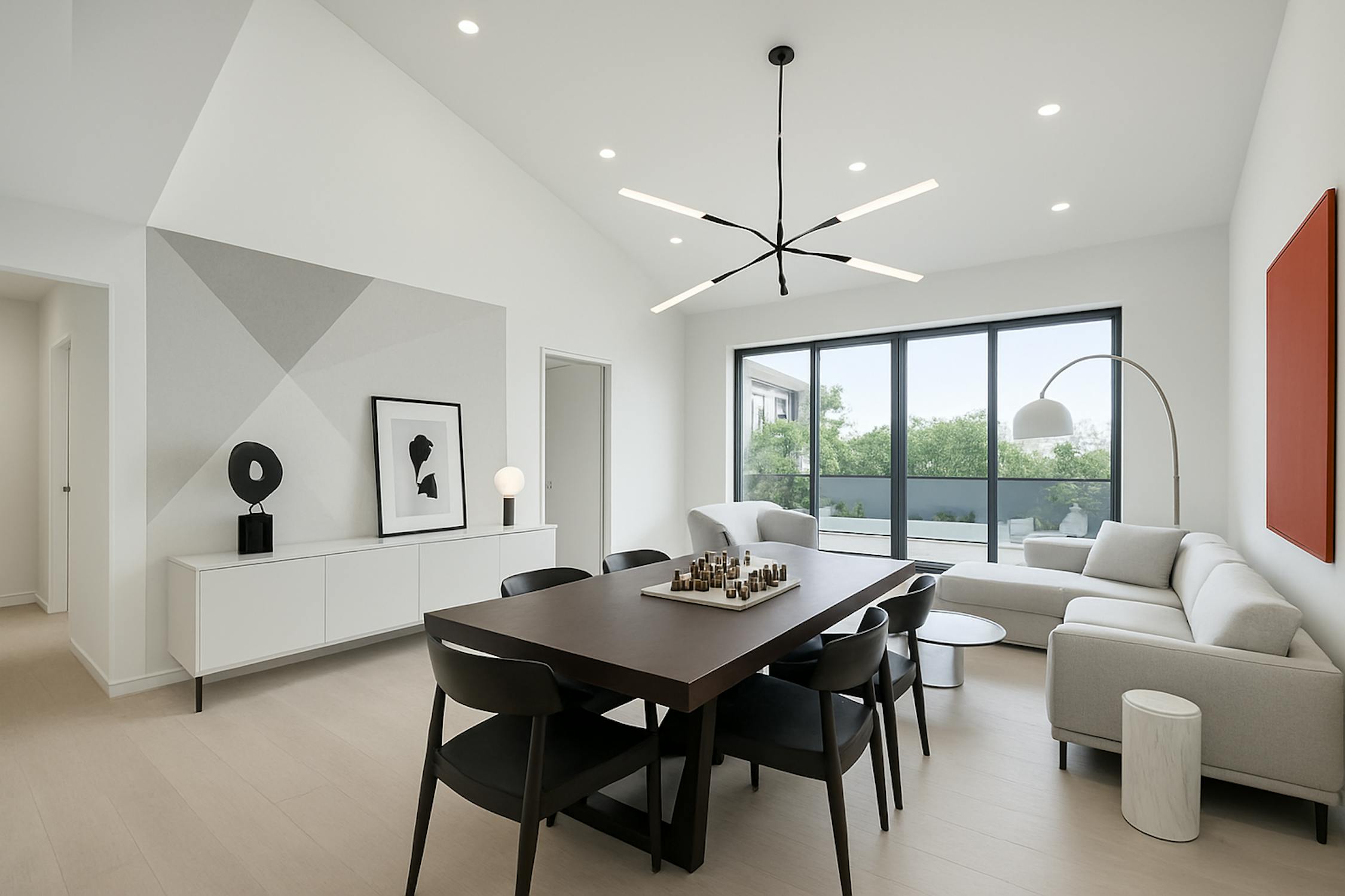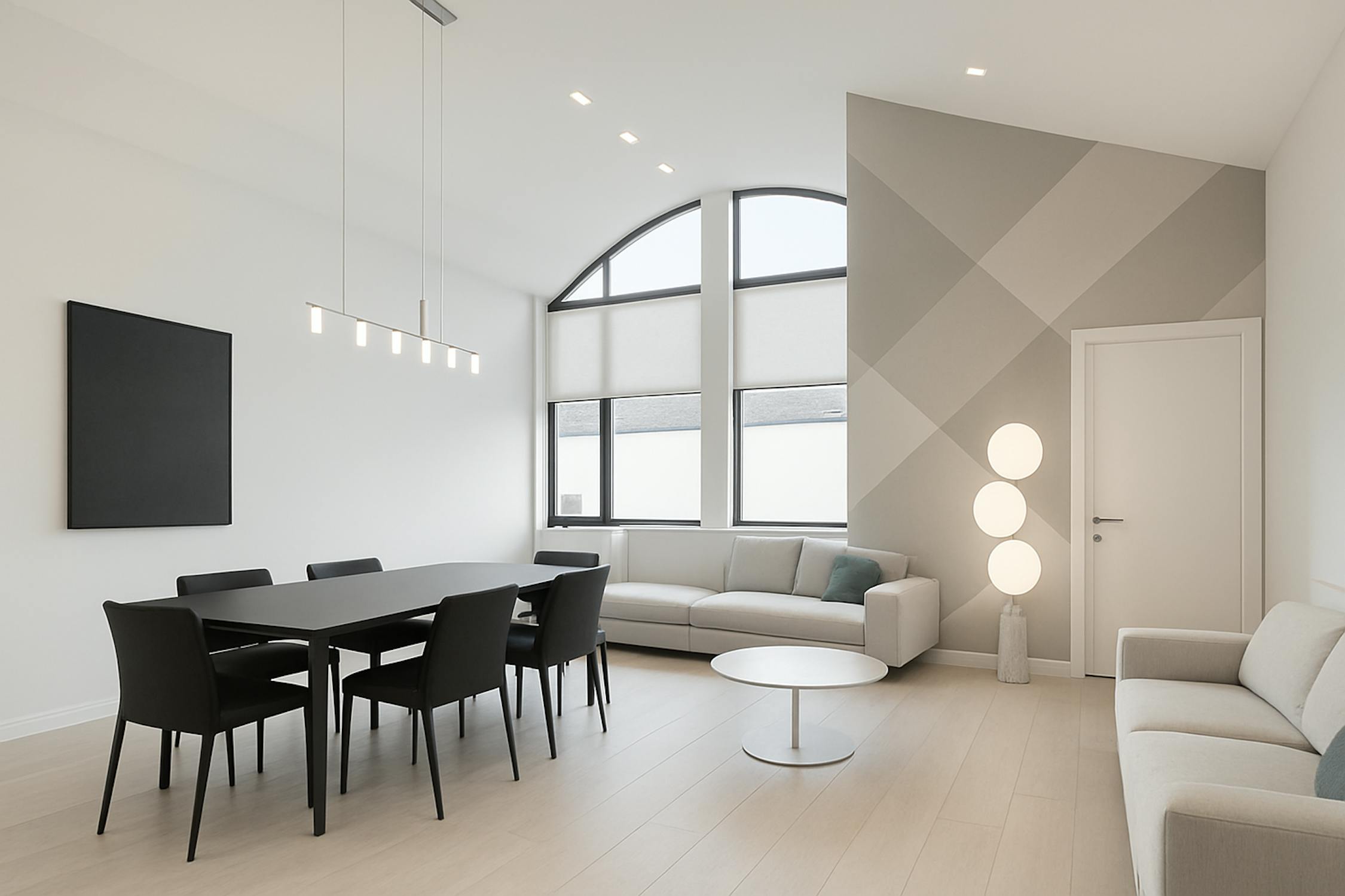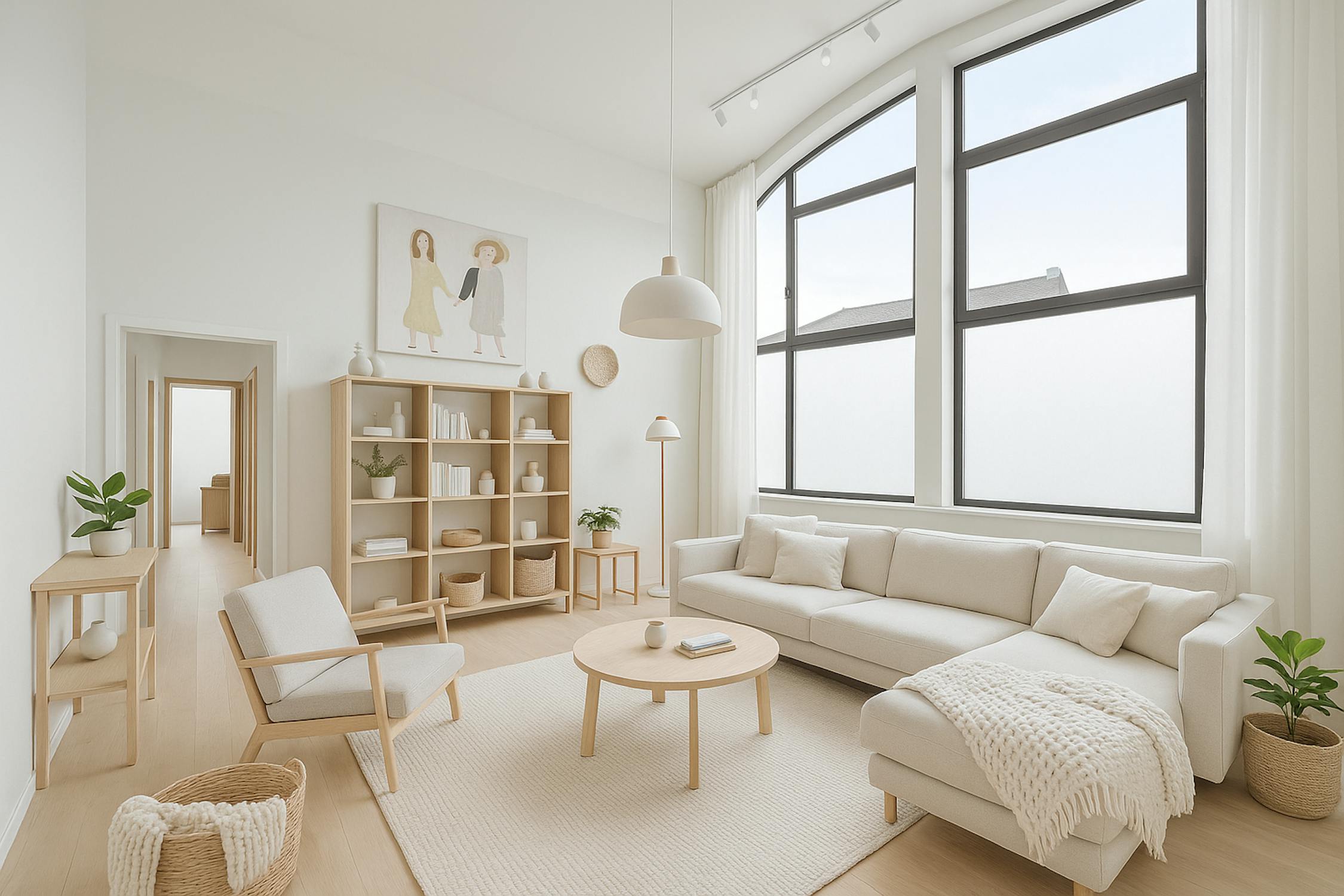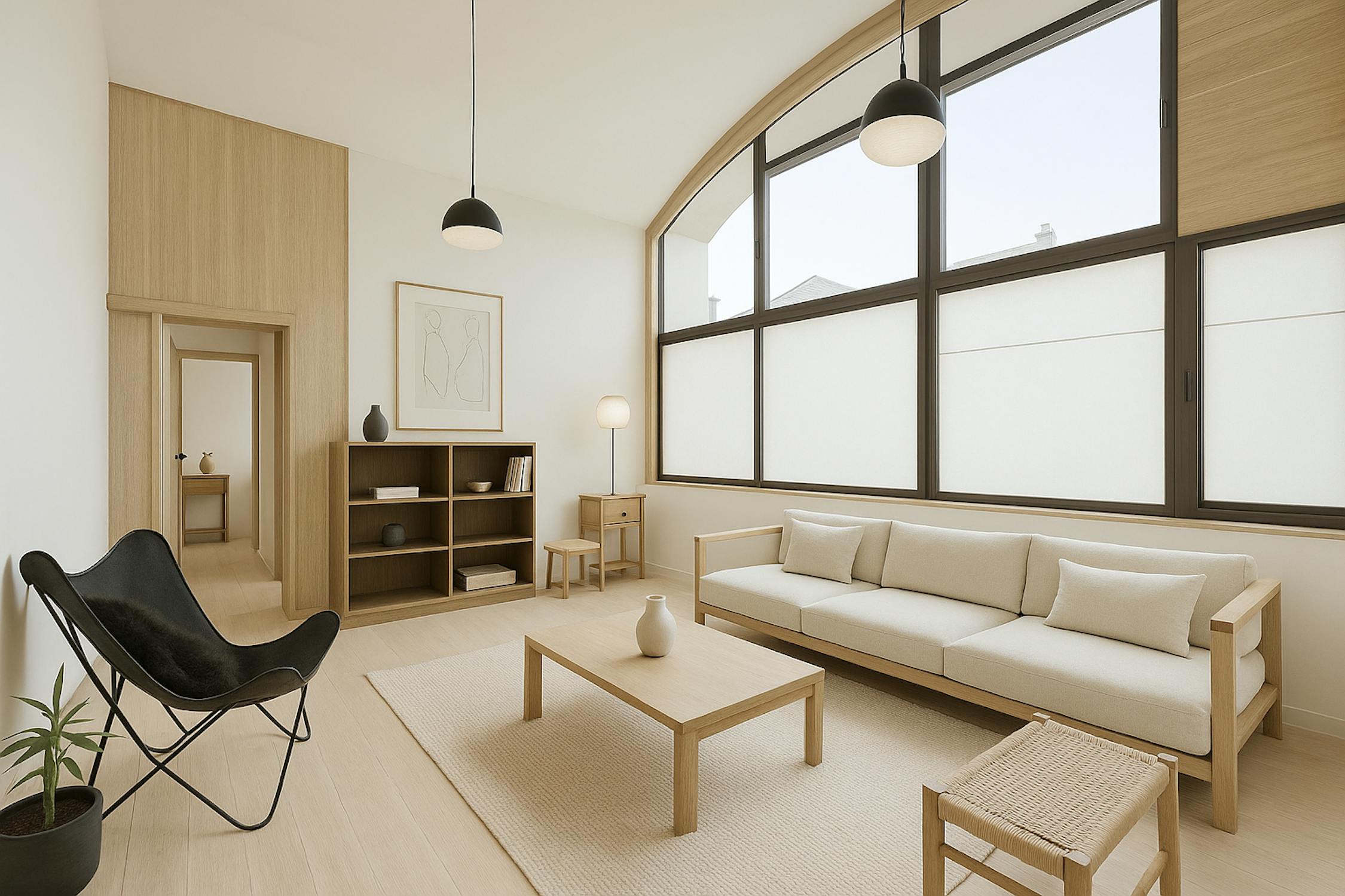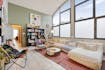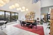 - bright living room with high ceilings and large windows (solar filter)