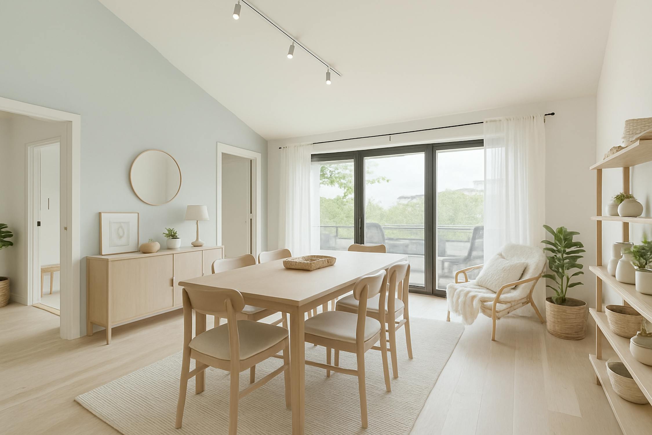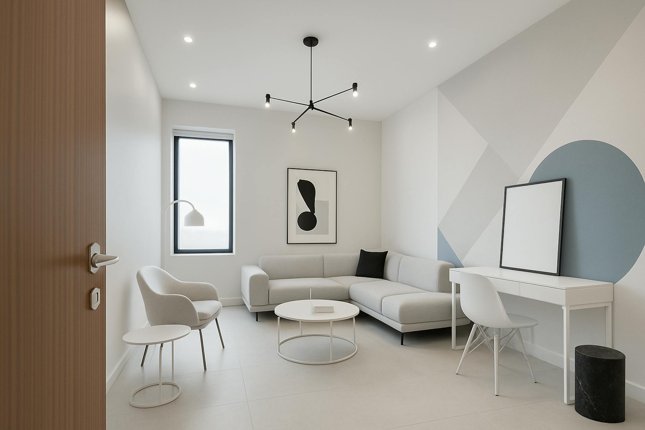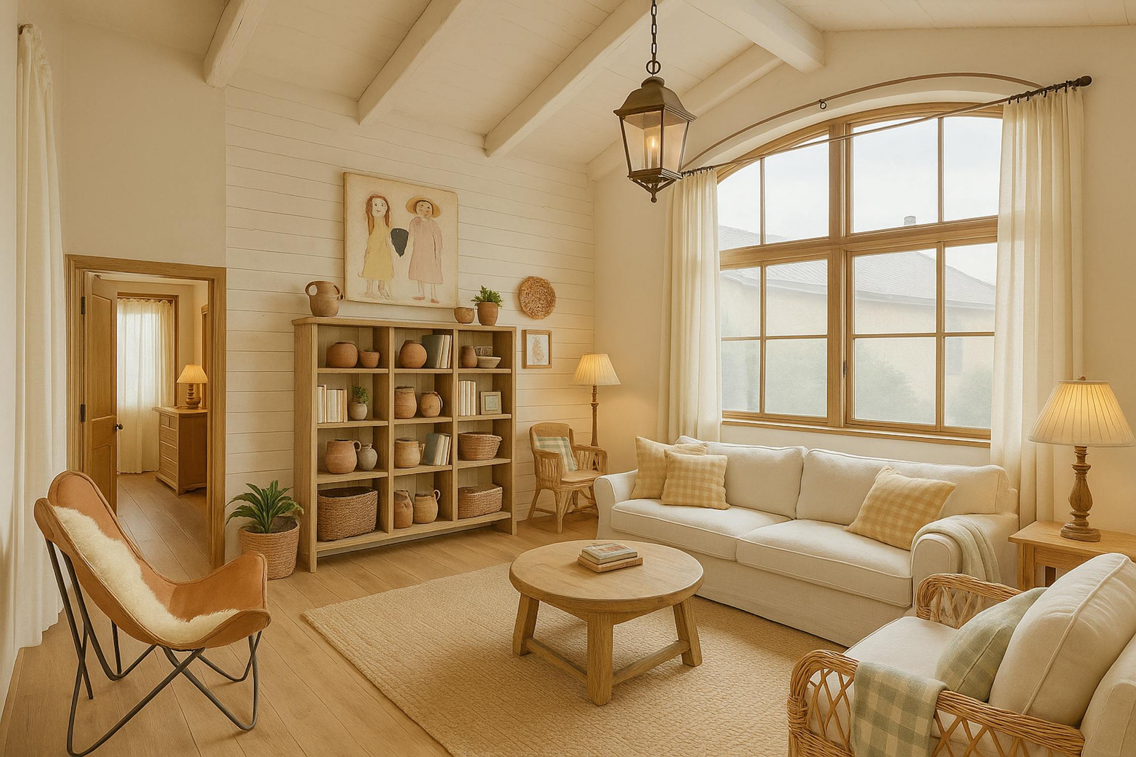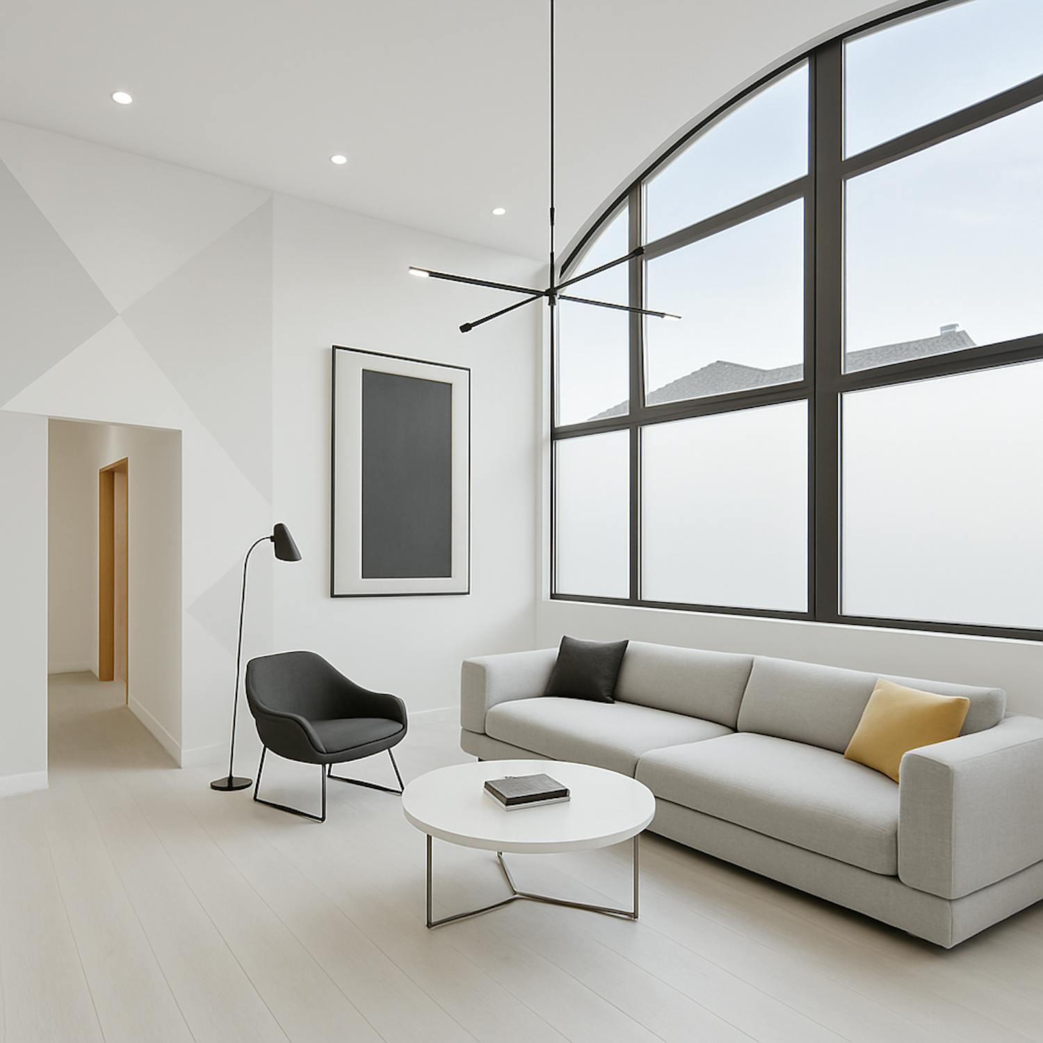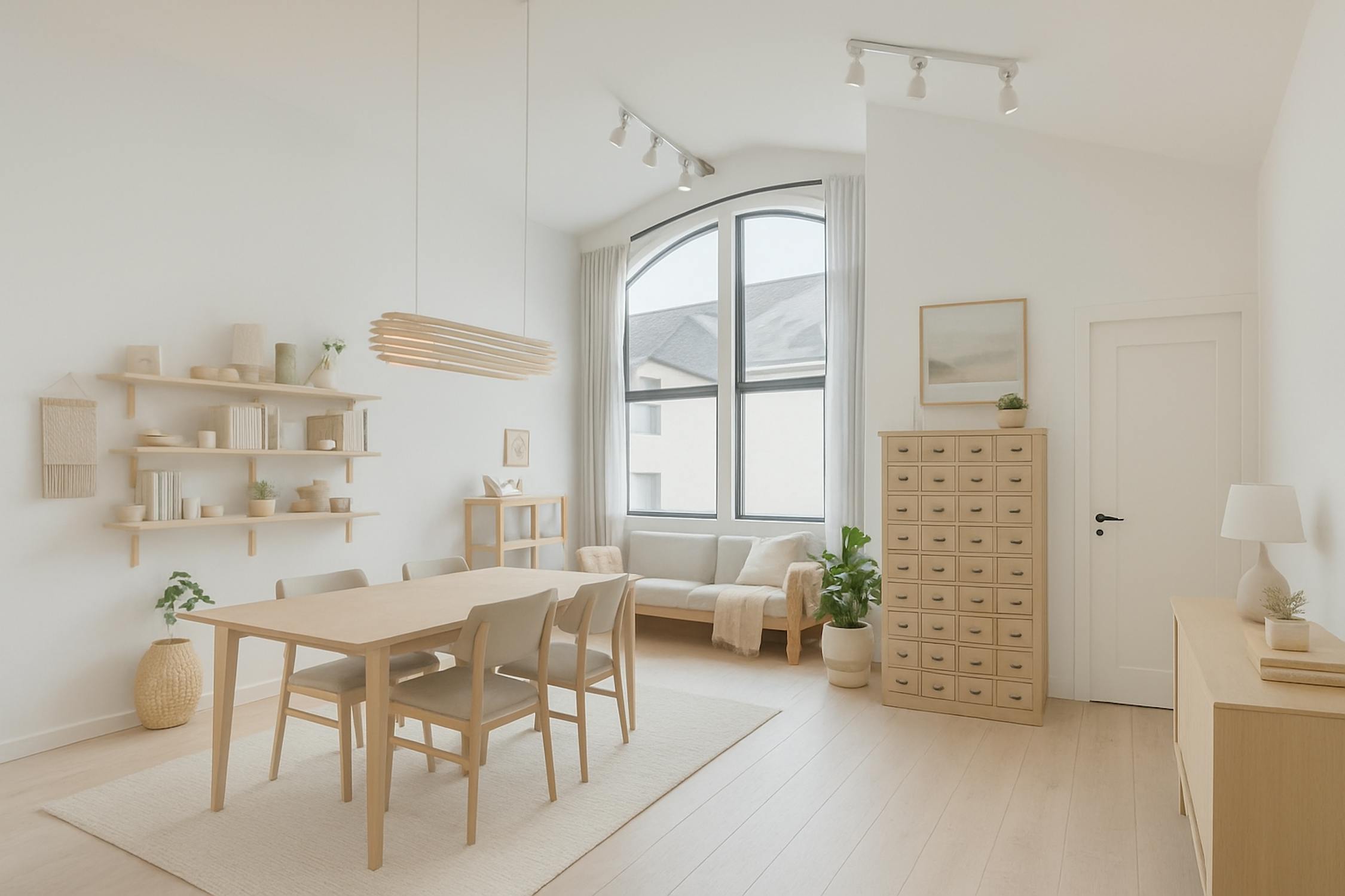 - bright living room with high ceilings and large windows (solar filter)