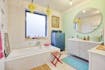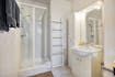 - 2 bathrooms; one with a bath and a single sink and a second with a single sink and shower