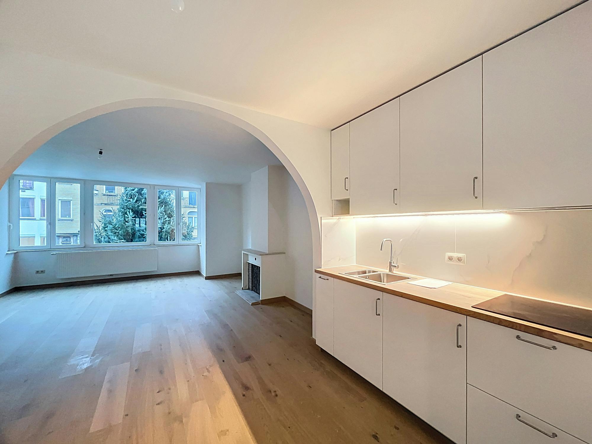 L'espace de vie : Un vaste séjour baigné de lumière offrant une vue agréable sur la verdure. Le sol est recouvert d'un parquet en chêne clair chaleureux. Une arche élégante sépare le salon de la cuisine semi-ouverte, entièrement équipée (taques à induction, nombreux rangements) avec des finitions blanches épurées.