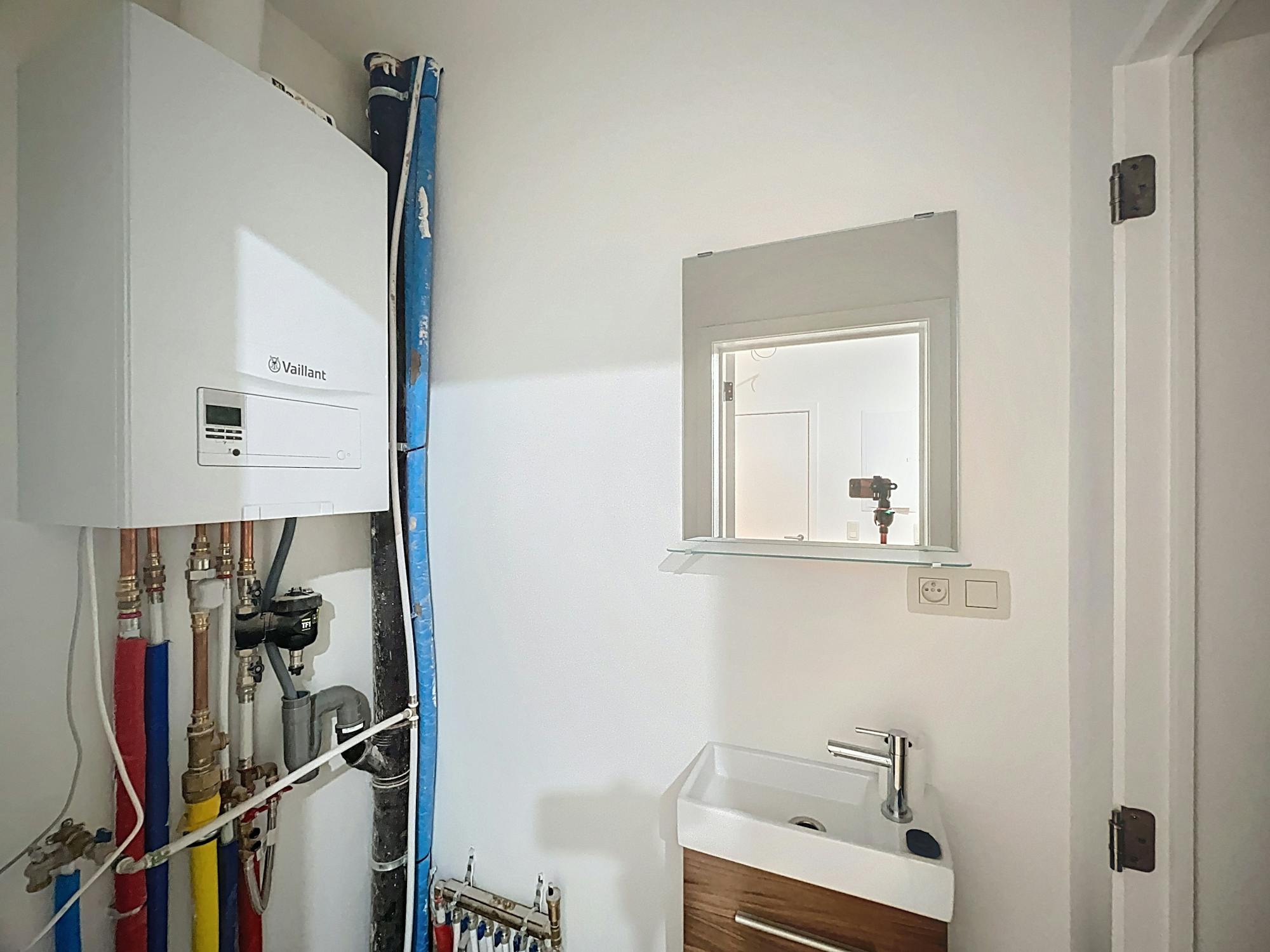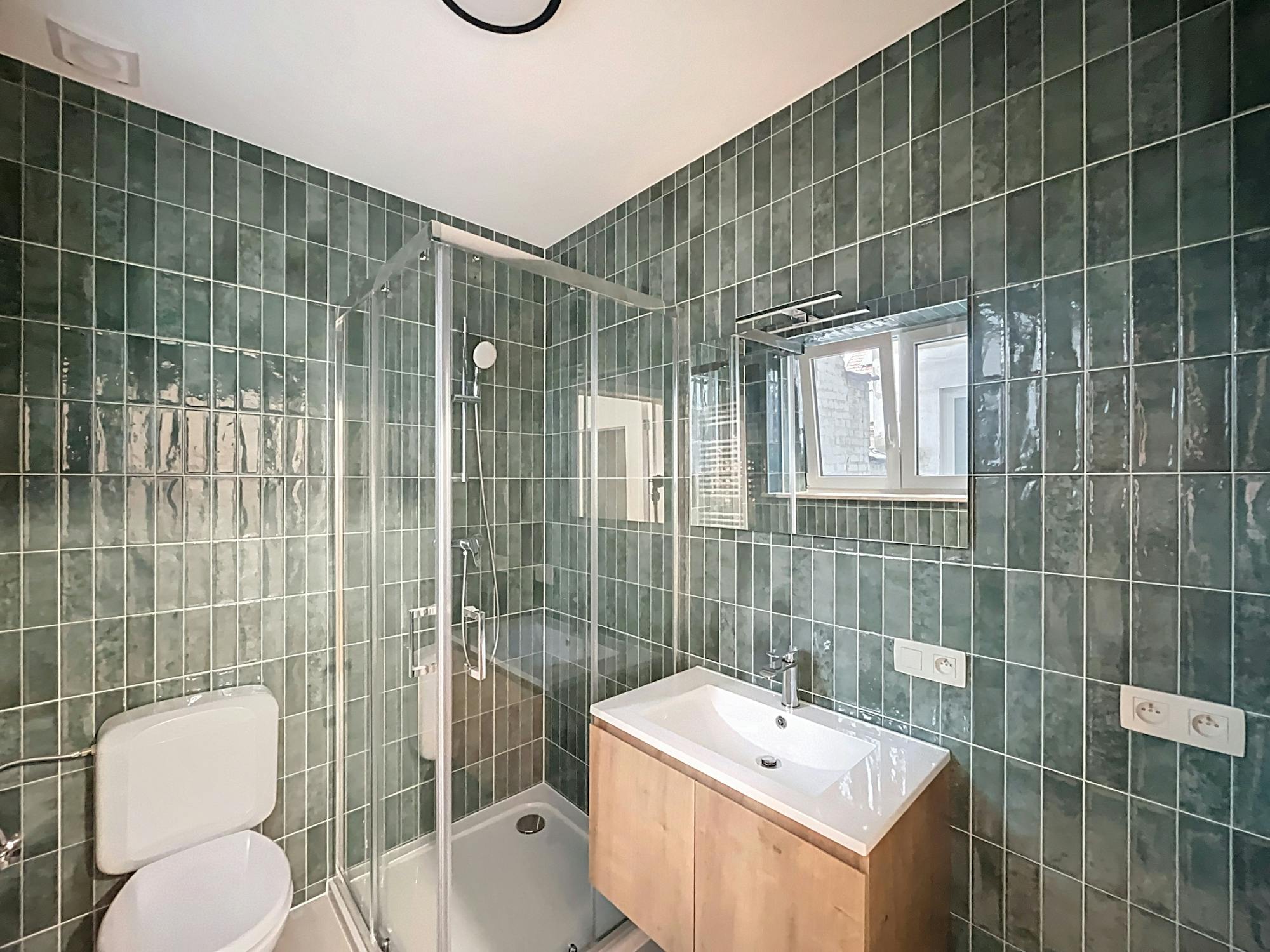 Sanitaires & Technique : Une salle de douche très tendance (carrelage métro vert émeraude, douche vitrée, meuble bois). Un espace toilette/buanderie séparé complète l'ensemble, équipé de la nouvelle chaudière individuelle au gaz (Vaillant). Châssis double vitrage récents partout.
