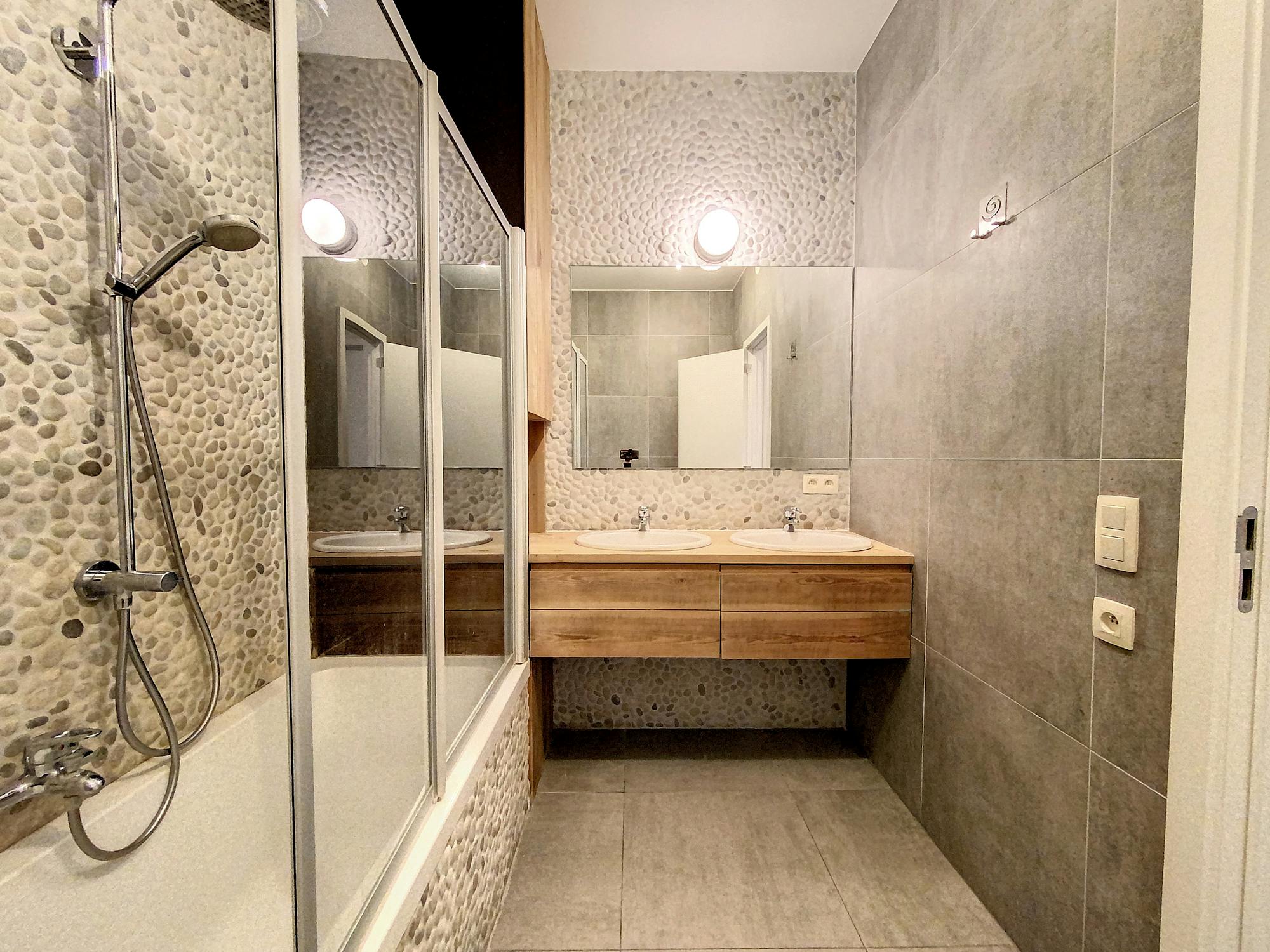 - salle de bain avec double vasque, baignoire et douche