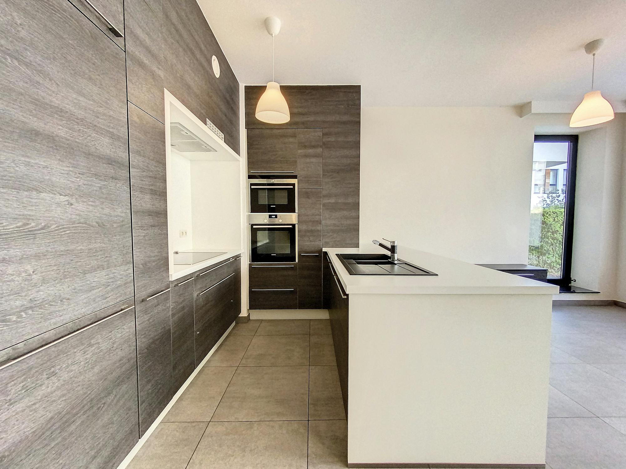 Appartement de deux chambres situé au rez-de-chaussée d'un immeuble récent (2016). L'appartement comprend deux places de parking couvertes et un jardin.