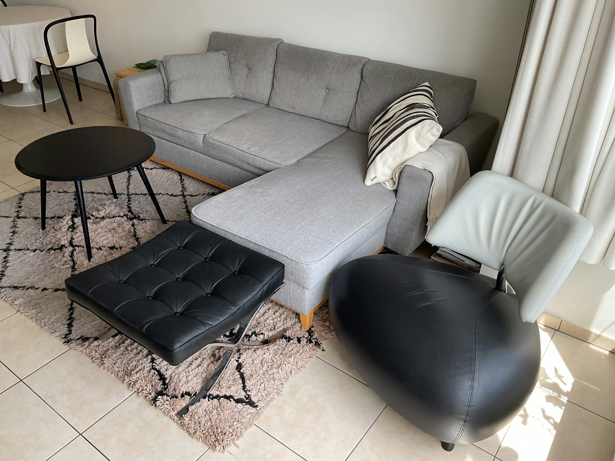 L'appartement est vendu entièrement meublé, y compris une télévision Loewe, un lave-linge Bosch, des chaises design et des sommiers à ressorts.