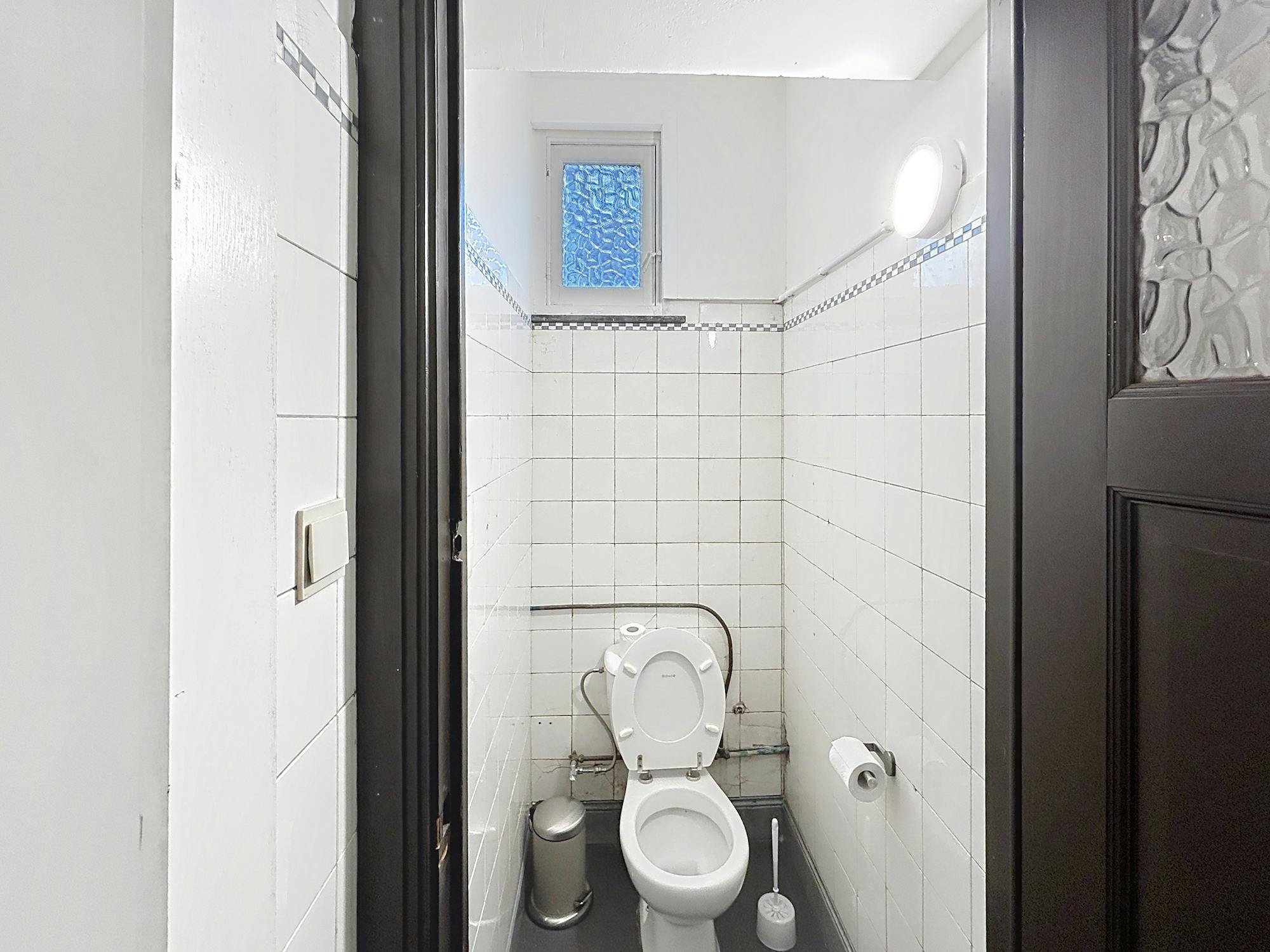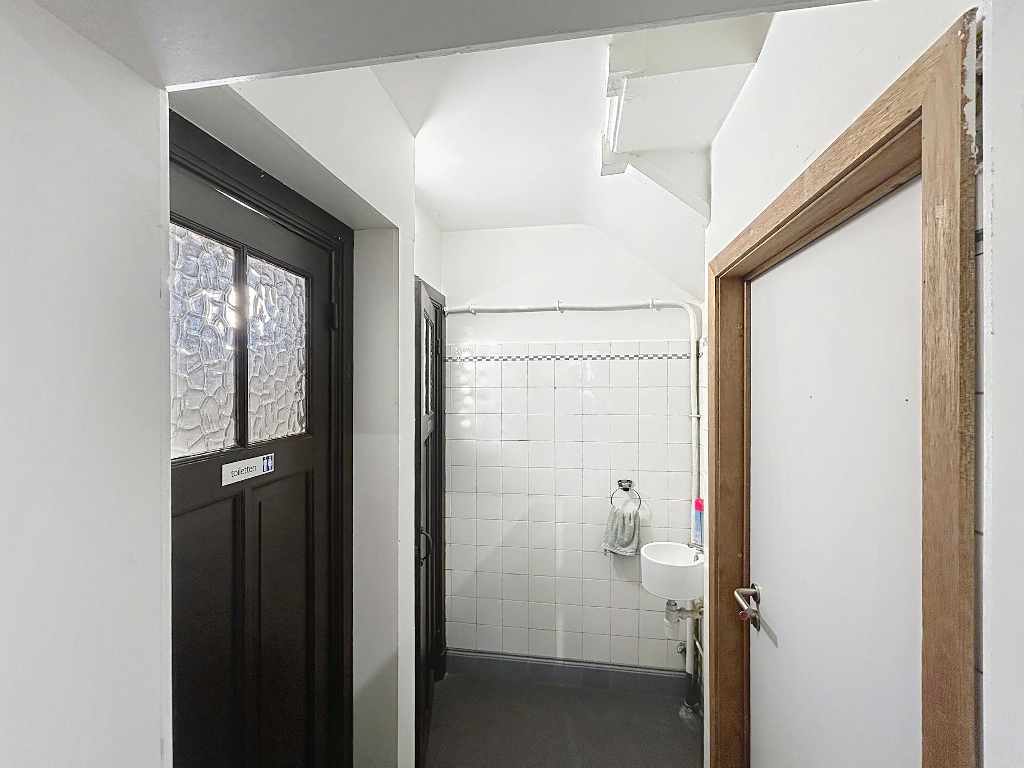 De indeling bestaat uit een kantoor- of winkelgedeelte, een afzonderlijke kitchenette en een sanitaire ruimte met twee toiletten. De structuur van het pand laat toe om de ruimte op een praktische en efficiënte manier in te richten.