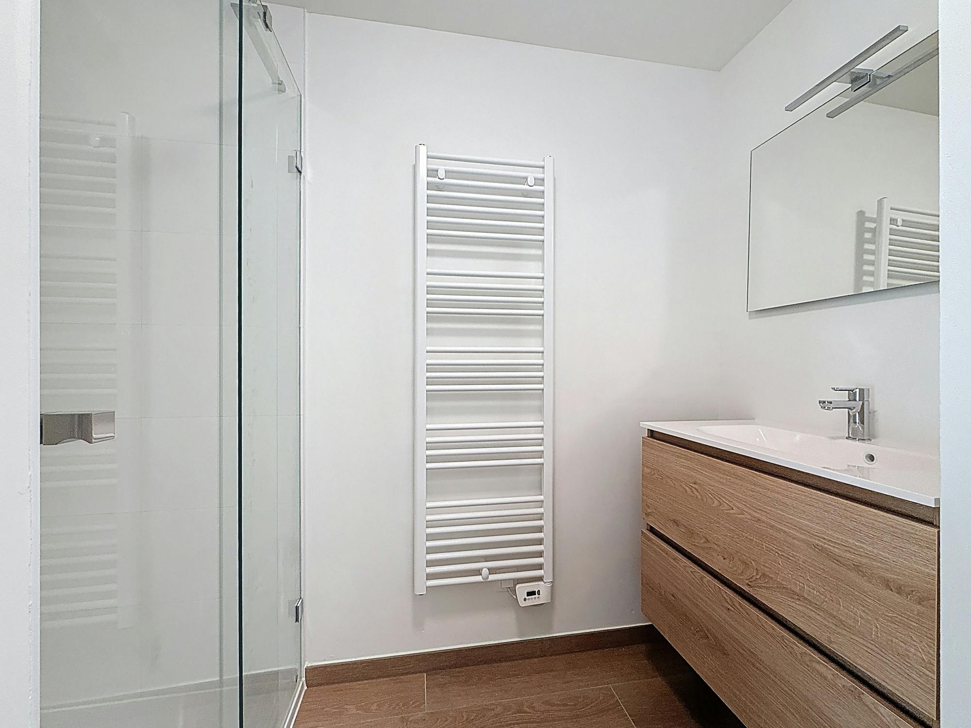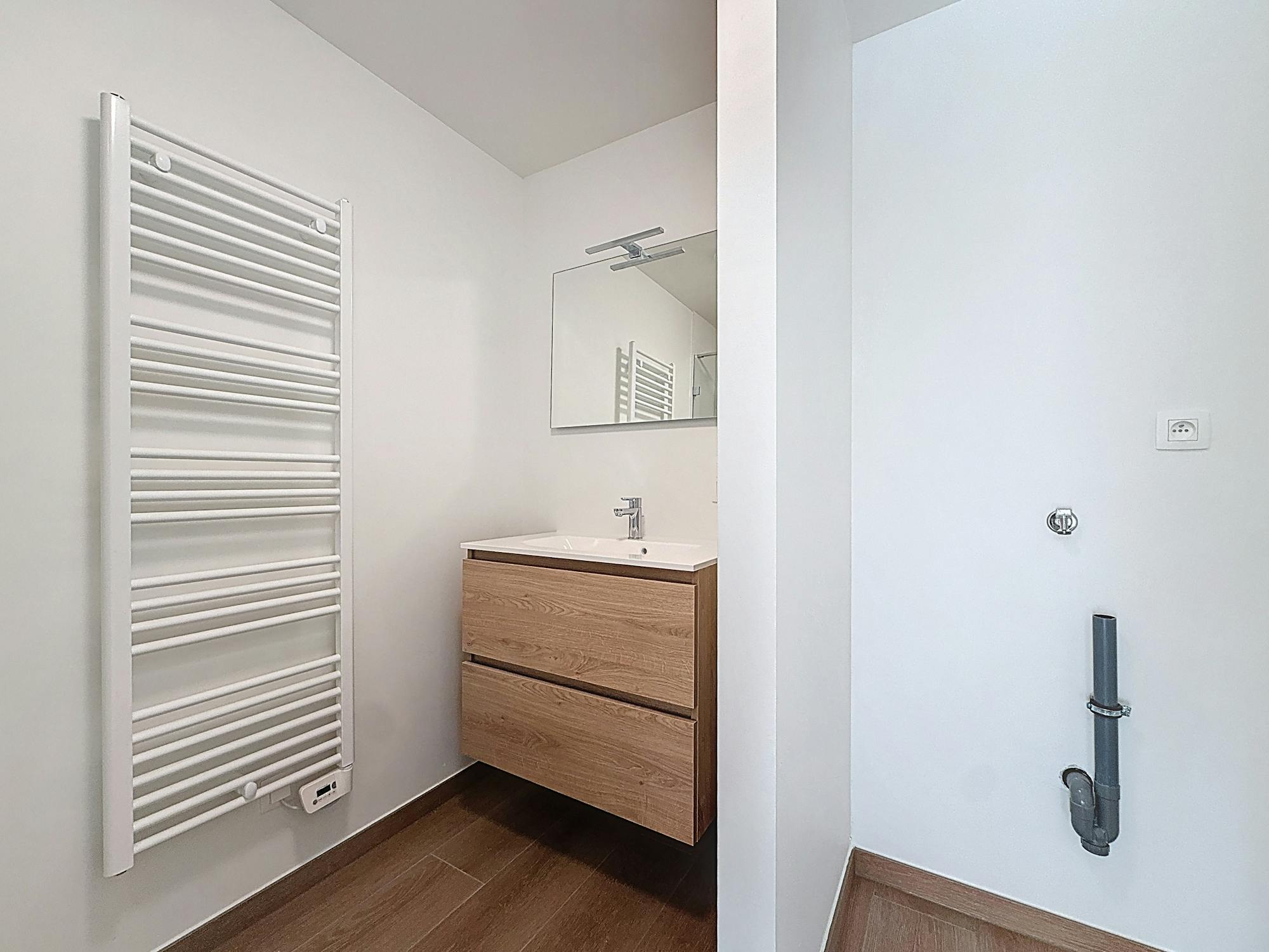 - badkamer met lavabo, handdoekdroger en inloopdouche. Er is een aparte hoek voorzien voor wasmachine en droogkast
