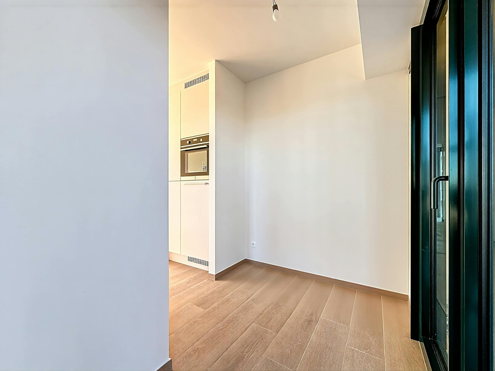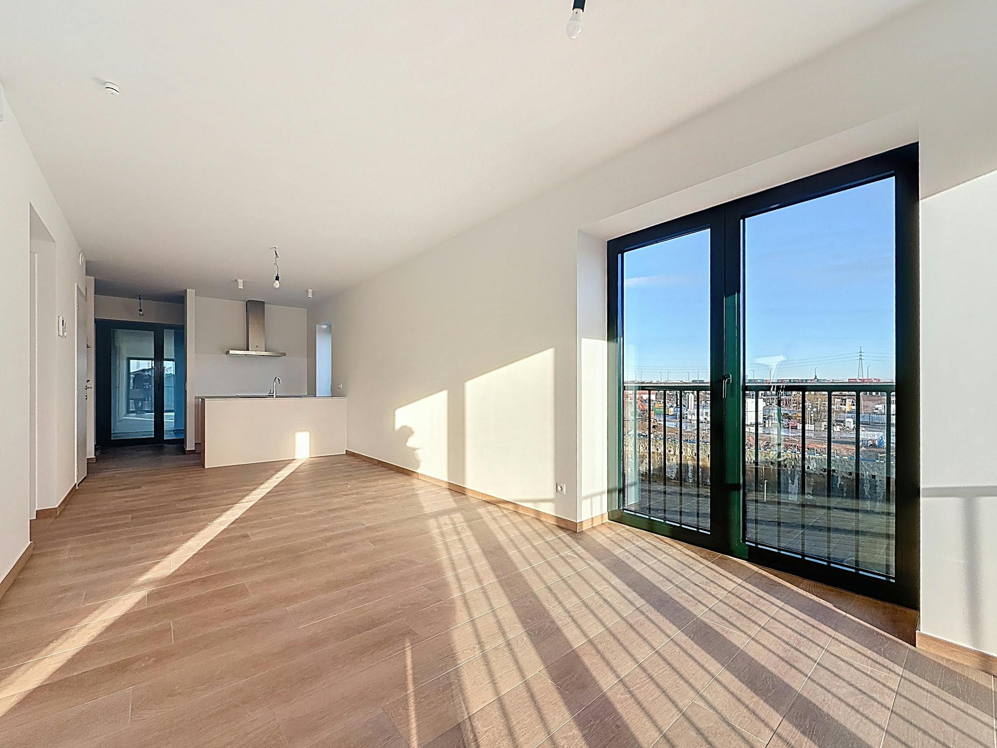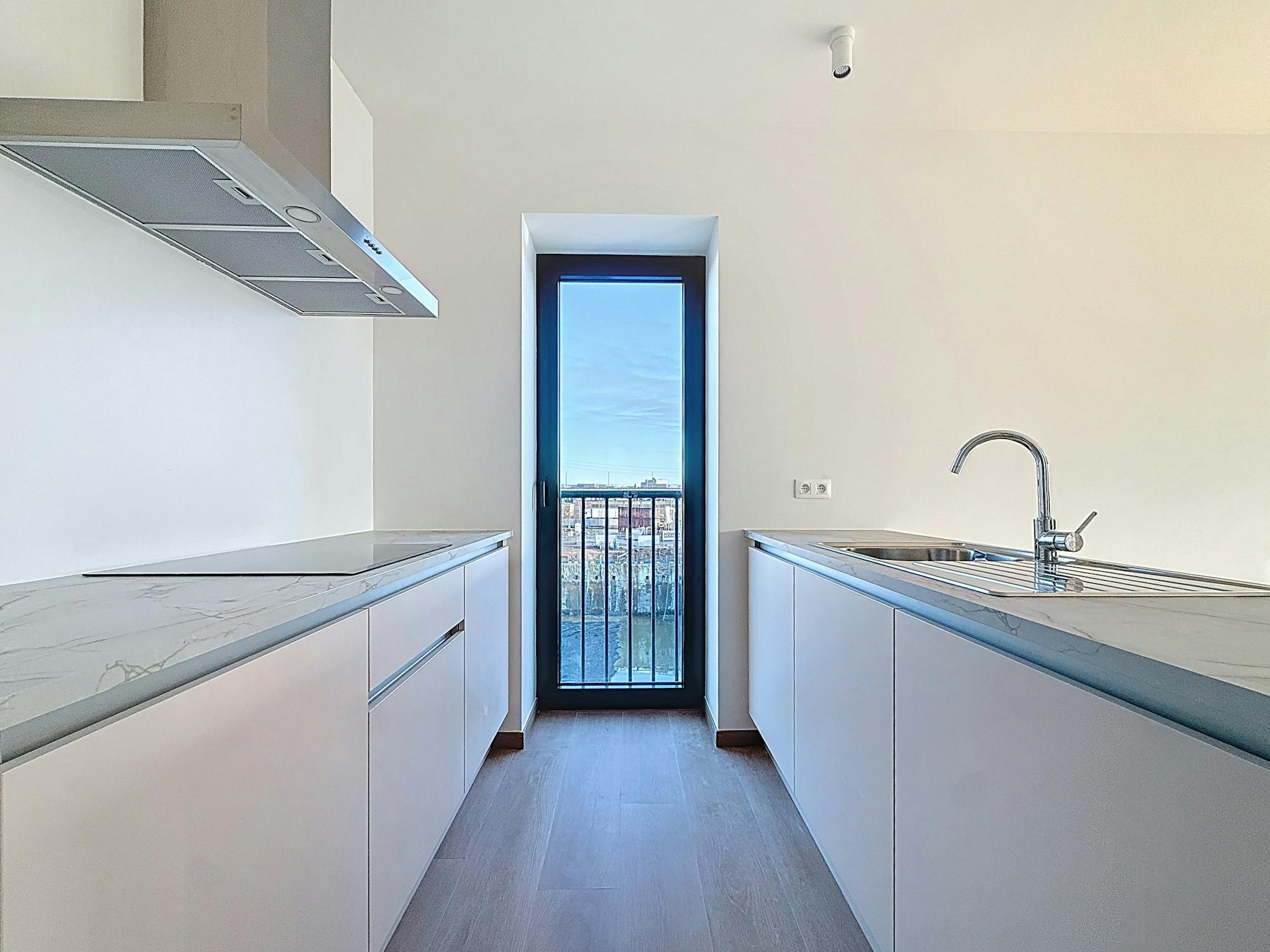 - leefruimte met open keuken. Via een flexibele ramenwand die volledig te openen is, sluit de leefruimte rechtstreeks aan op het balkon. Echt uniek!