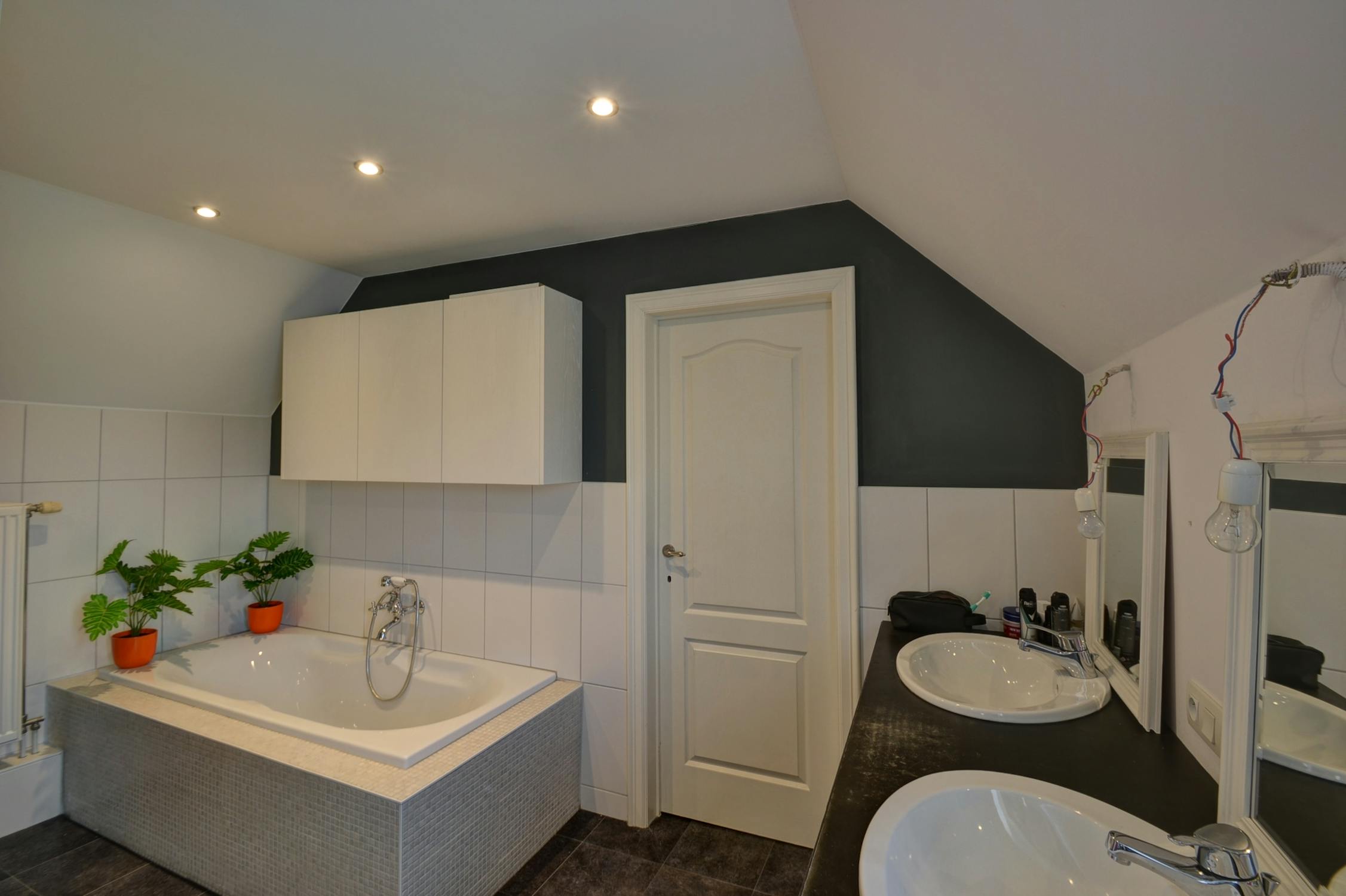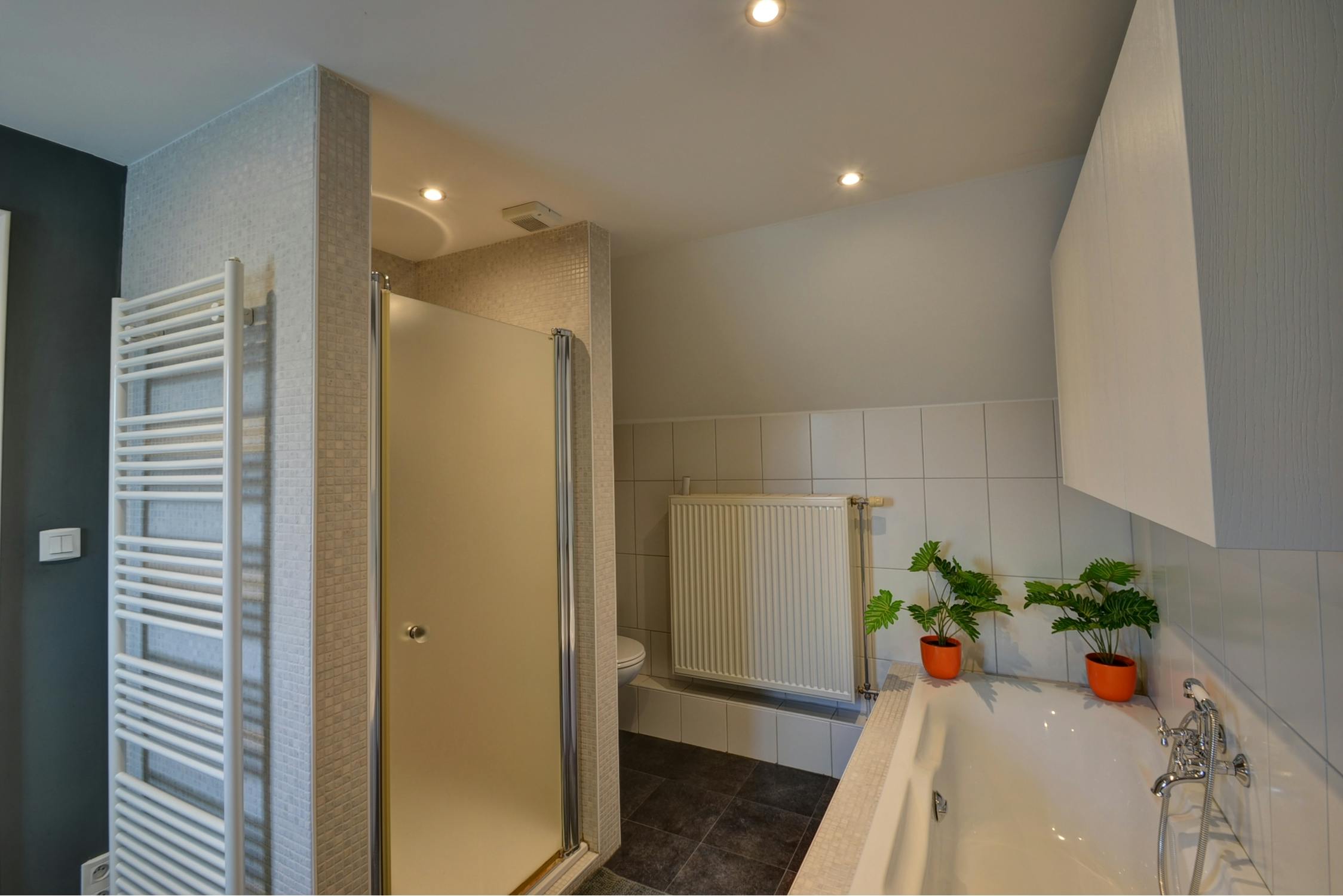 - badkamer met douche, ligbad, dubbele wastafel met meubel en toilet