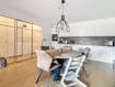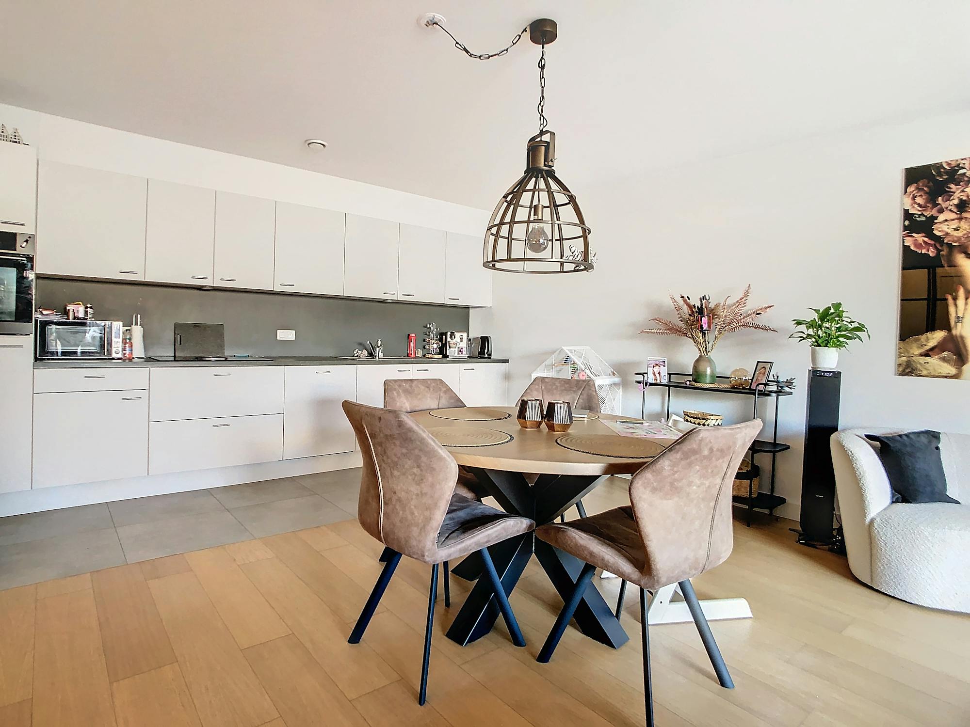 - ruime leefruimte met open keuken (ca. 40m²) op tegelvloer. Keuken voorzien van koelkast, dubbele spoelbak, oven, keramisch kookvuur met geïntegreerde dampkap en voldoende bergruimte