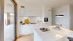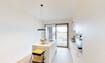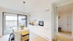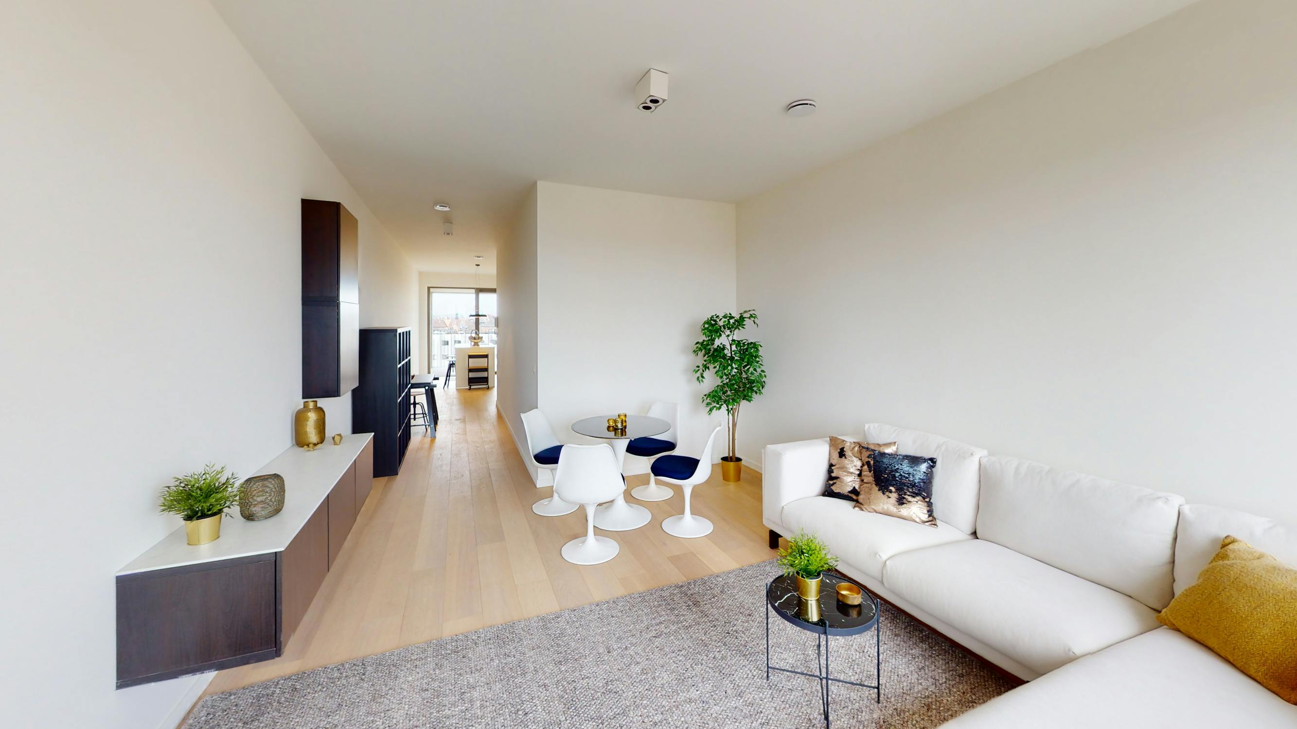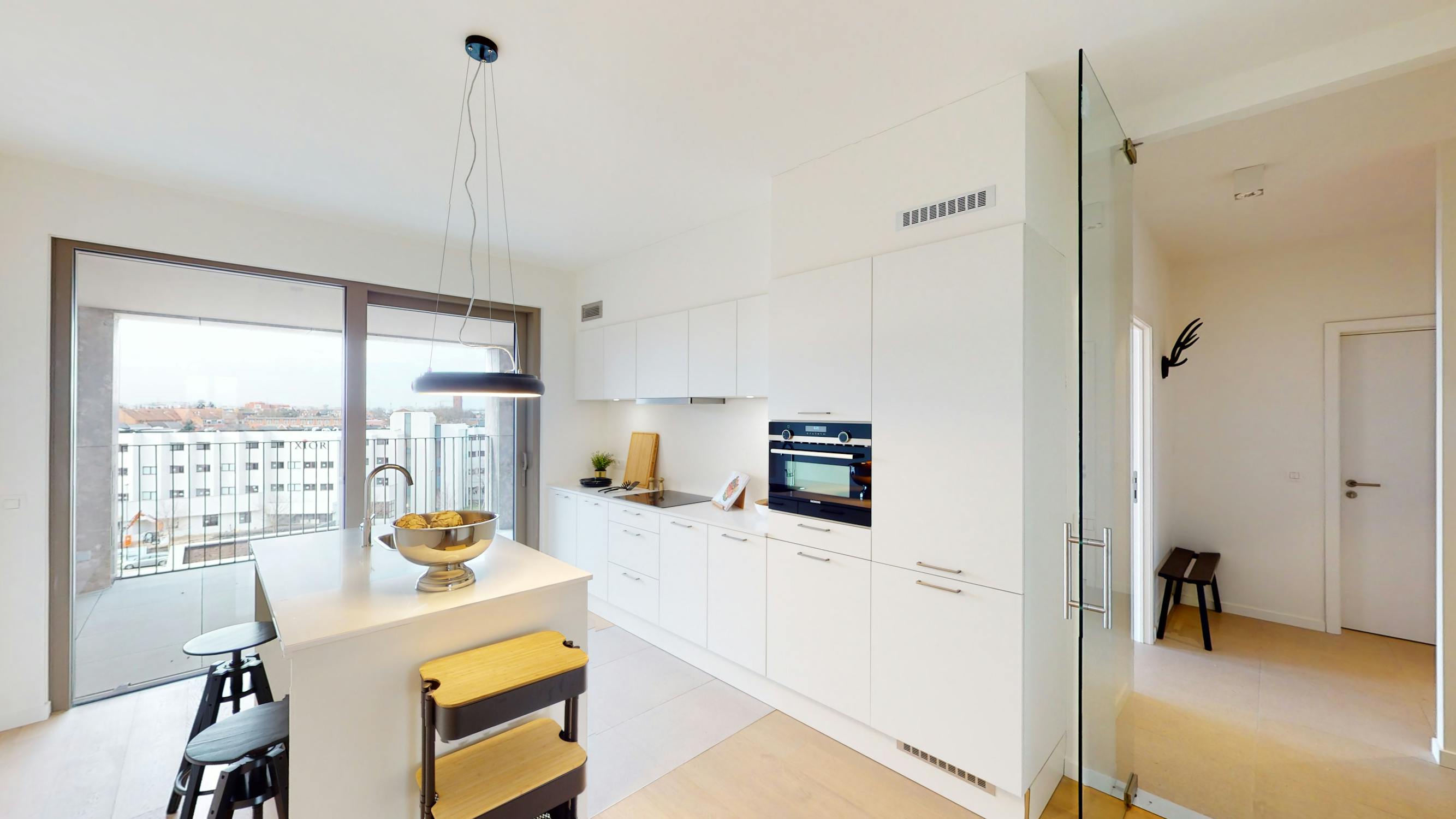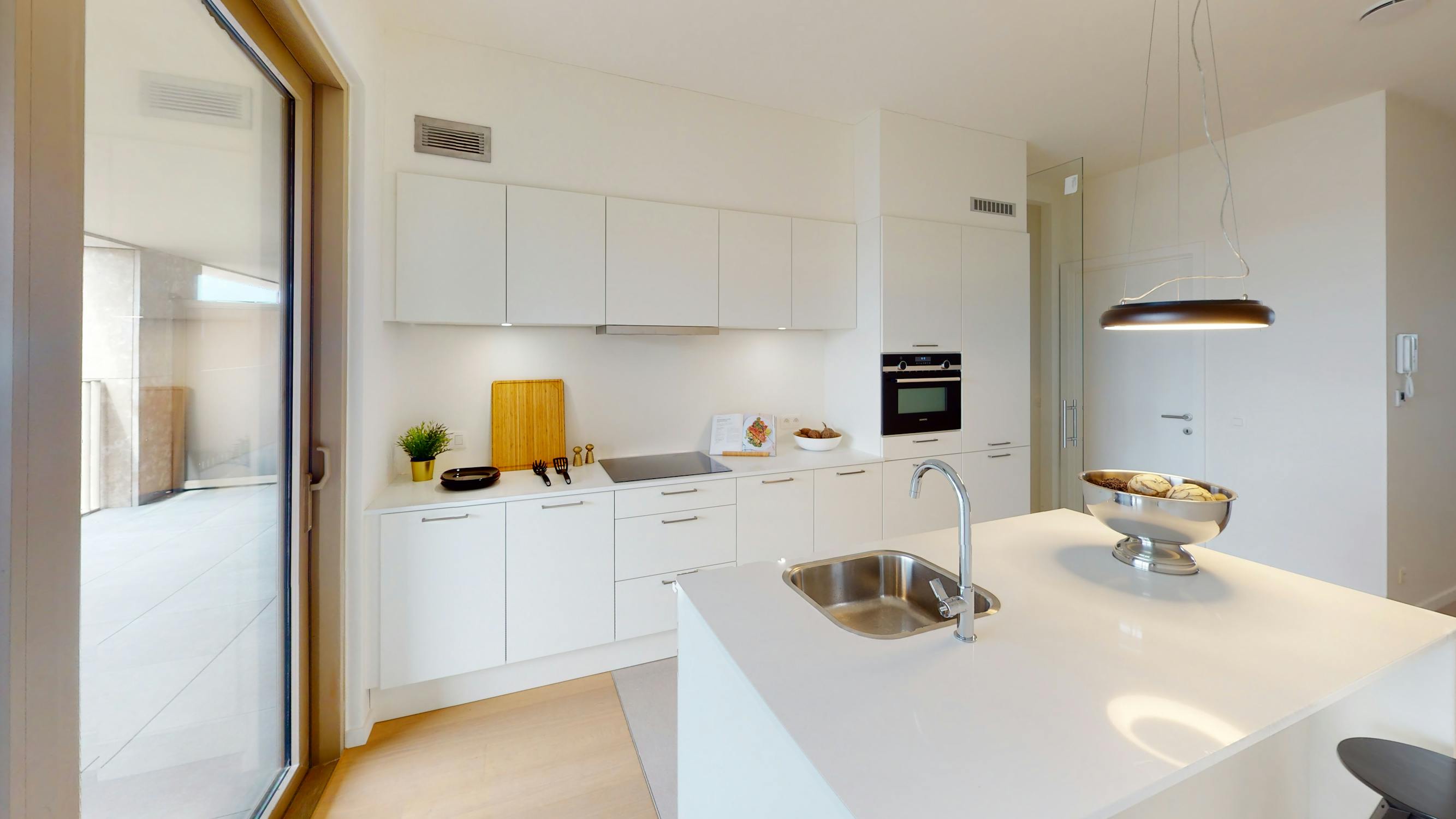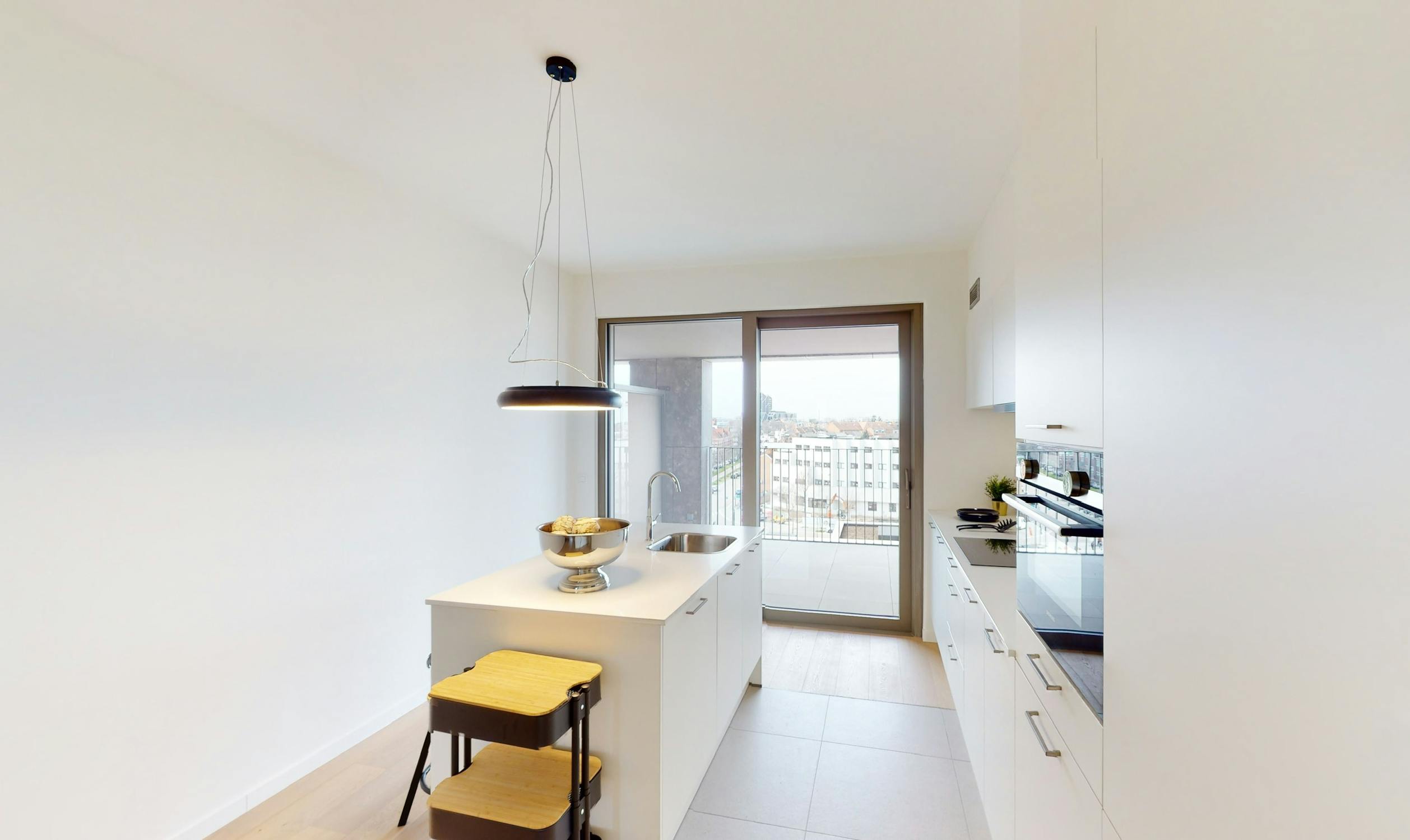 Bij het binnenkomen valt meteen de lichte en open leefruimte op, dankzij de grote raampartijen die zowel uitgeven op het terras als op de winkelboulevard. De moderne open keuken, volledig uitgerust met kwalitatieve inbouwtoestellen, vormt het hart van het appartement en sluit mooi aan op de woonkamer.