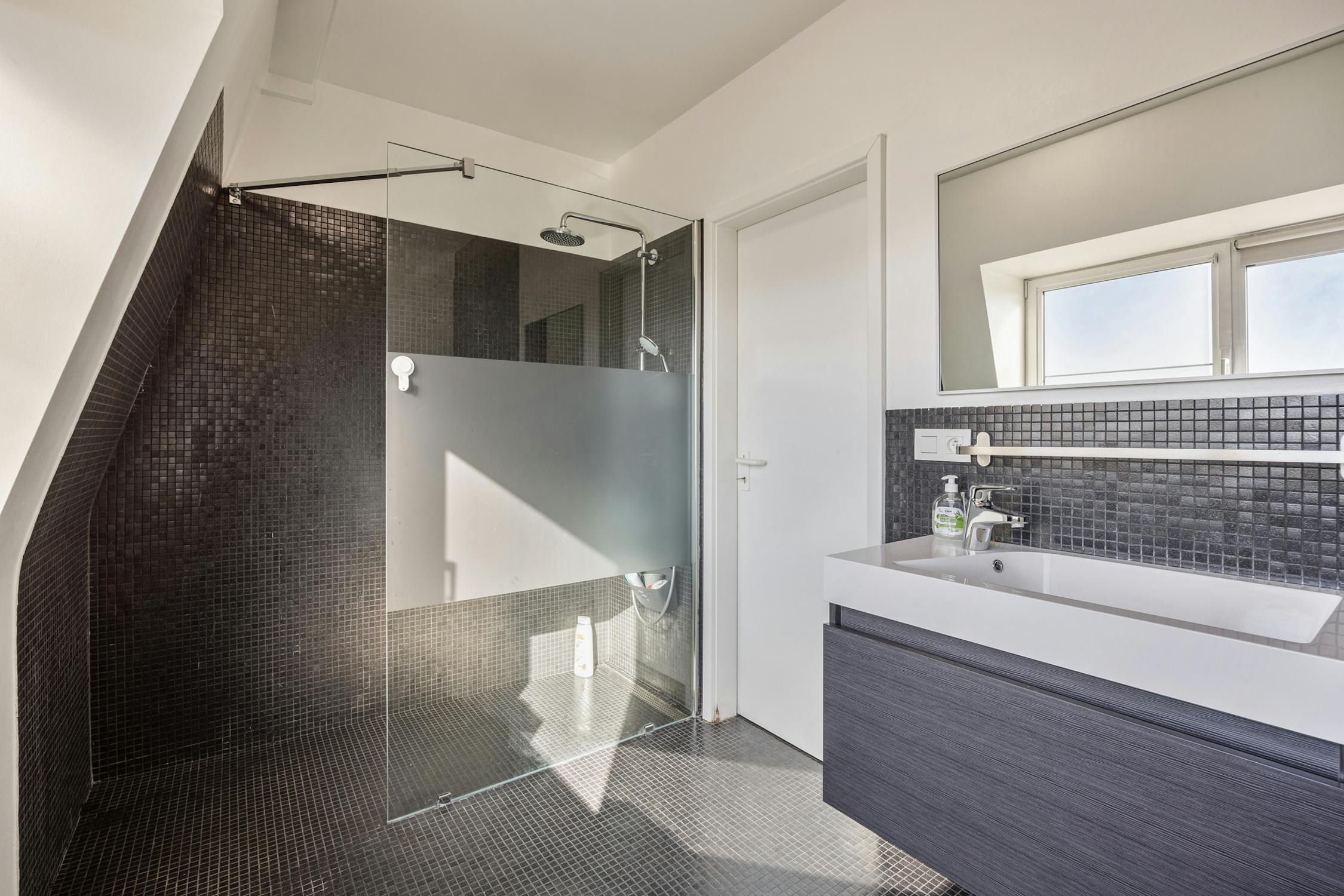 - moderne badkamer met toilet, wastafel en een inloopdouche