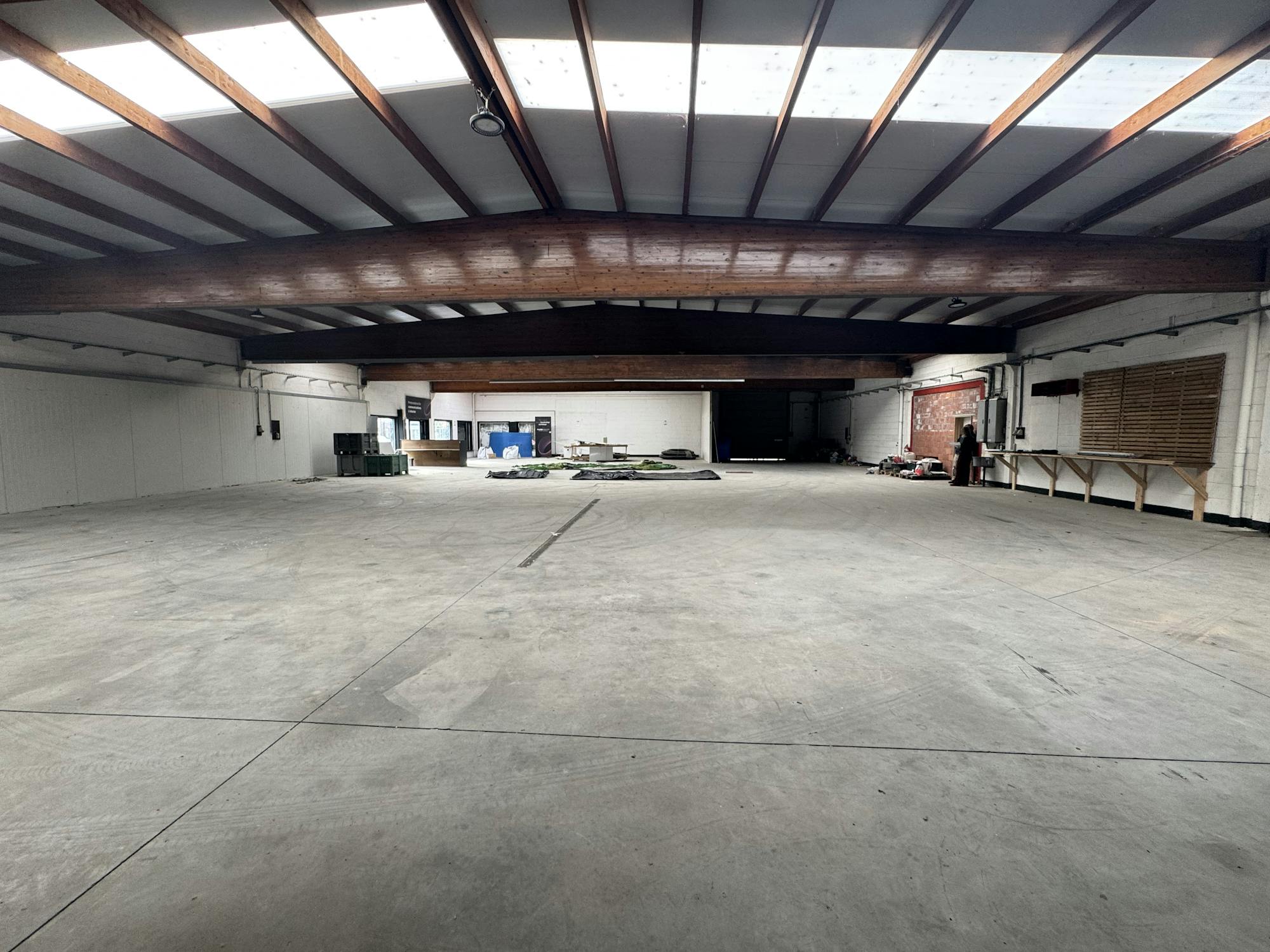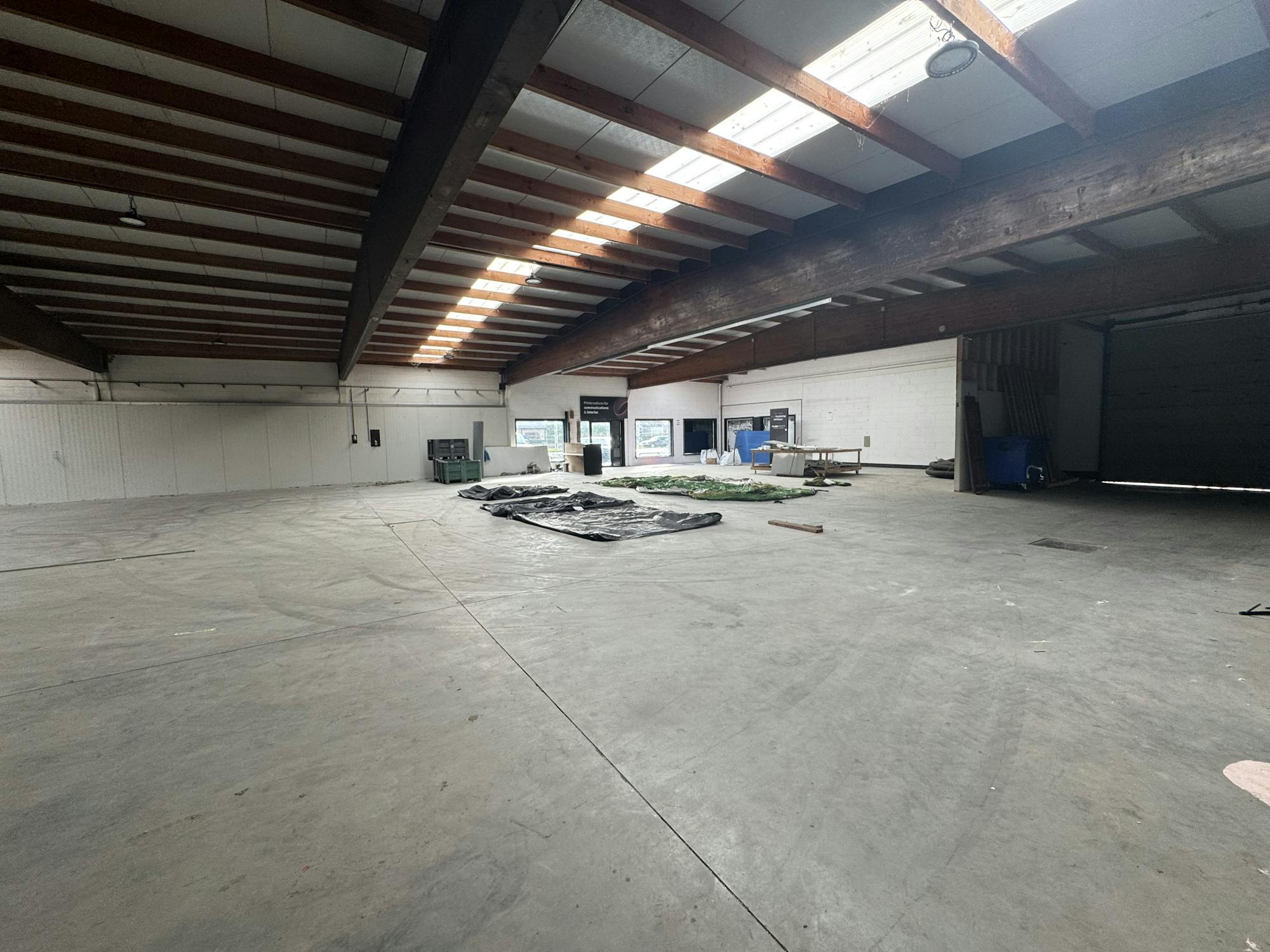 Loods te huur (700 m²): 3,6 m vrije hoogte en grote rolpoort (3,5 m x 4 m). Voorzien van sanitaire voorzieningen en 5 parkeerplaatsen. Vaste kosten van € 100/maand voor water en elektriciteit.