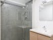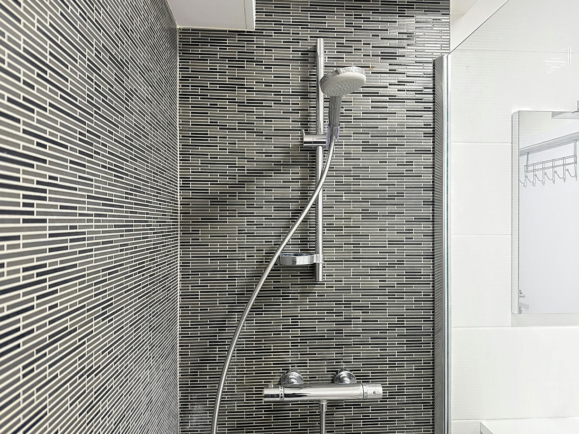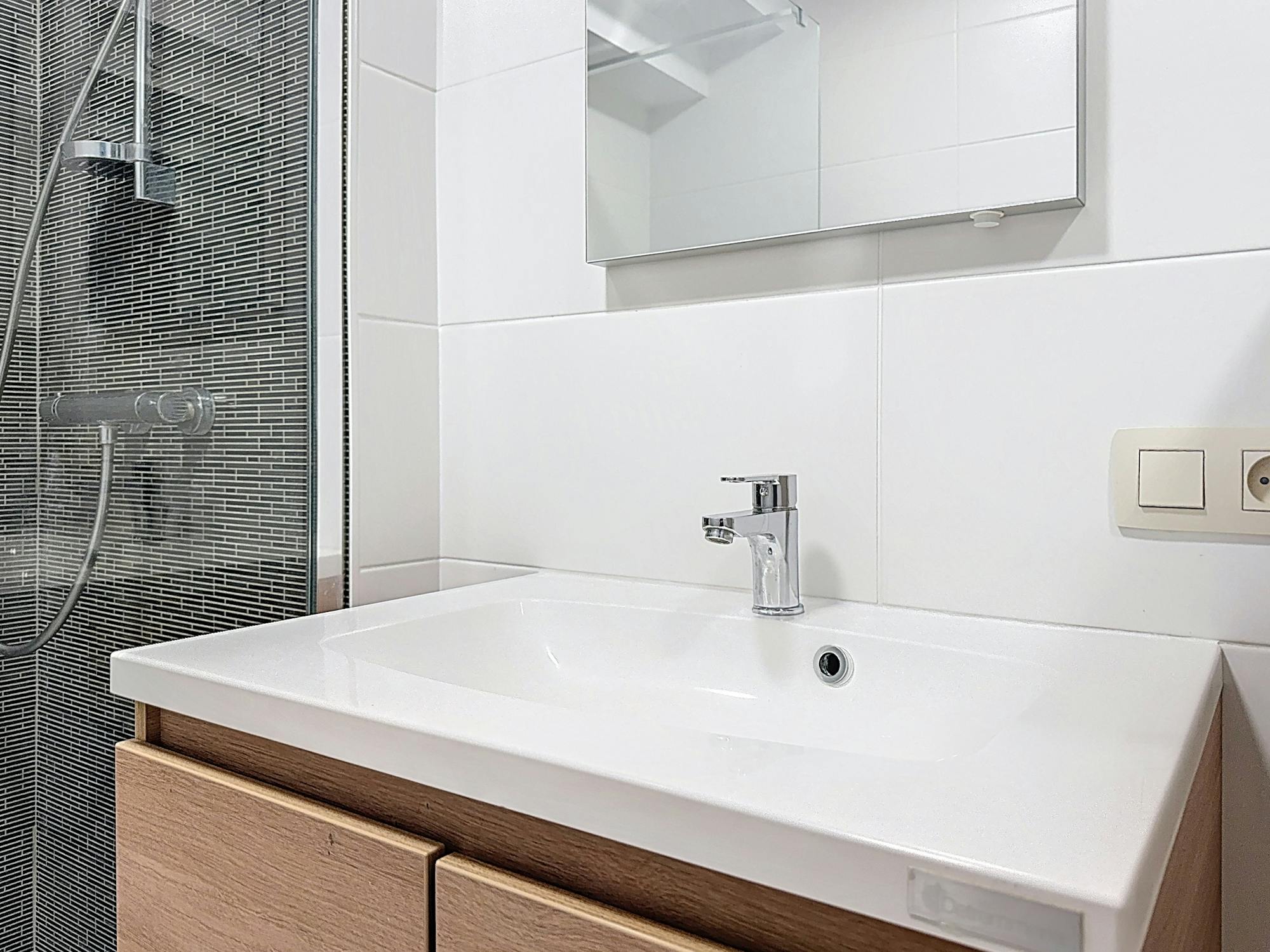 *badkamer met een inloopdouche en badkamermeubel.