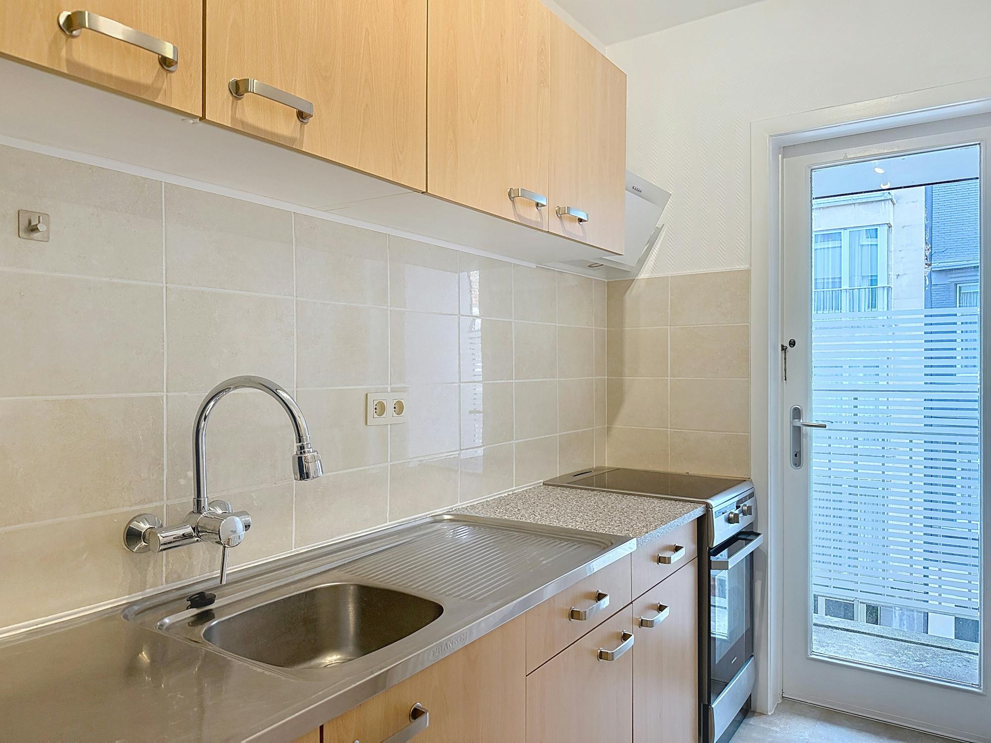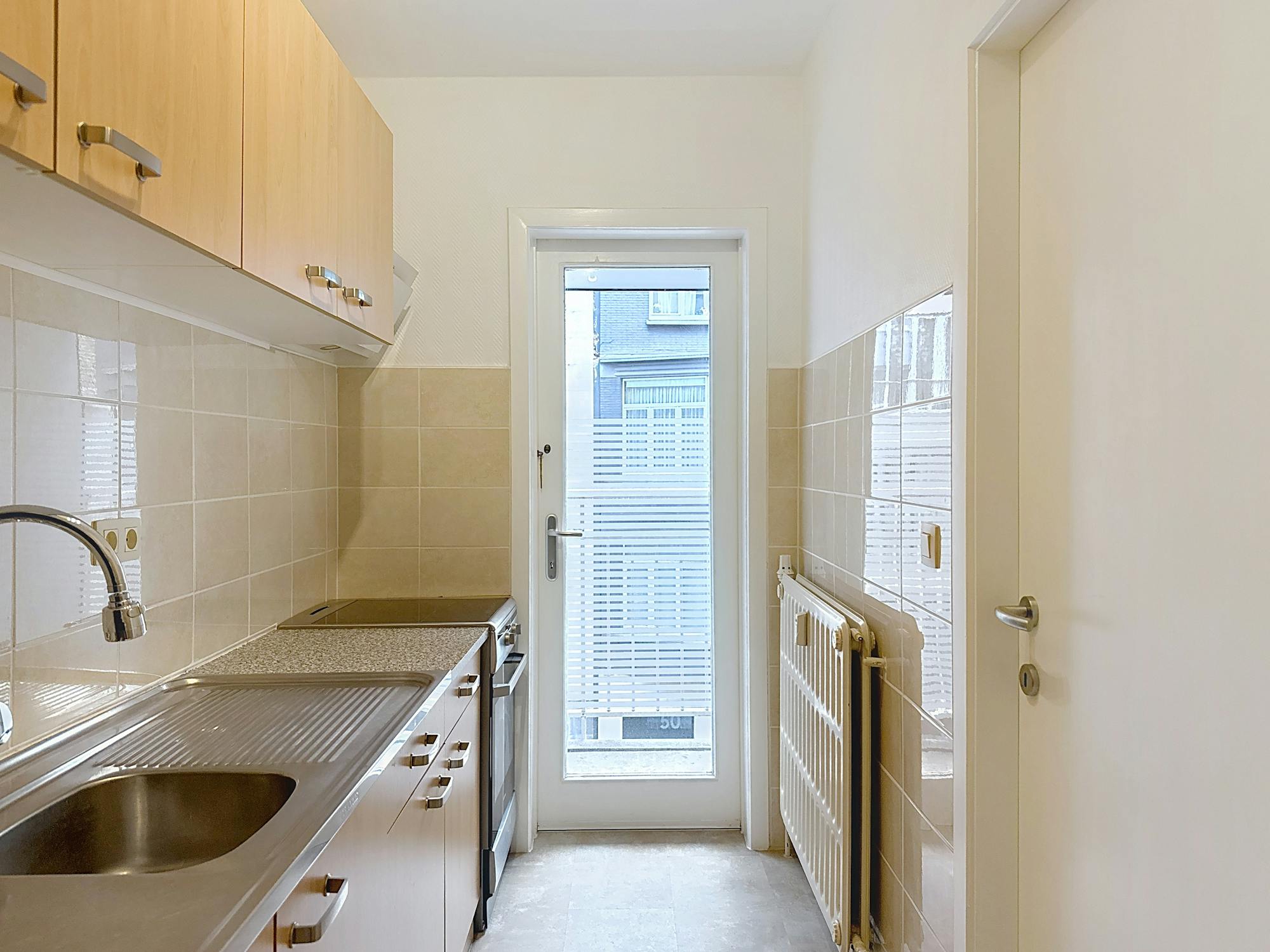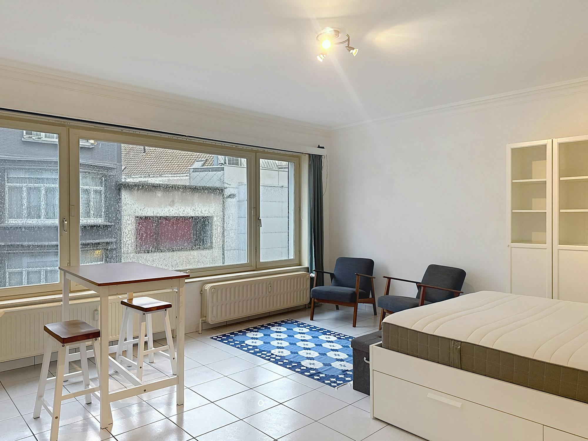 De studio geniet van veel natuurlijke lichtinval. Mogelijkheid tot overname van meubels, ideaal voor wie een tweedeverblijf zoekt in een rustig gebouw in het centrum.