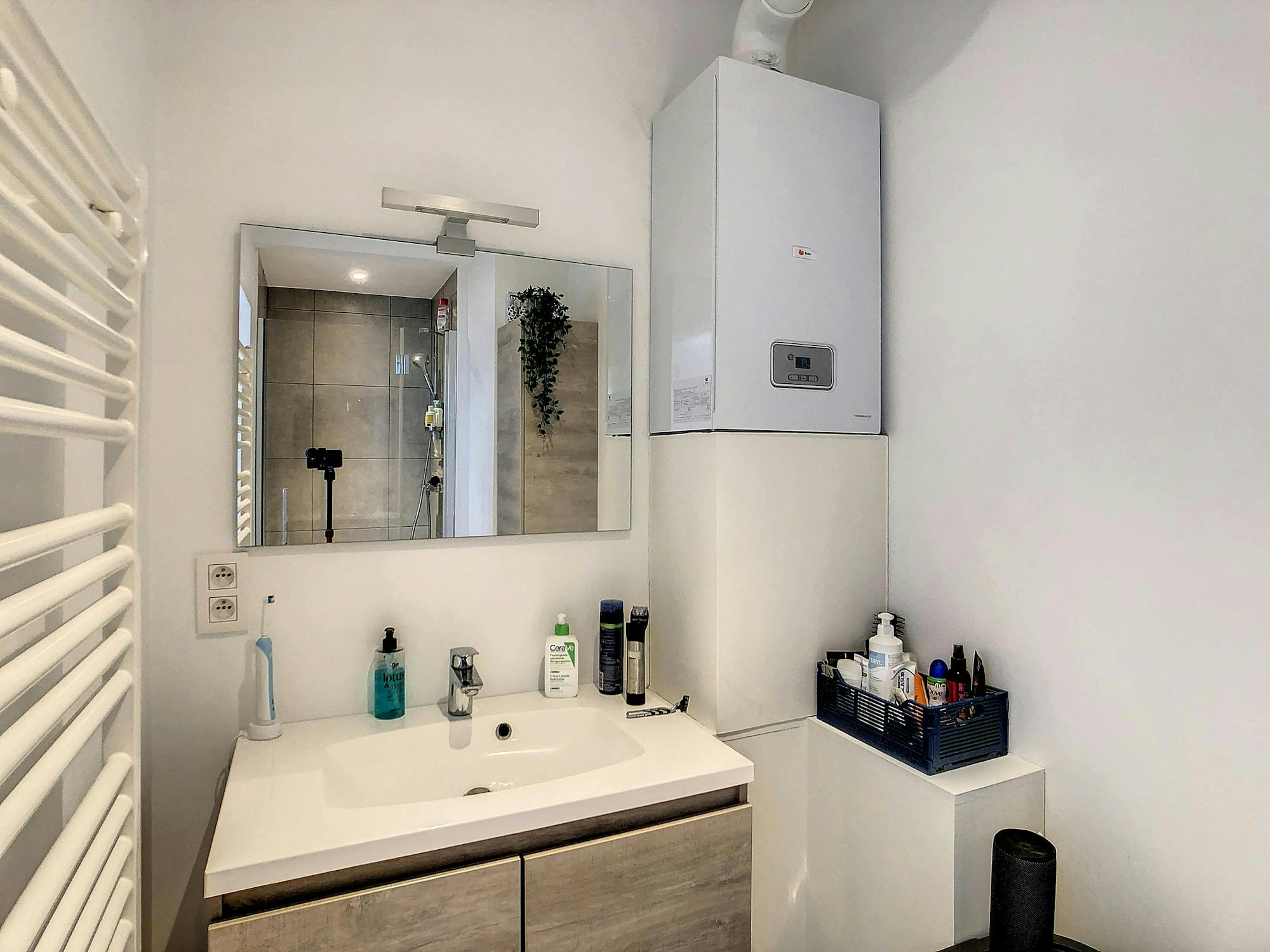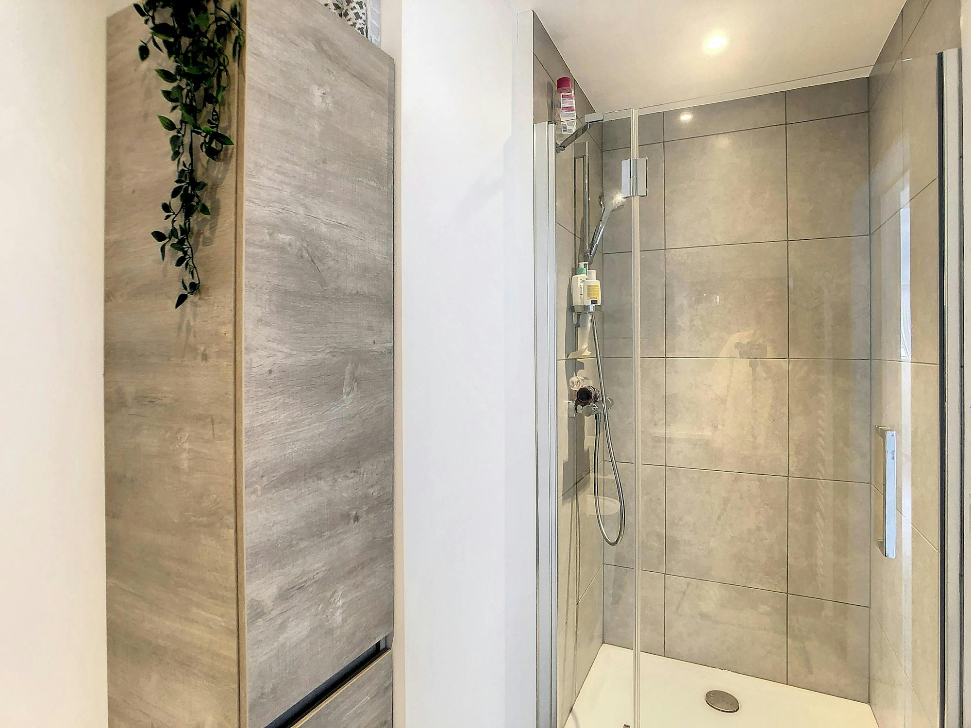 - badkamer met lavabomeubel, douche