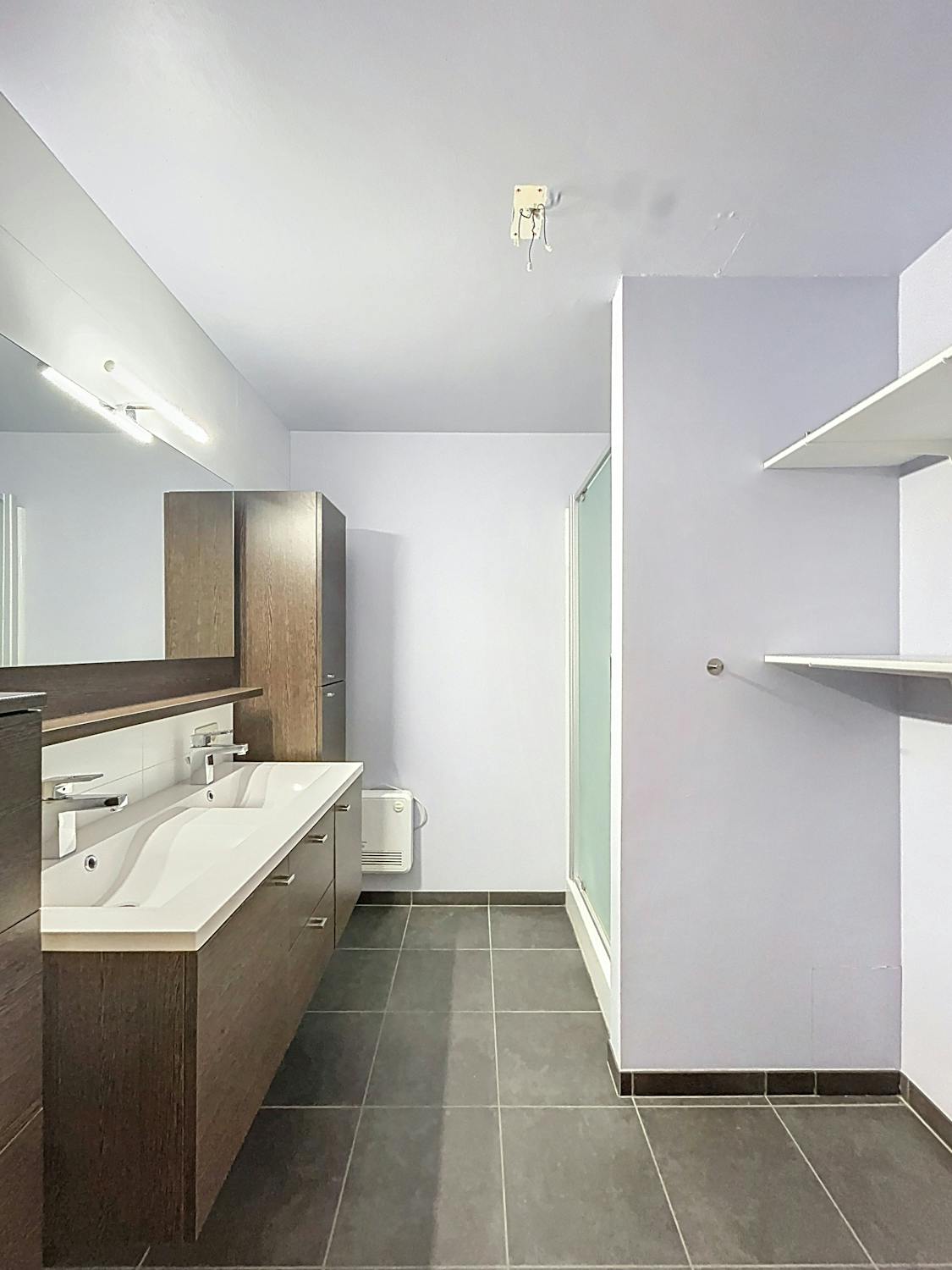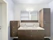 - ingerichte badkamer met lavabomeubel en douche