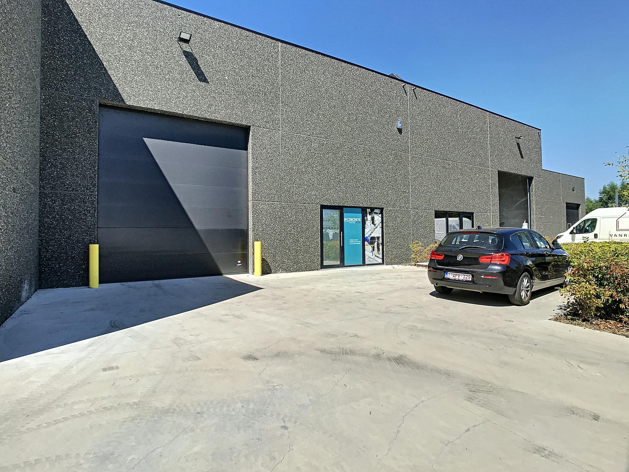 Magazijn van 292 m² te huur in Zwevegem, nabij invalswegen en autosnelweg. Polybeton, vrije hoogte 6,20 m, lichtstraat, elektrische sectionaalpoort en voorliggende parking.