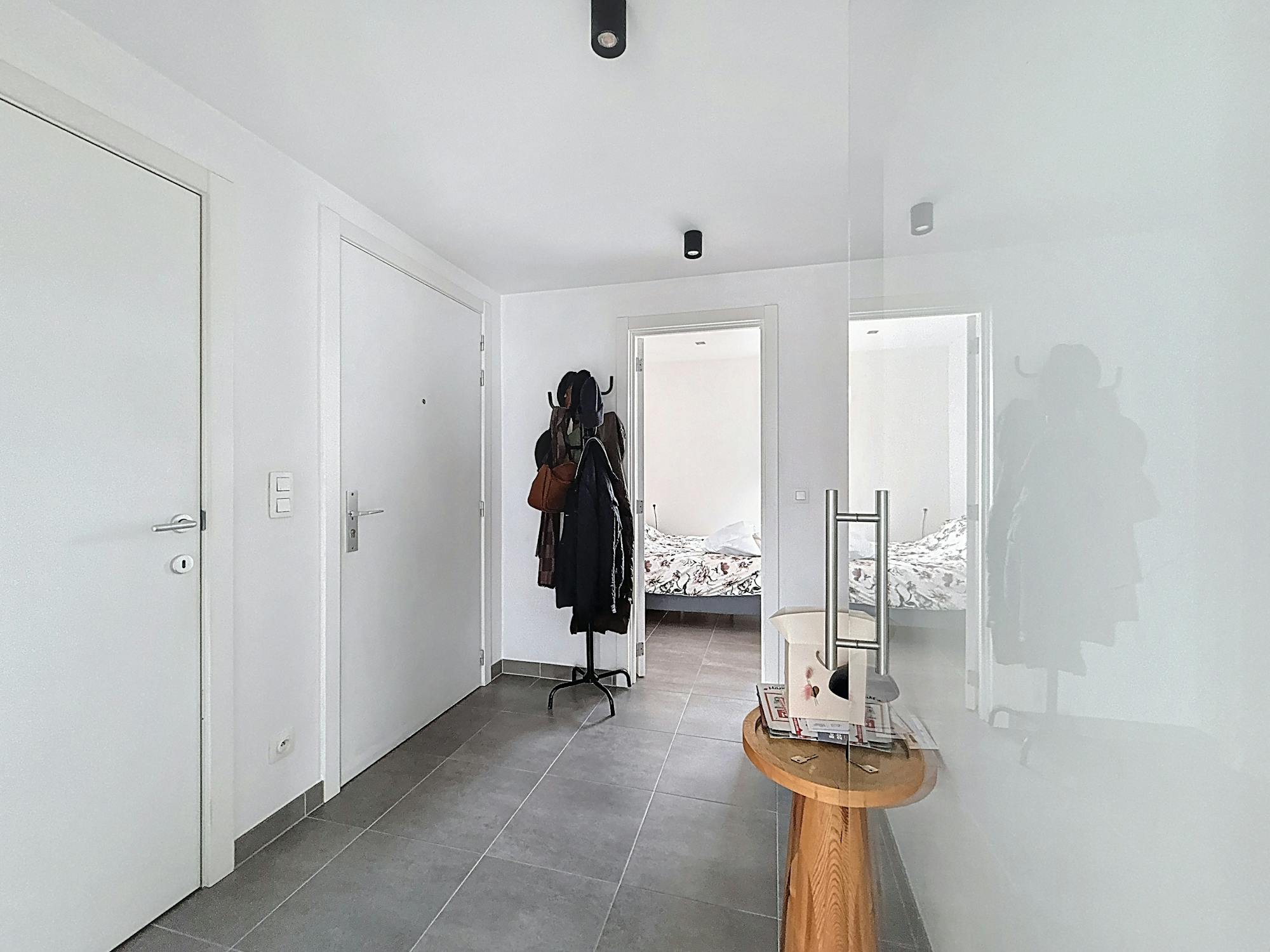 inkomhal - slaapkamer 1 - slaapkamer 2 - badkamer met inloopdouche en badkamermeubel - apart toilet - leefruimte met open keuken (vaatwas, dubbele spoelbak, kookplaat, dampkap, oven en koelkast inbegrepen) - berging - terras van 16 m²