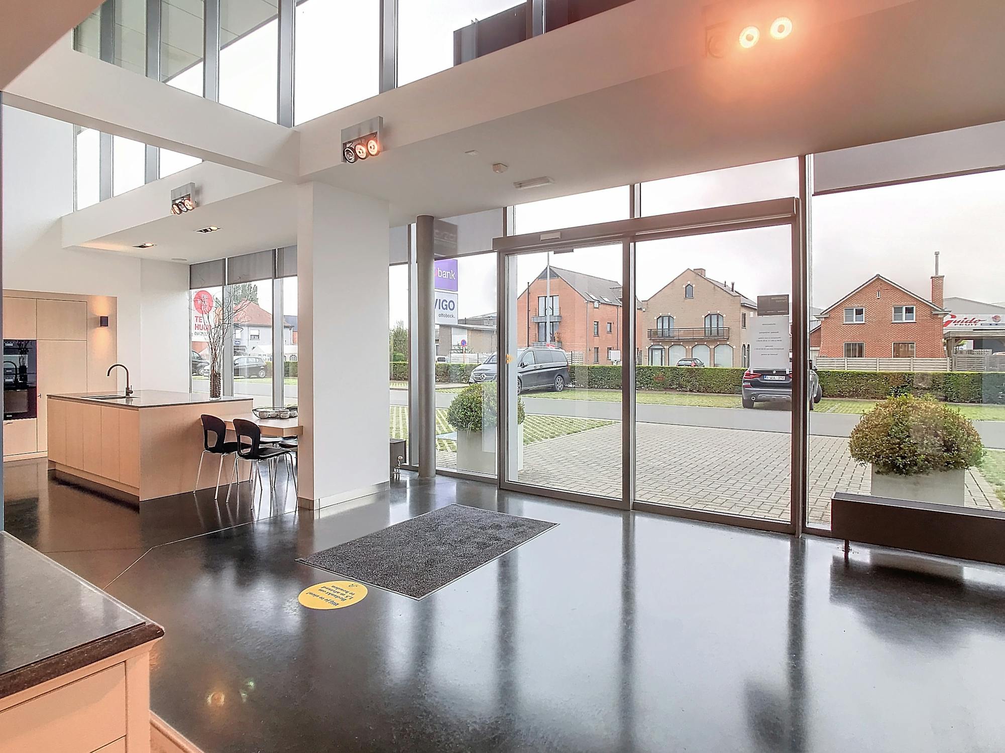 - op heden ingericht als kantoor op het gelijkvloers en polyvalente open ruimte/vergaderzaal van op het verdiep. De aanwezig inrichting kan verwijderd worden om terug tot een open, hoge handelsruimte dienst te doen. Er staan in de fotoreportage ook 3 foto's verwerkt van het aanpalende, gelijkaardige gebouw wat de mogelijkheden schetst.