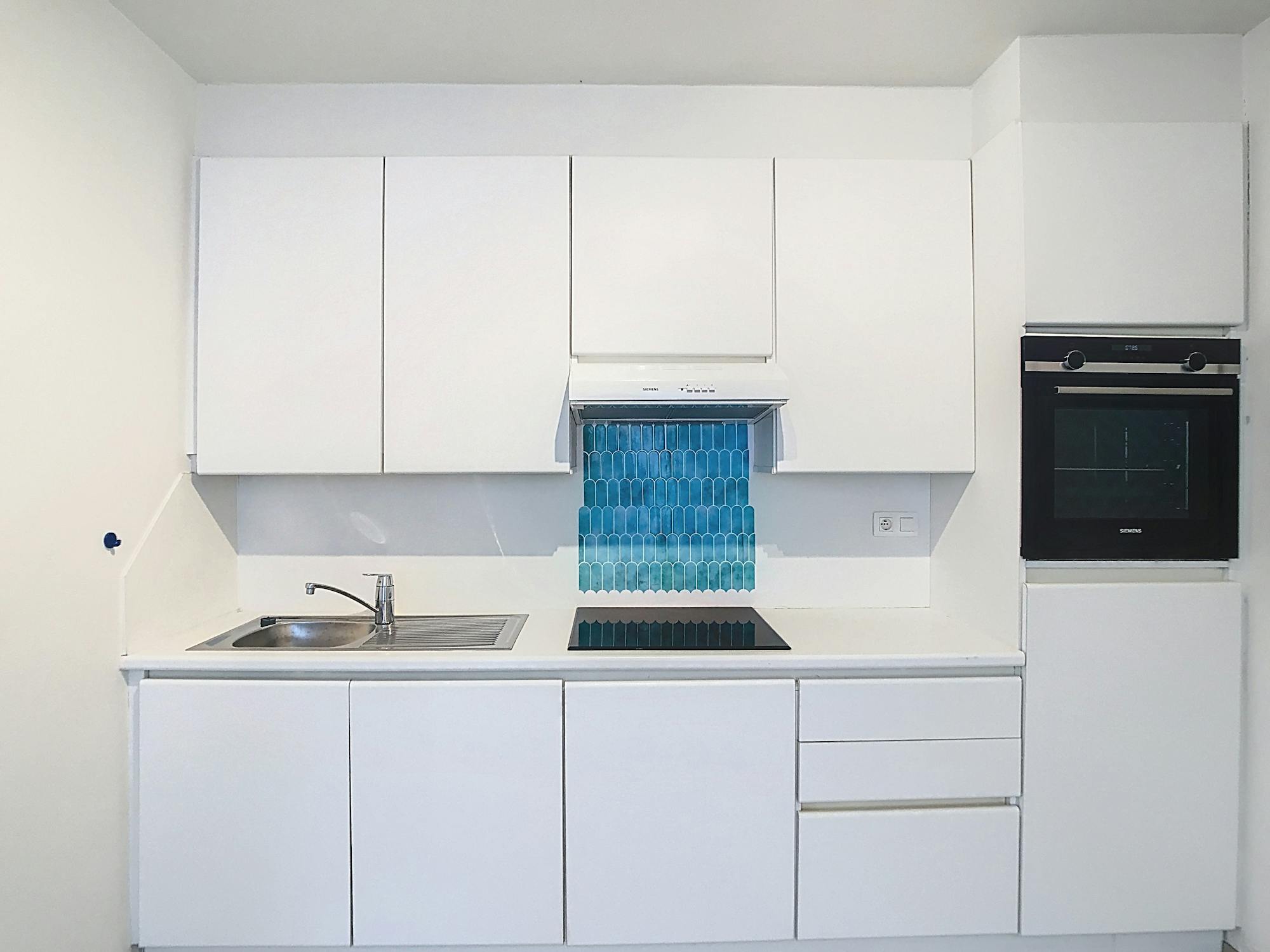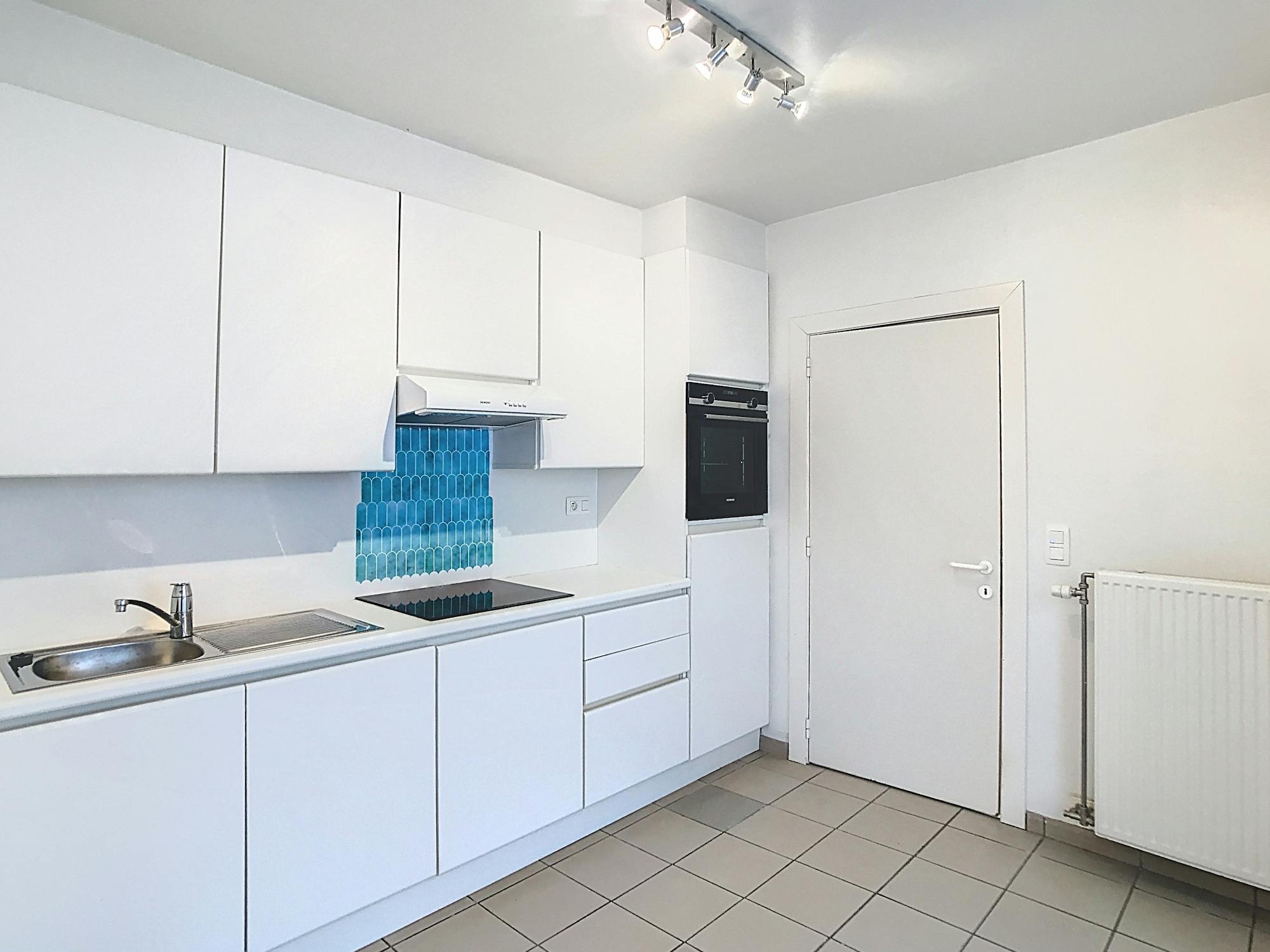 - leefruimte (27 m²) met halfopen keuken uitgerust met een frigo, spoelbak, oven, keramische kookplaat met dampkap en ingemaakte kasten