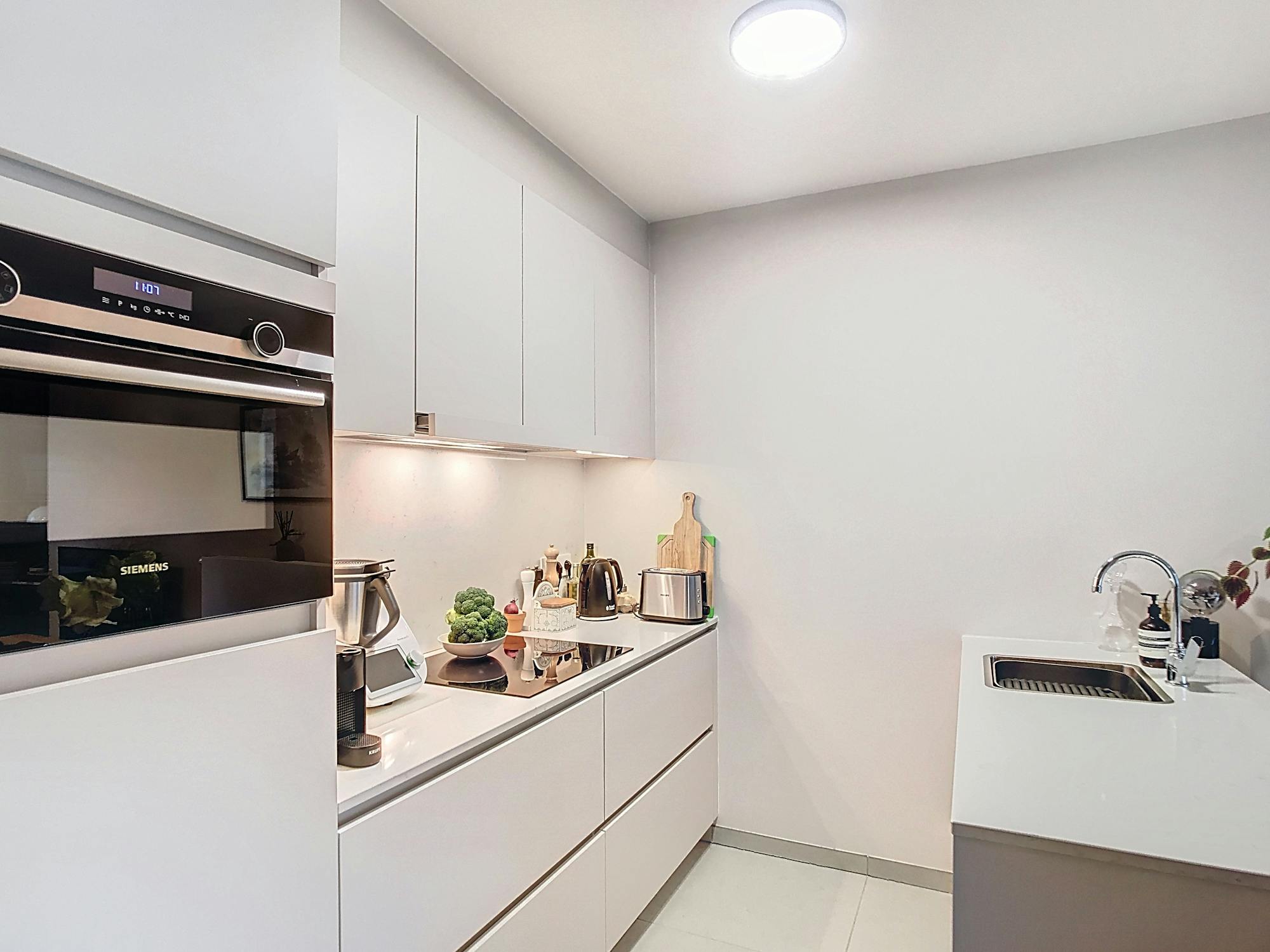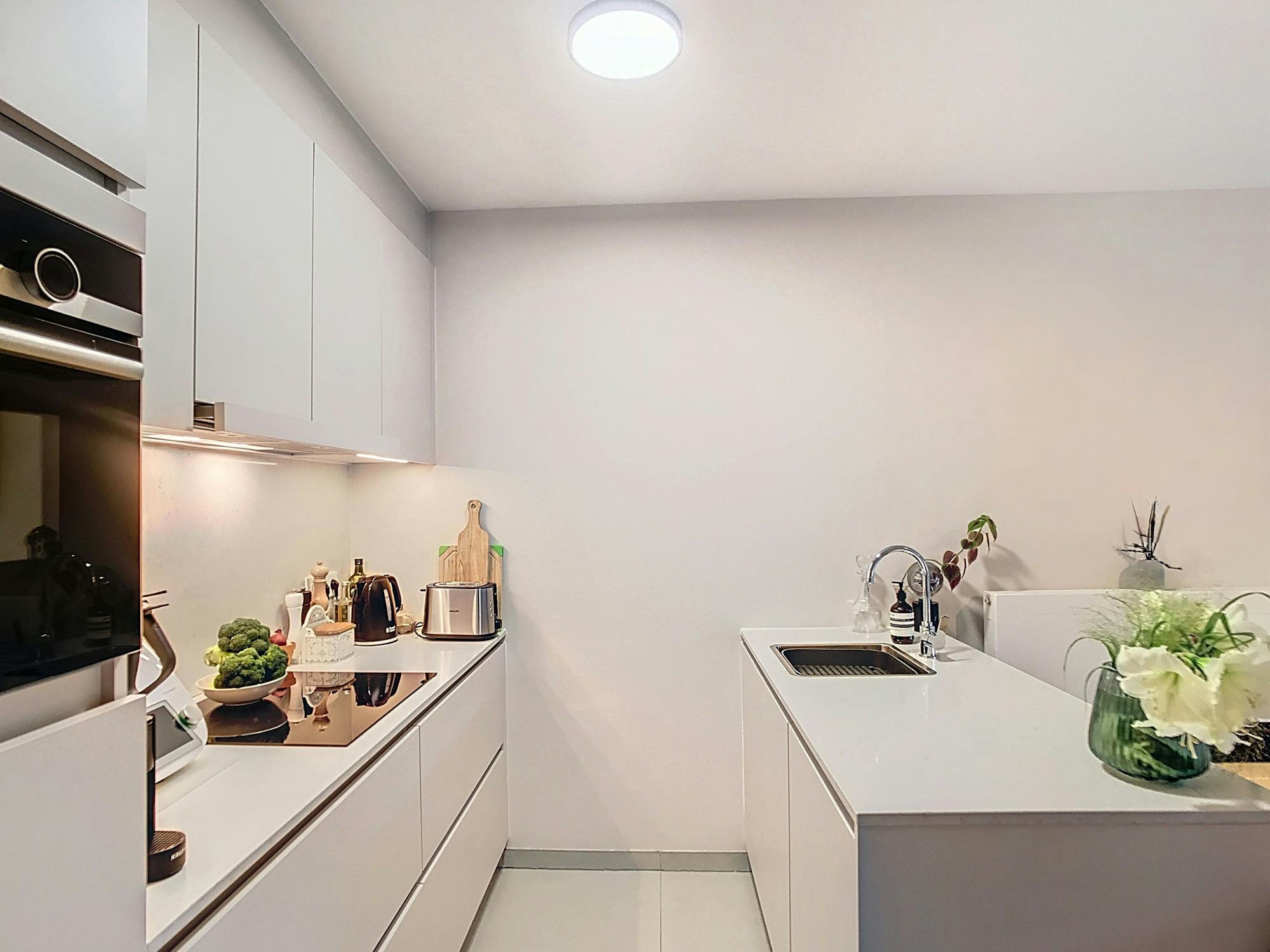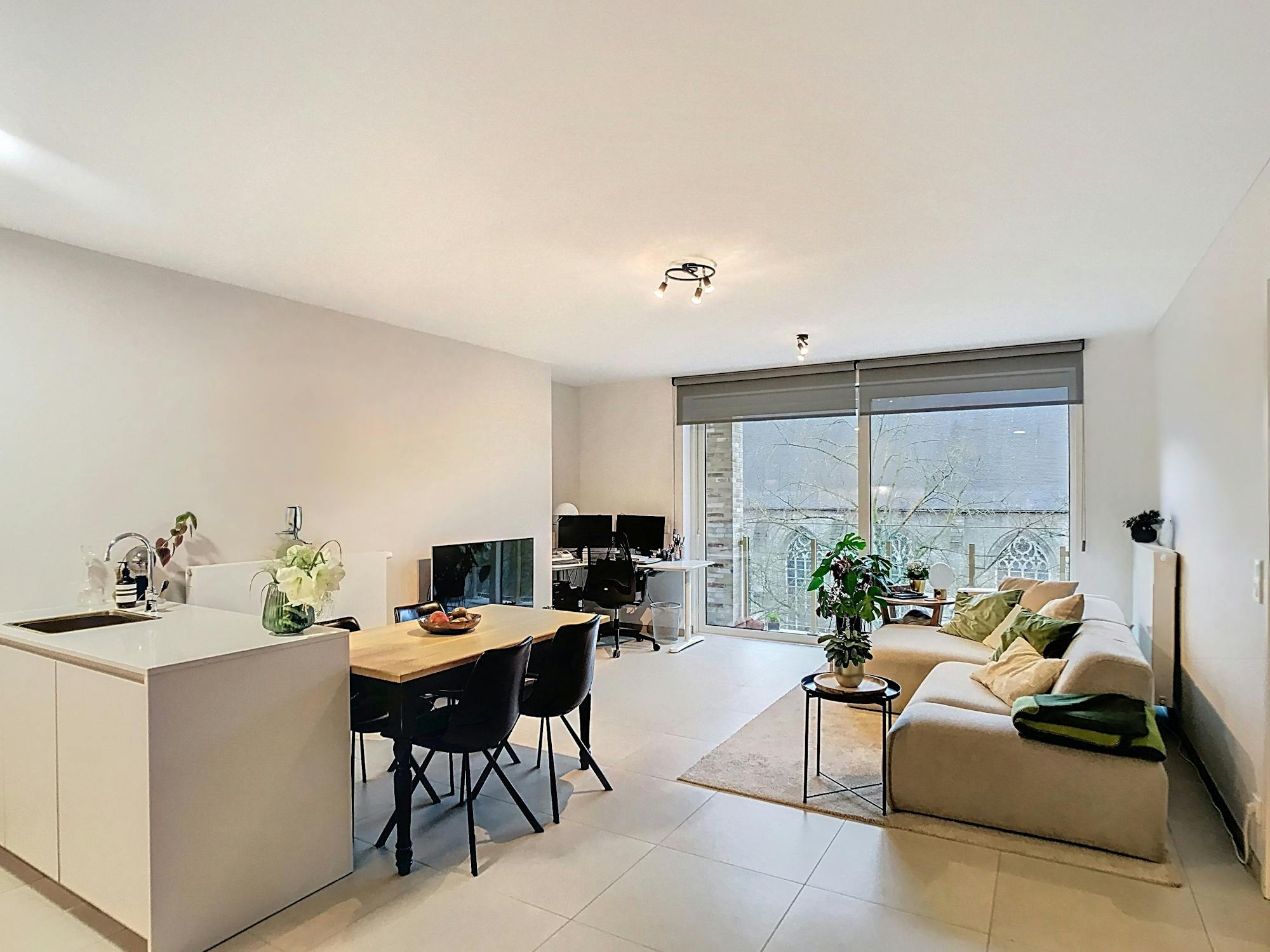 - lichtrijke leefruimte (30 m²) met een geïnstalleerde open keuken uitgerust met een microgolf, vaatwasser, spoelbak, keramische kookplaat met dampkap en koelkast