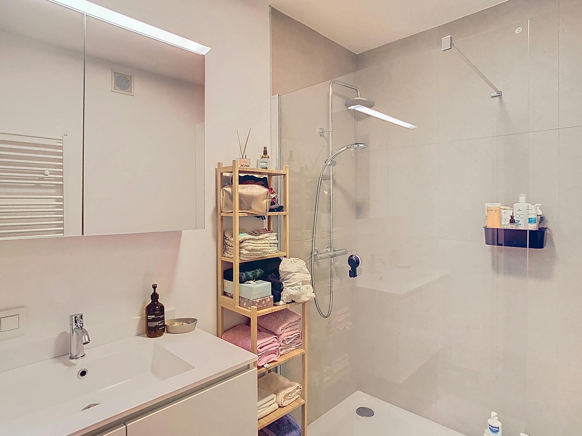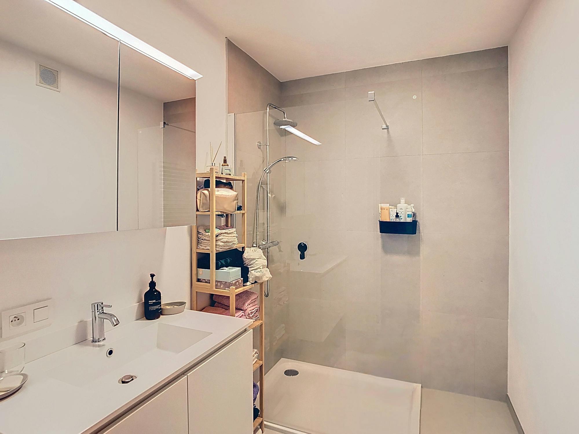 - badkamer (5 m²) voorzien van dubbele lavabo en inloopdouche