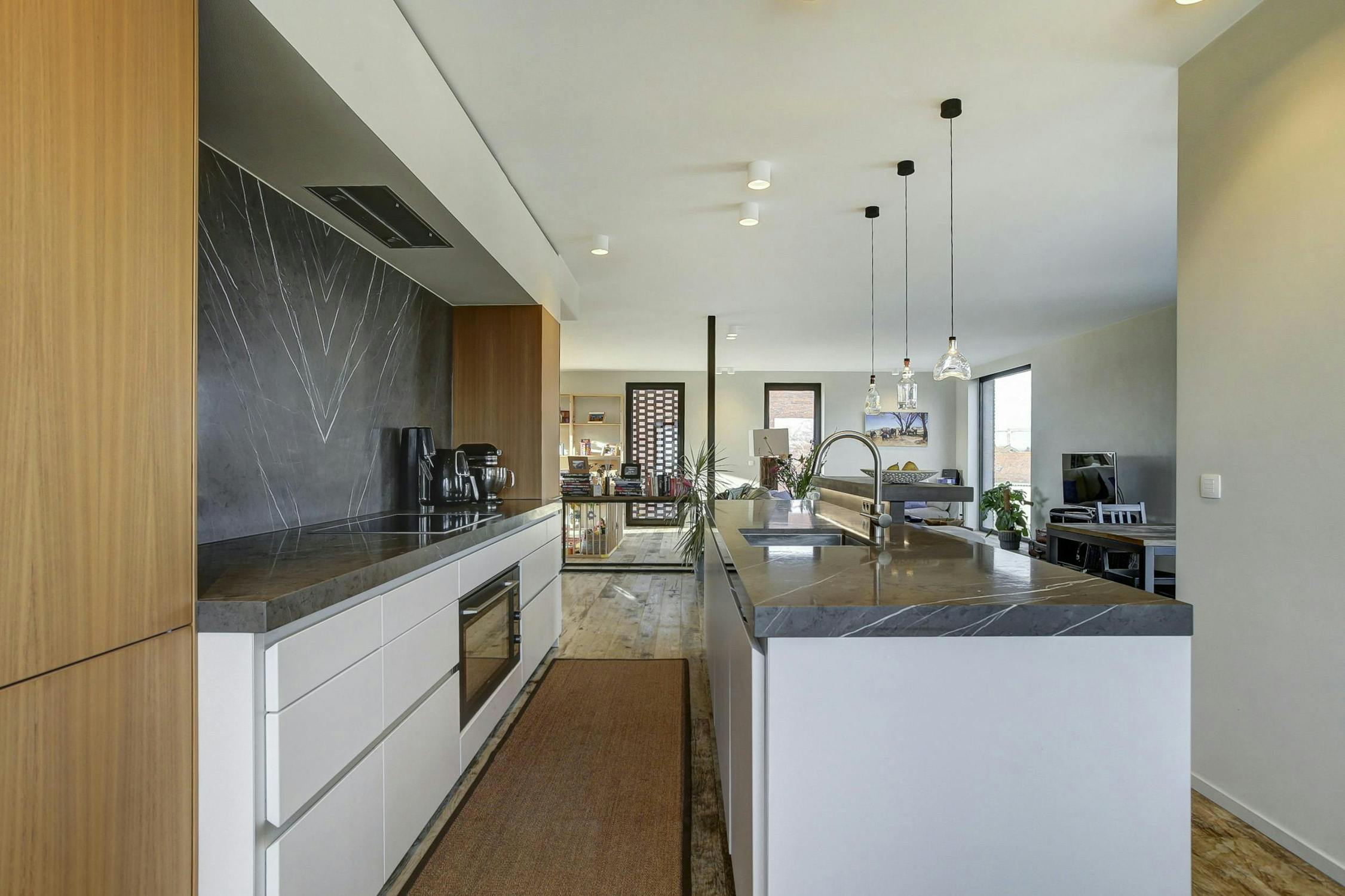 Binnen vinden we een leefruimte met open keuken die voorzien is van zeer hoogwaardige materialen en toestellen. De leefruimte is een absolute troef: een ruime doorzonliving met grote raampartijen en overvloedig daglicht. Het dakterras is te bereiken via een schuifraam.
