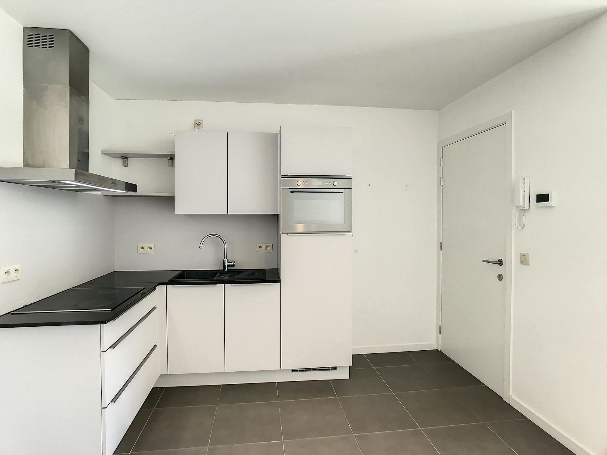 De open keuken sluit aan op de leefruimte en creëert een gevoel van gezelligheid. De keuken is volledig uitgerust en biedt voldoende kastruimte. Via de leefruimte is er toegang tot het zonnige terras, waar men kan genieten van een rustige buitenruimte midden in de stad.