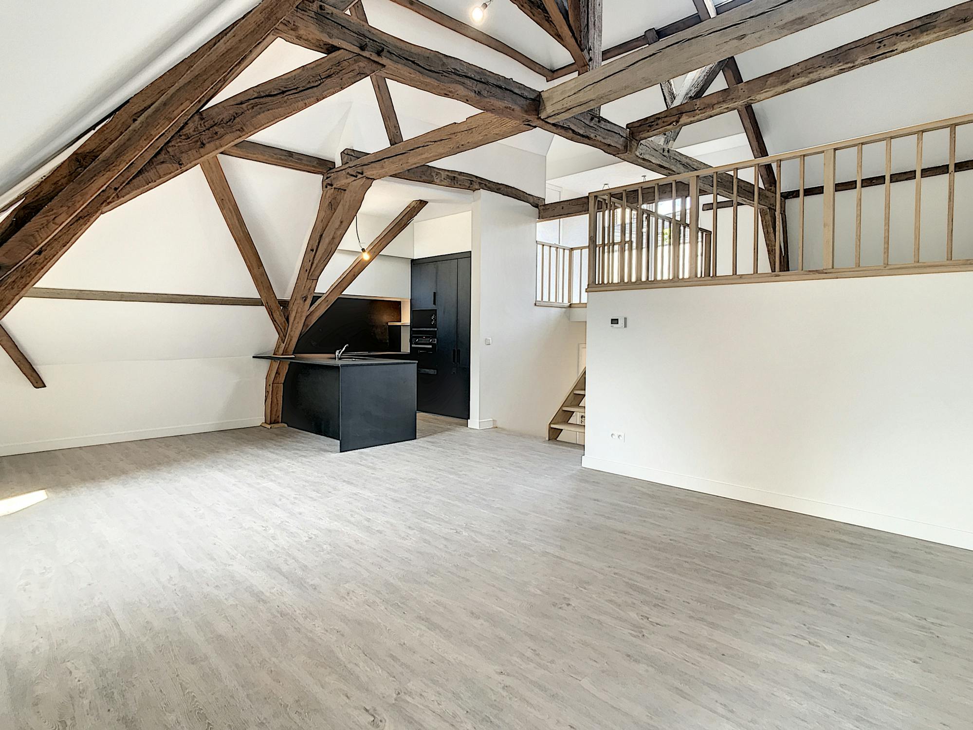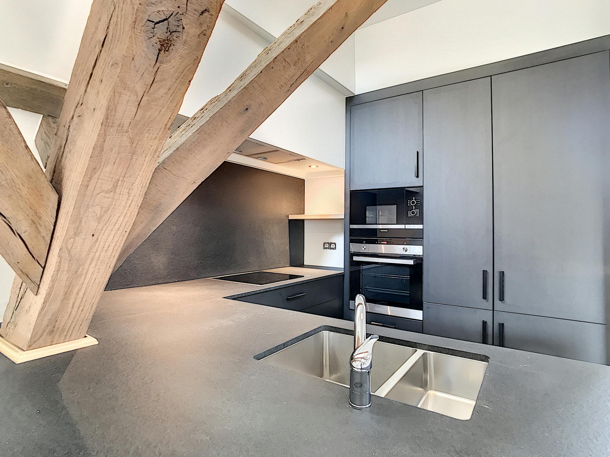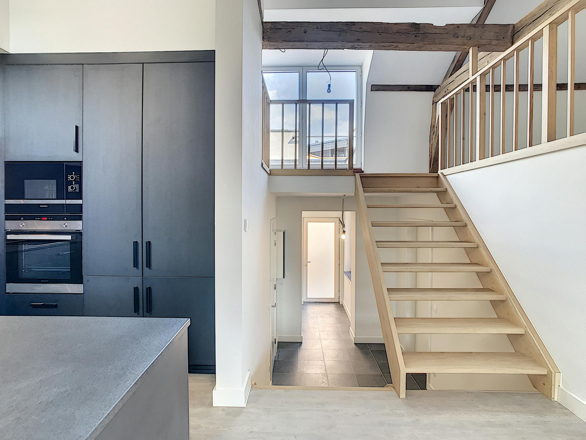 De ruime leefruimte biedt dankzij de grote ramen een aangename, open sfeer. De moderne keuken sluit hier naadloos op aan en is uitgerust met alle nodige voorzieningen. De verdieping zorgt voor een duidelijke scheiding tussen wonen en slapen, wat het appartement bijzonder praktisch maakt.