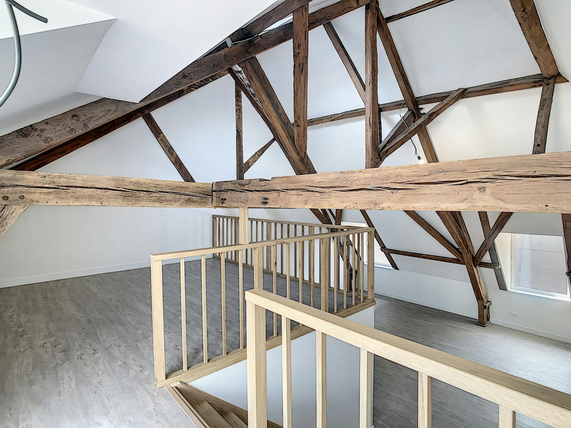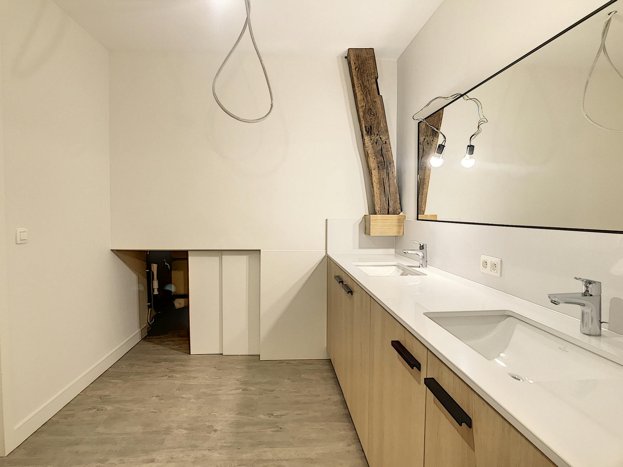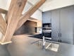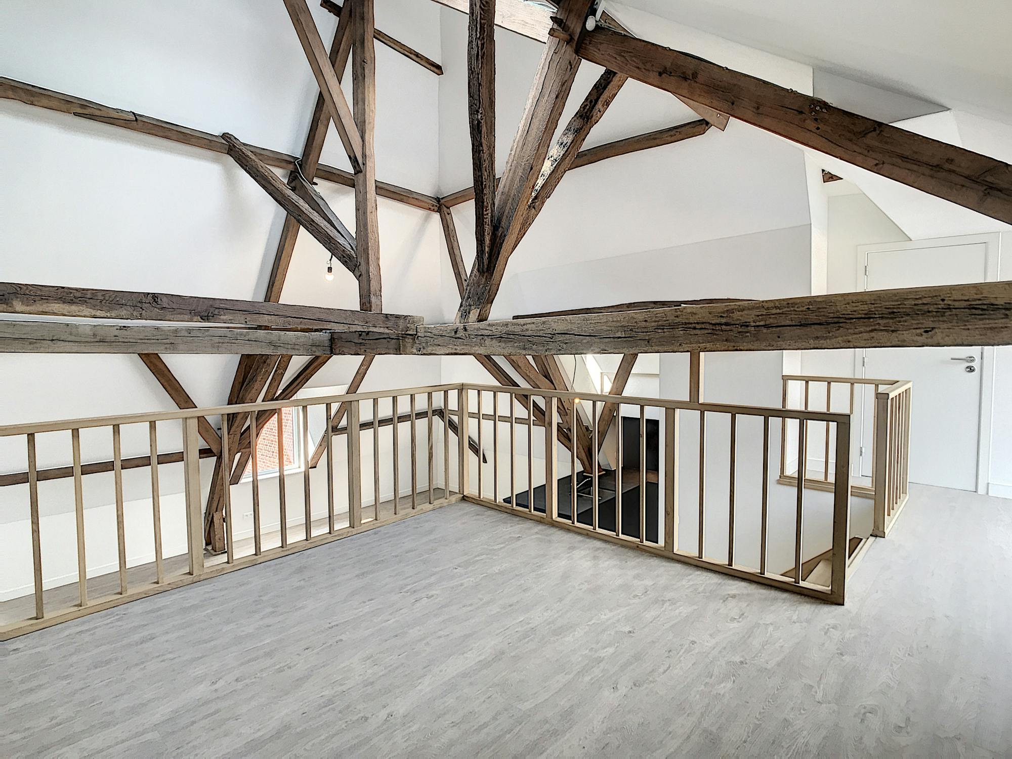 De ruime leefruimte biedt dankzij de grote ramen een aangename, open sfeer. De moderne keuken sluit hier naadloos op aan en is uitgerust met alle nodige voorzieningen. De verdieping zorgt voor een duidelijke scheiding tussen wonen en slapen, wat het appartement bijzonder praktisch maakt.