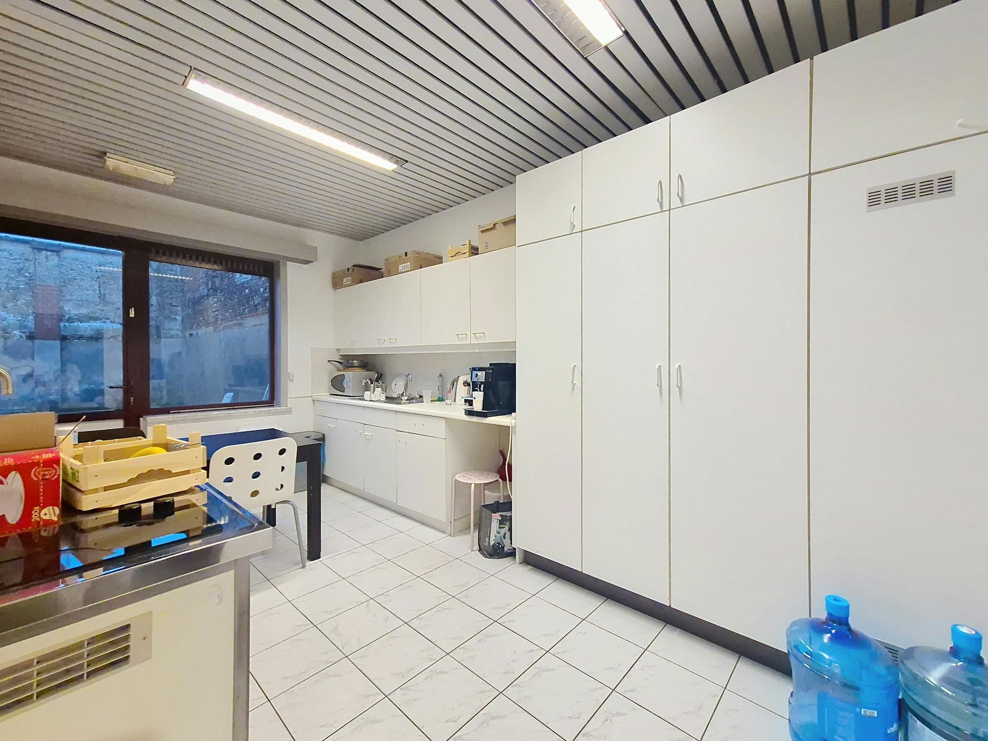 Het kantoor beschikt over een inkomhal, drie aparte bureaus en twee open ruimtes die perfect zijn als landschapskantoor of vergaderruimte. Verder is er een ruime keuken en is er moderne sanitaire voorziening aanwezig.
