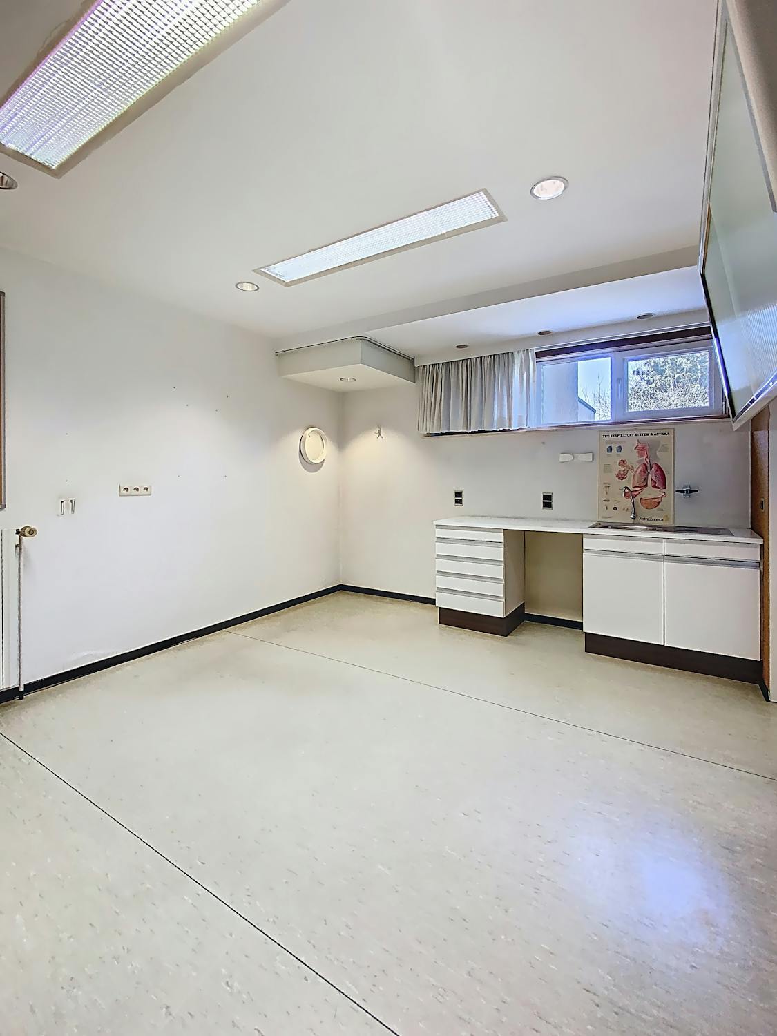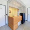Via een lichtrijke inkomhal vind je, recht voor jou, de balie van het secretariaat, links een grote wachtruimte en rechts een toilet, geflankeerd door een berging.