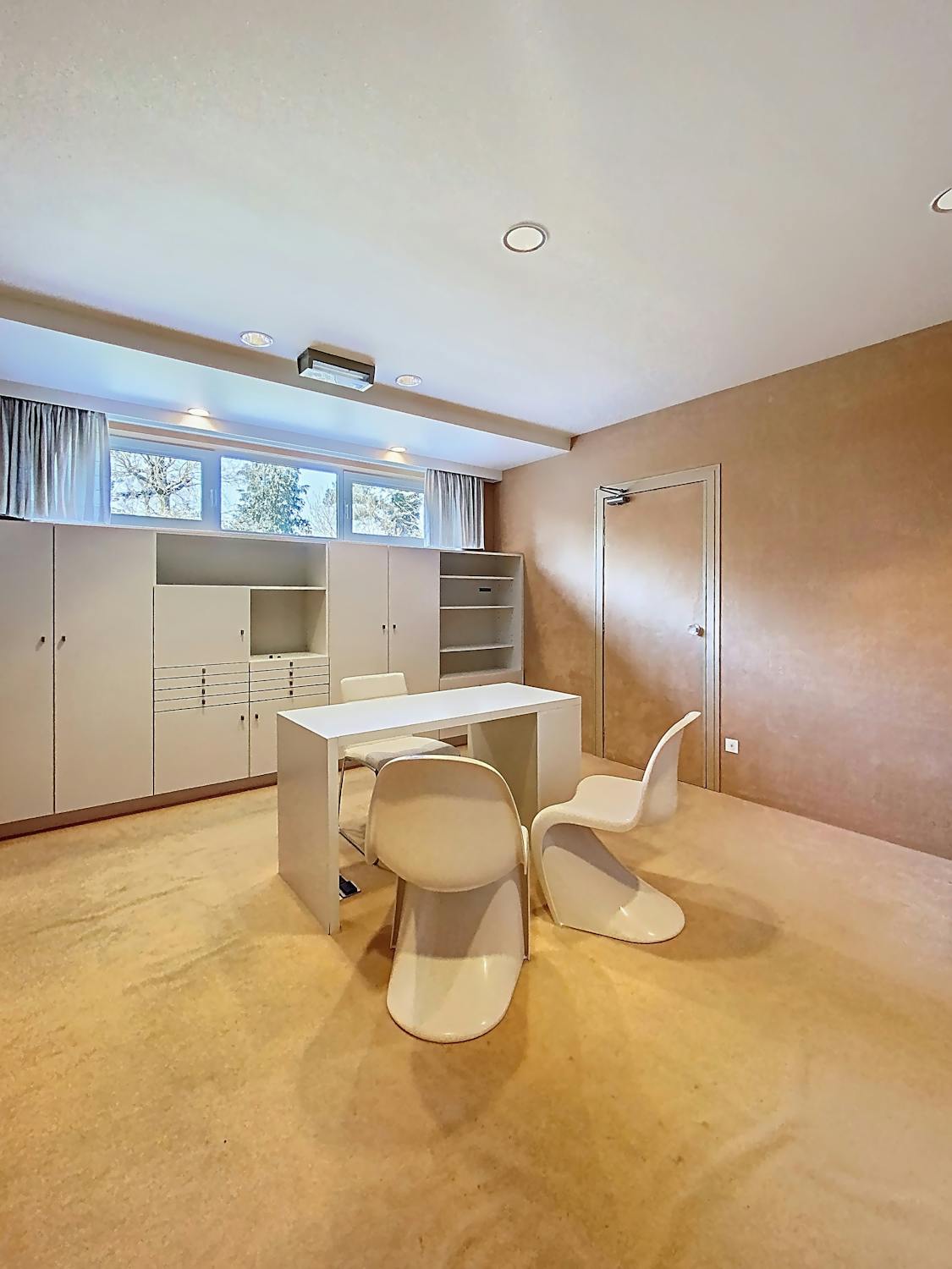 Een sasdeur geeft toegang tot het secretariaat en 3 grote kamers, te gebruiken als bureel of behandelruimte.