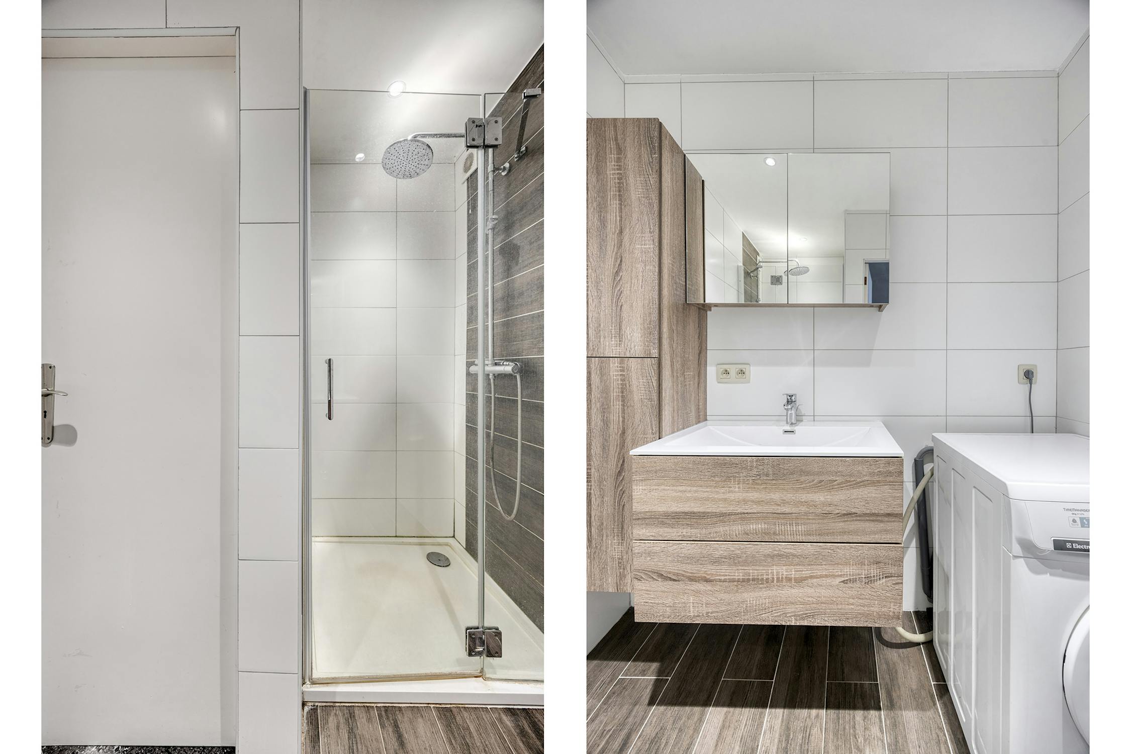 - badkamer met lavabo, douche en aansluitingen voor de wasmachine