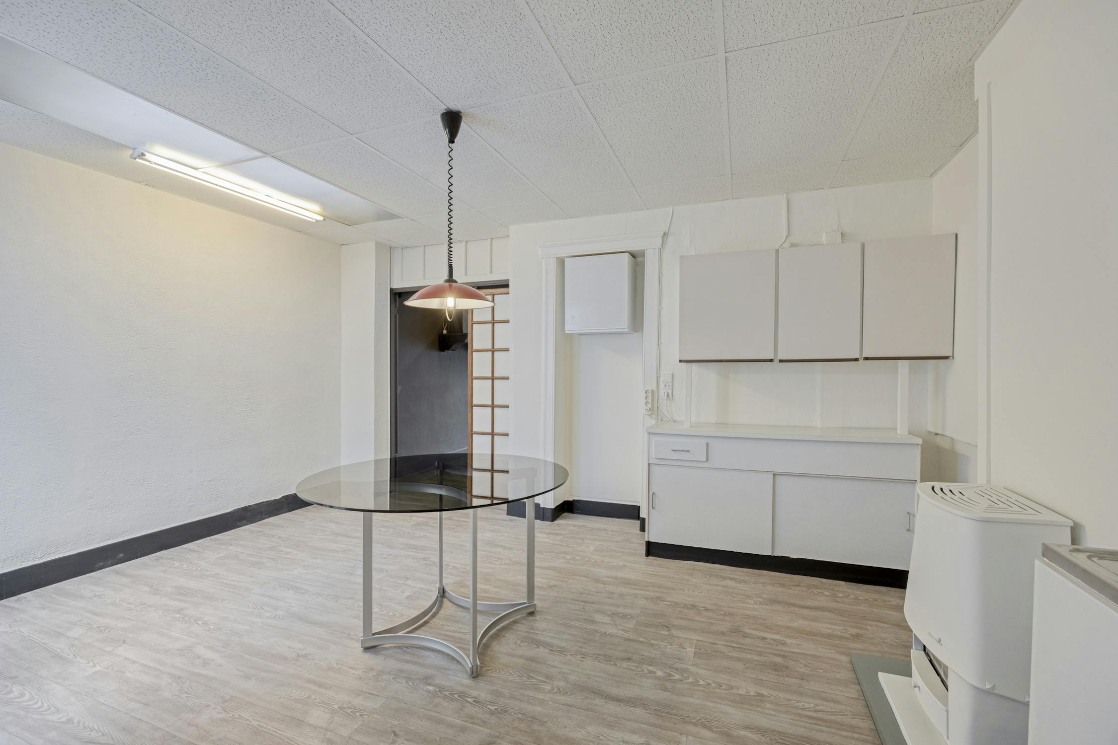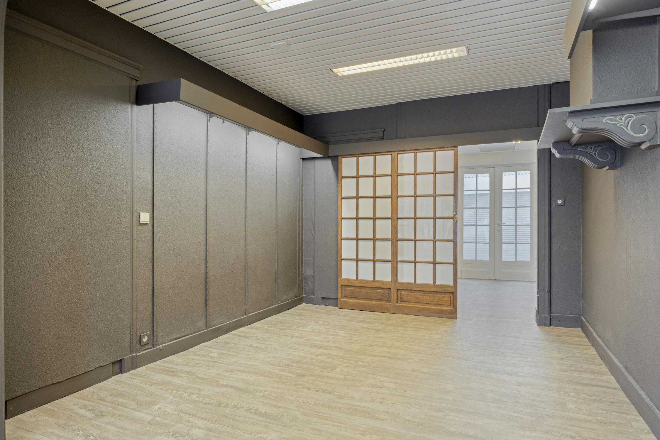 Vooraan het handelspand is er een aparte deur met toegang tot een handige kelder en trap naar het eerste verdiep. Op het eerste verdiep zijn er twee polyvalente kamers die dienst kunnen doen als kantoor of slaapkamers.