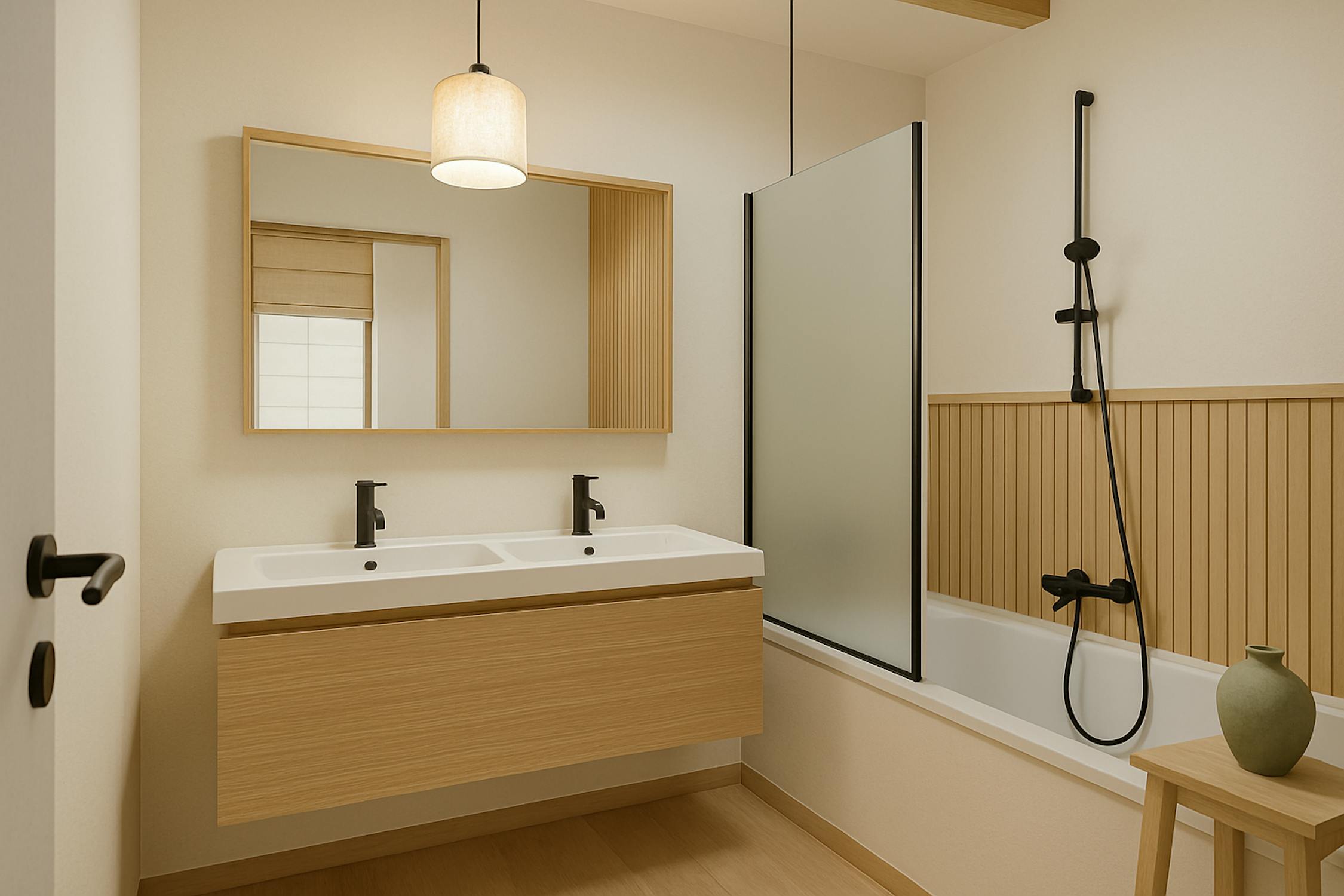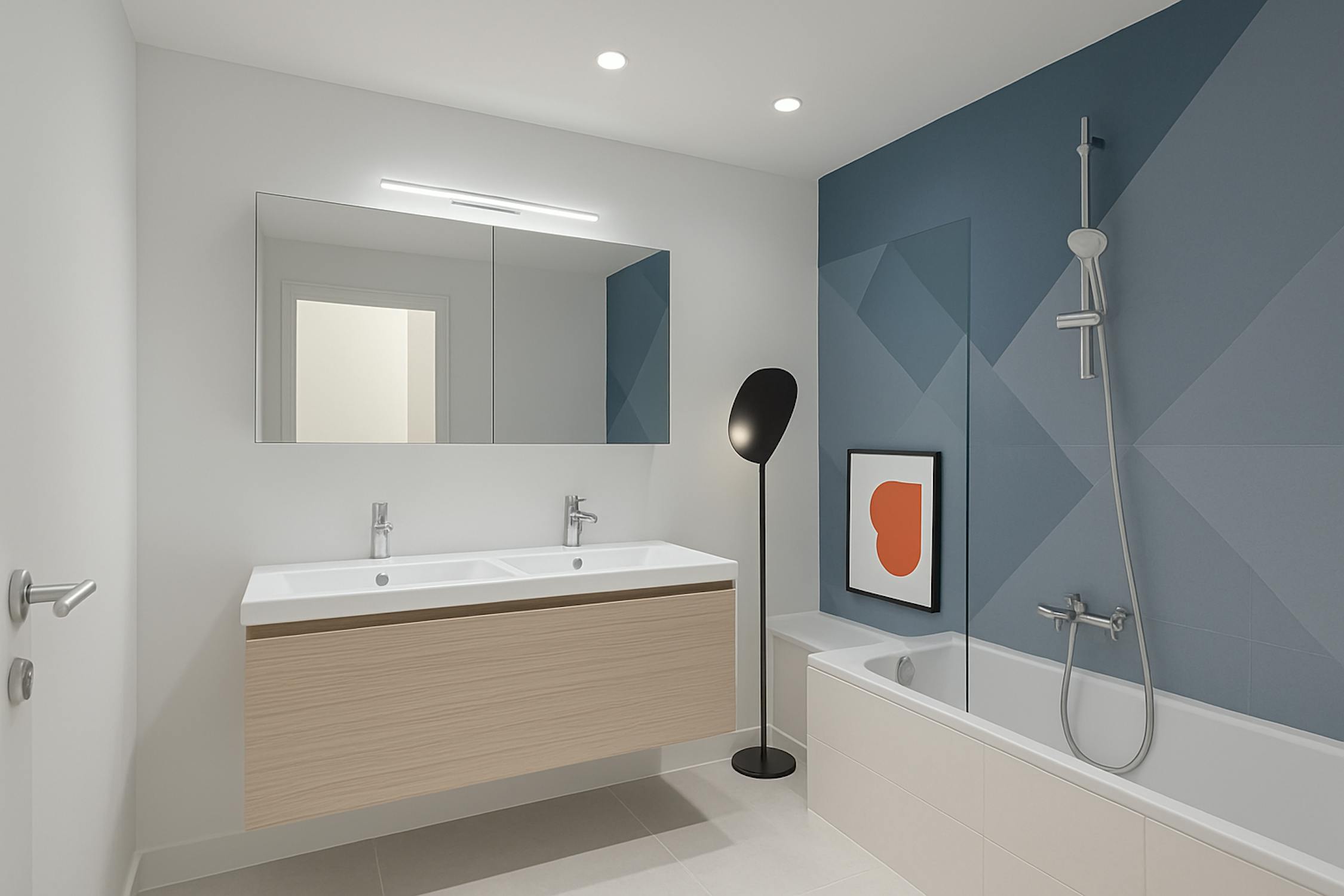 - badkamer met dubbele lavabo en ligbad met douchescherm