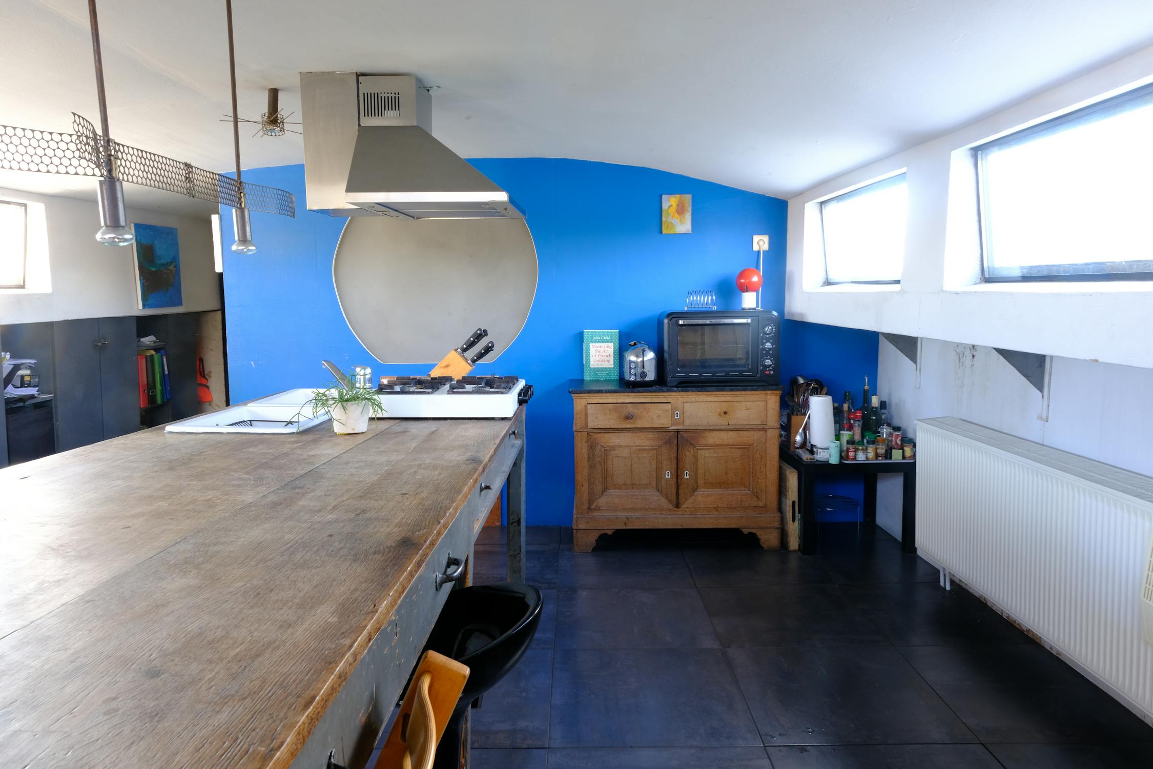 - Keuken met authentieke tafel voorzien van water toevoer en gasfornuis.