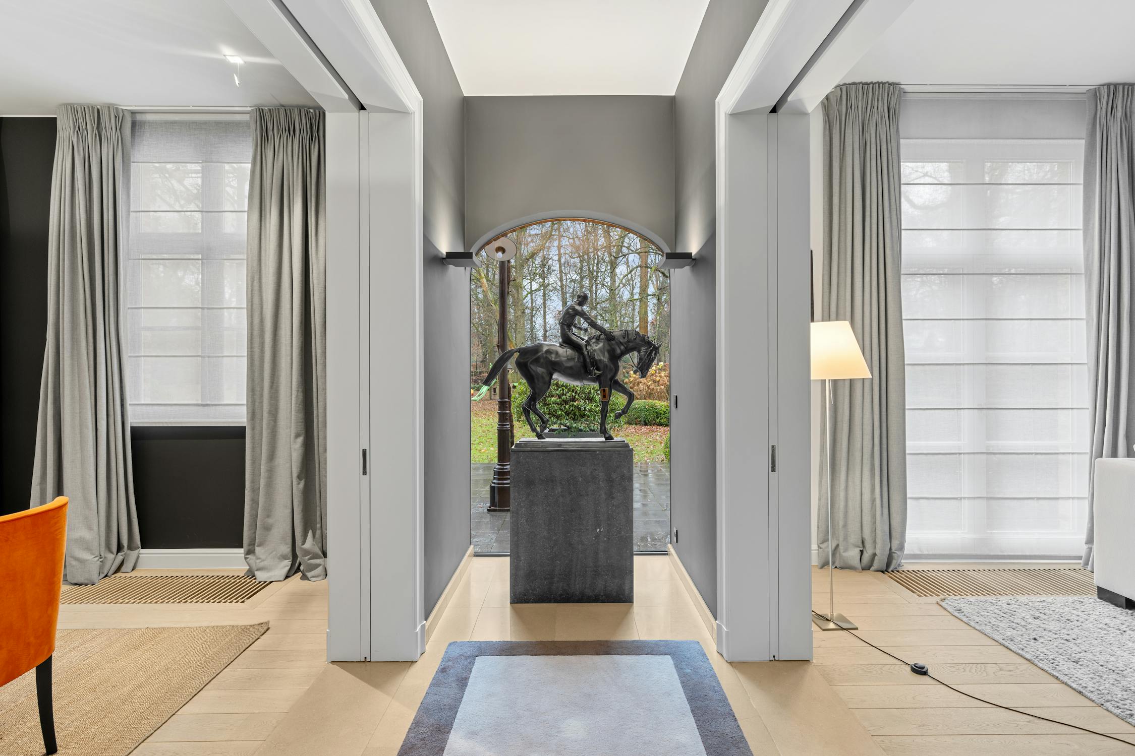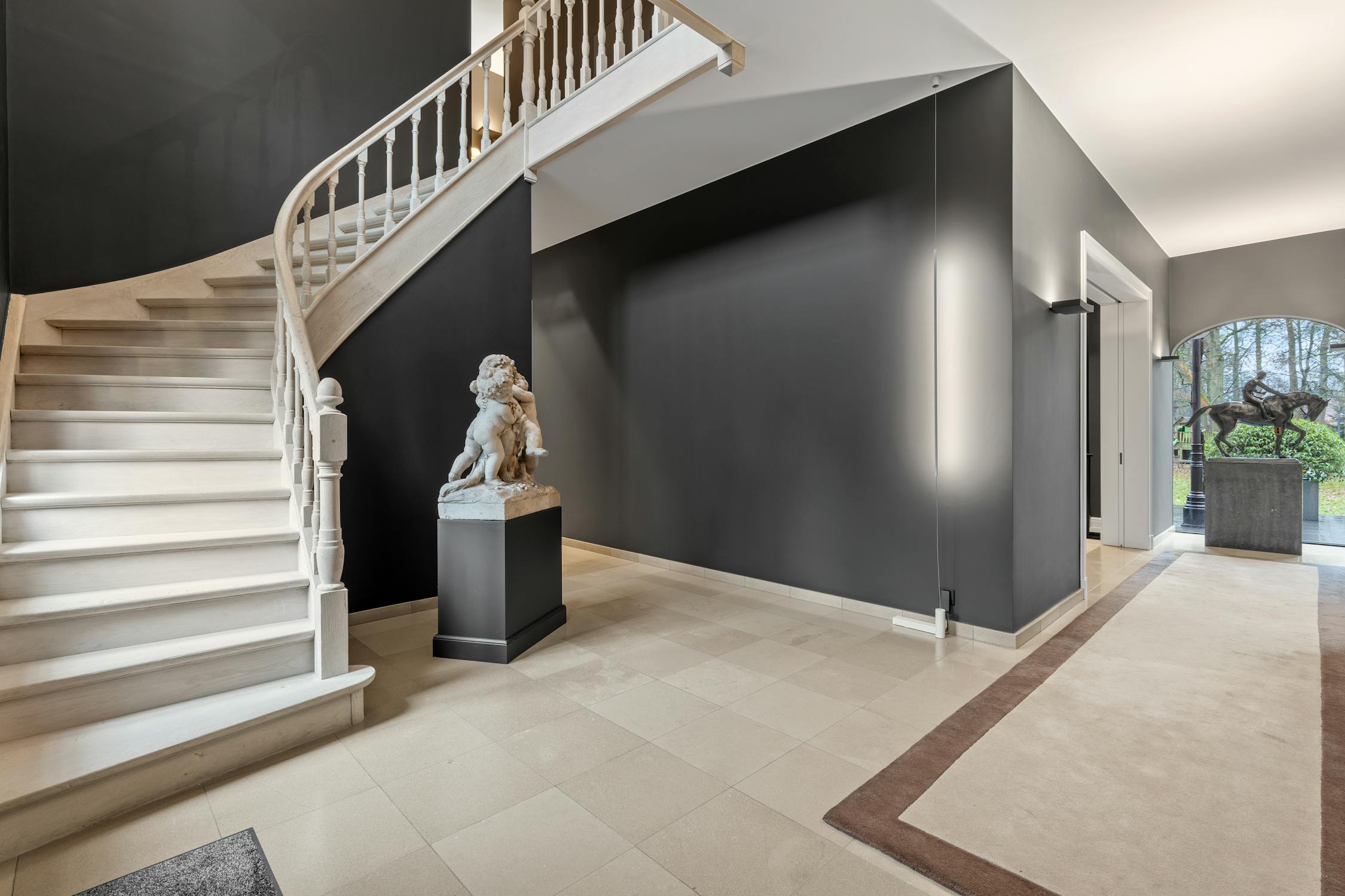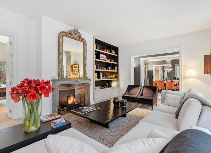 De statige inkomhal met trap en gastentoilet leidt naar de royale en gezellige leefruimte met salon. De verfijnde ruimte baadt in het natuurlijk daglicht en geniet van een sfeervolle gashaard met fraaie schouwmantel, een stijlvolle parketvloer en in de muur ingewerkte kasten. Aanpalend vindt u nog een knusse tv- en leeskamer en een aparte, breed inzetbare hobbyruimte.