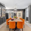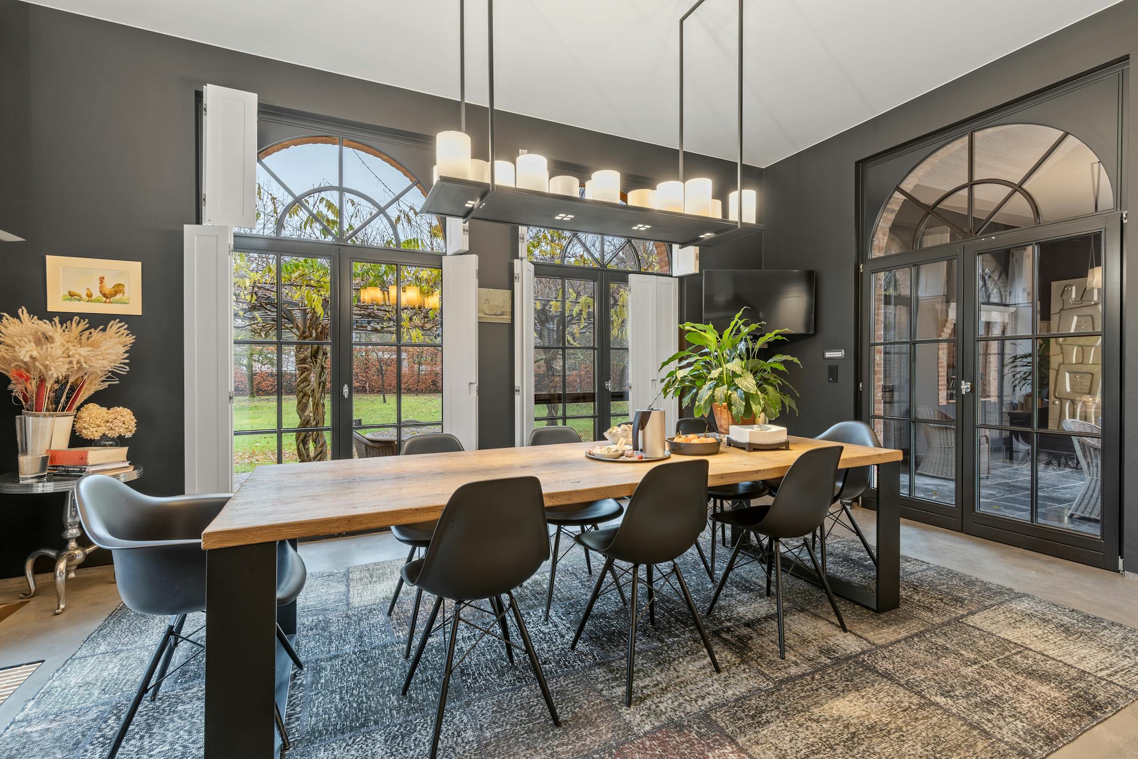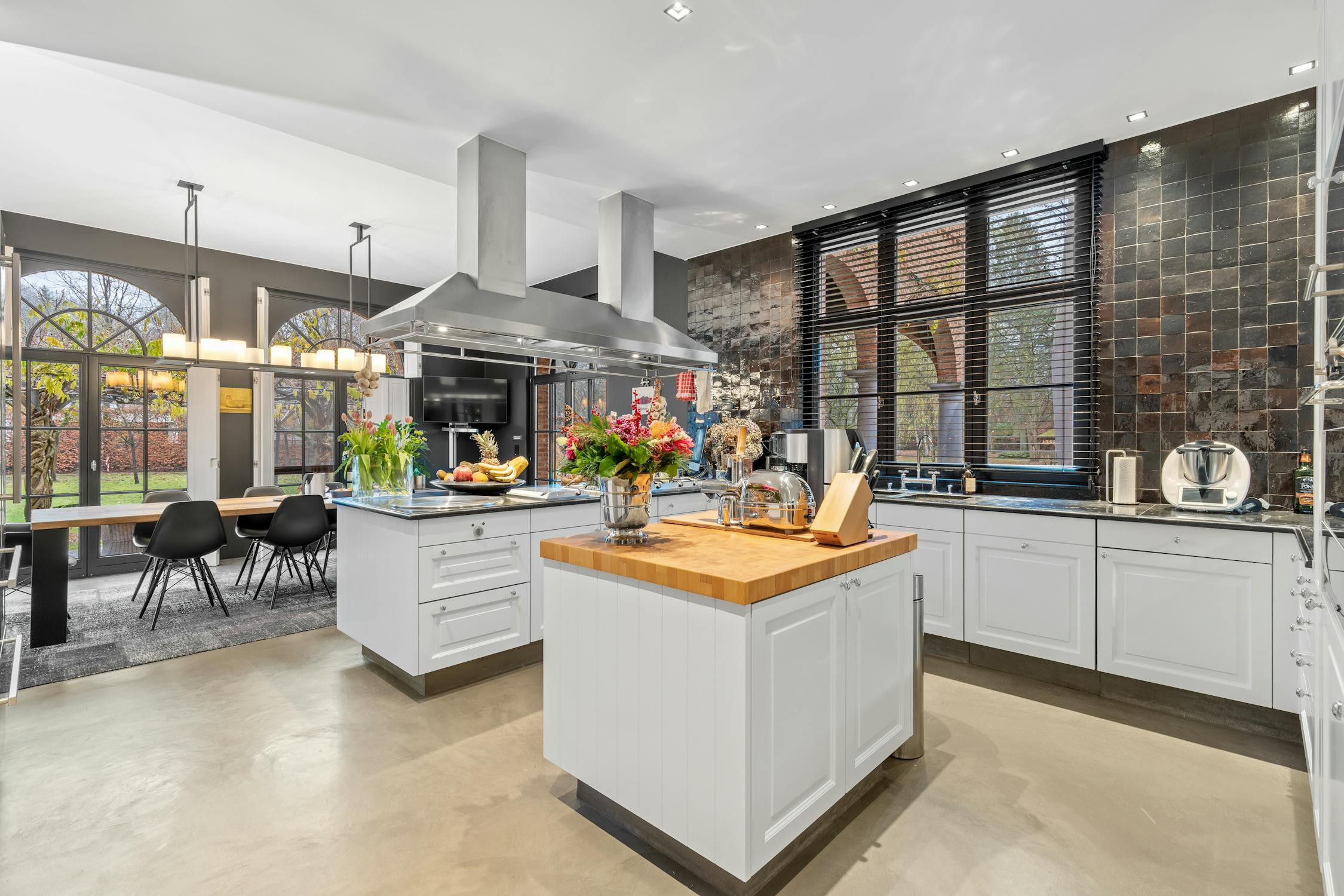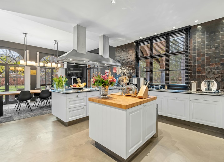 De hyper-geïnstalleerde keuken werd gebouwd met aandacht voor modern design en functionaliteit. De ruimte is uitgerust met twee grote kookeilanden, een hoogwaardige natuurstenen betegeling en kwalitatieve ingemaakte apparatuur. De naadloze integratie met de aansluitende eetruimte wordt versterkt door boogvormige raampartijen die u ook tijdens het koken een prachtig zicht bieden op de tuin. Deze eetplaats imponeert eveneens met zijn hoge plafonds en elegante buffetkasten, een prachtig staaltje maatwerk dat de ruimte een statig karakter geeft.
