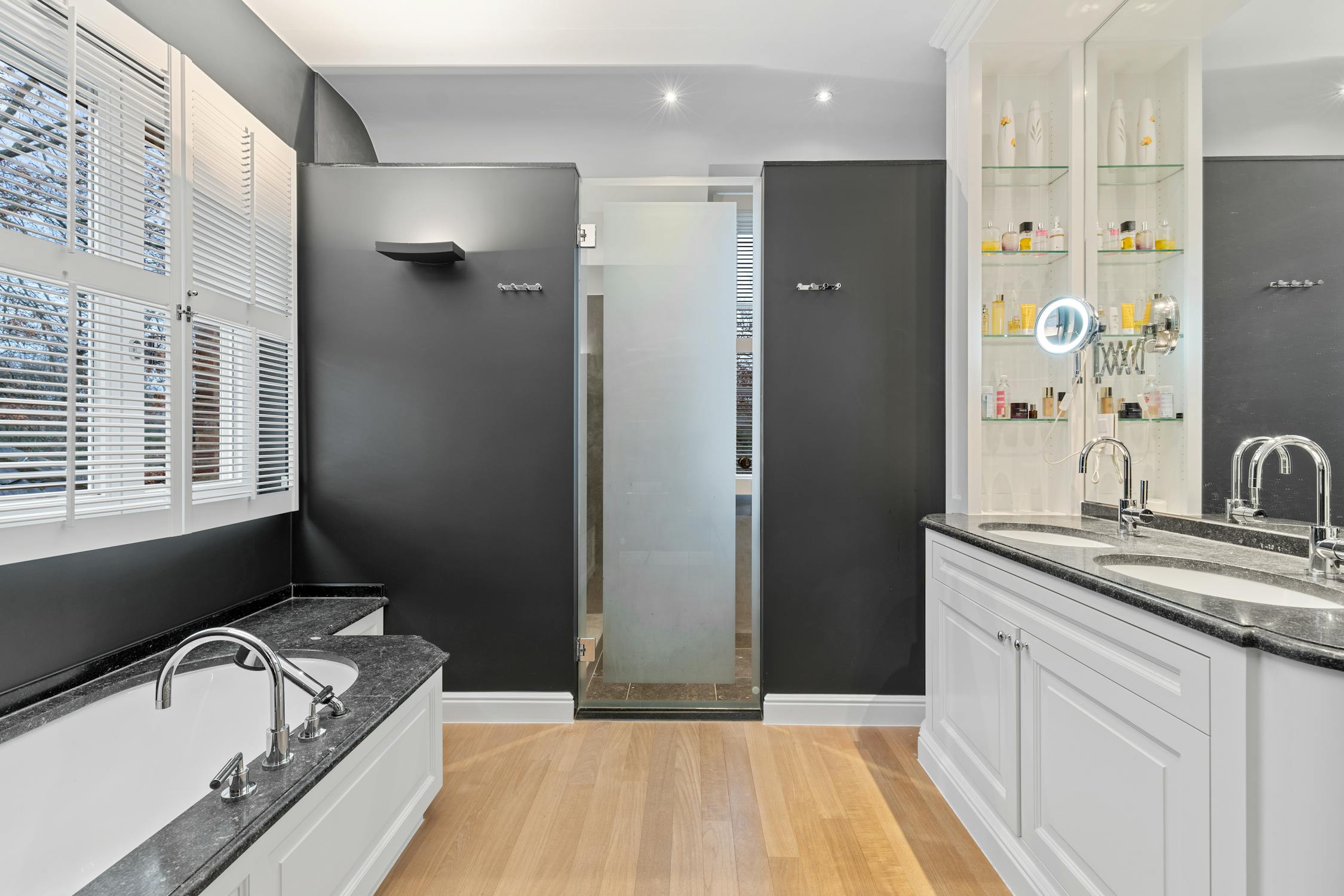 Het gelijkvloerse, karaktervolle bureel is eveneens uitgerust met een lichte parketvloer en maakt indruk met zijn gietijzeren wenteltrap, stijlvol ingebouwde boekenkasten en hoge plafonds. Ook hier zorgen grote raampartijen voor overvloedig natuurlijk licht en een connectie met de omringende tuin. De ruimte leent zich uitstekend voor het uitoefenen van uw vrije beroep of als kantoor, om zonder concessies en in alle comfort aan telewerk te doen.