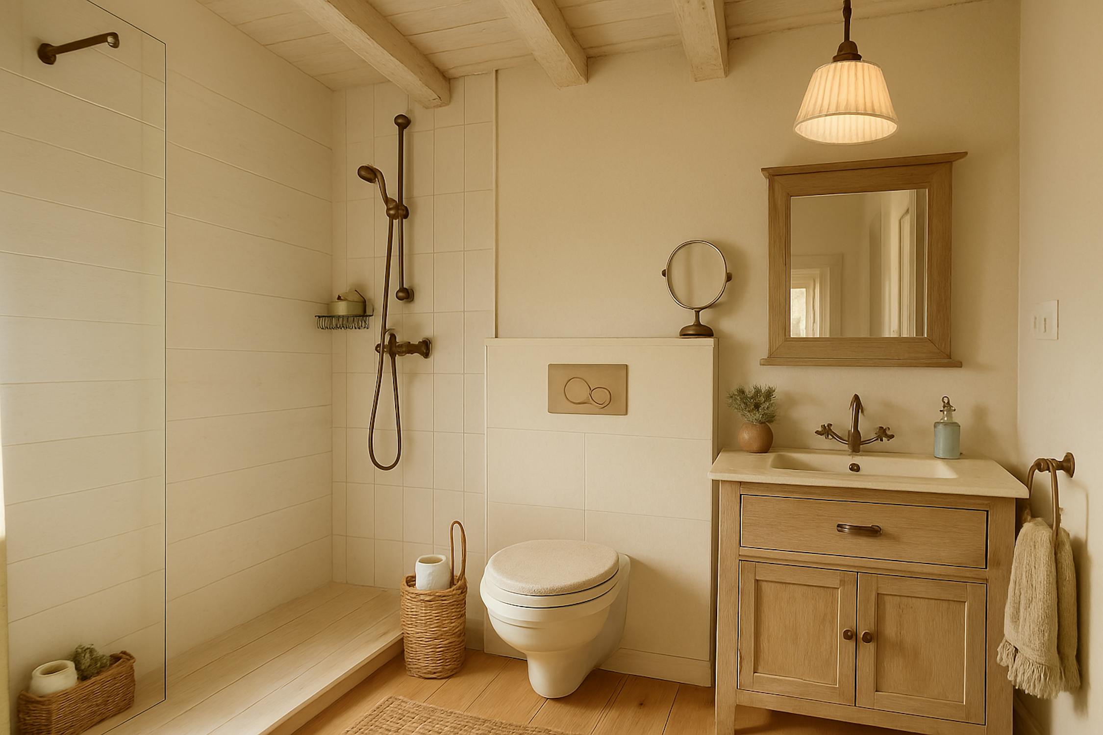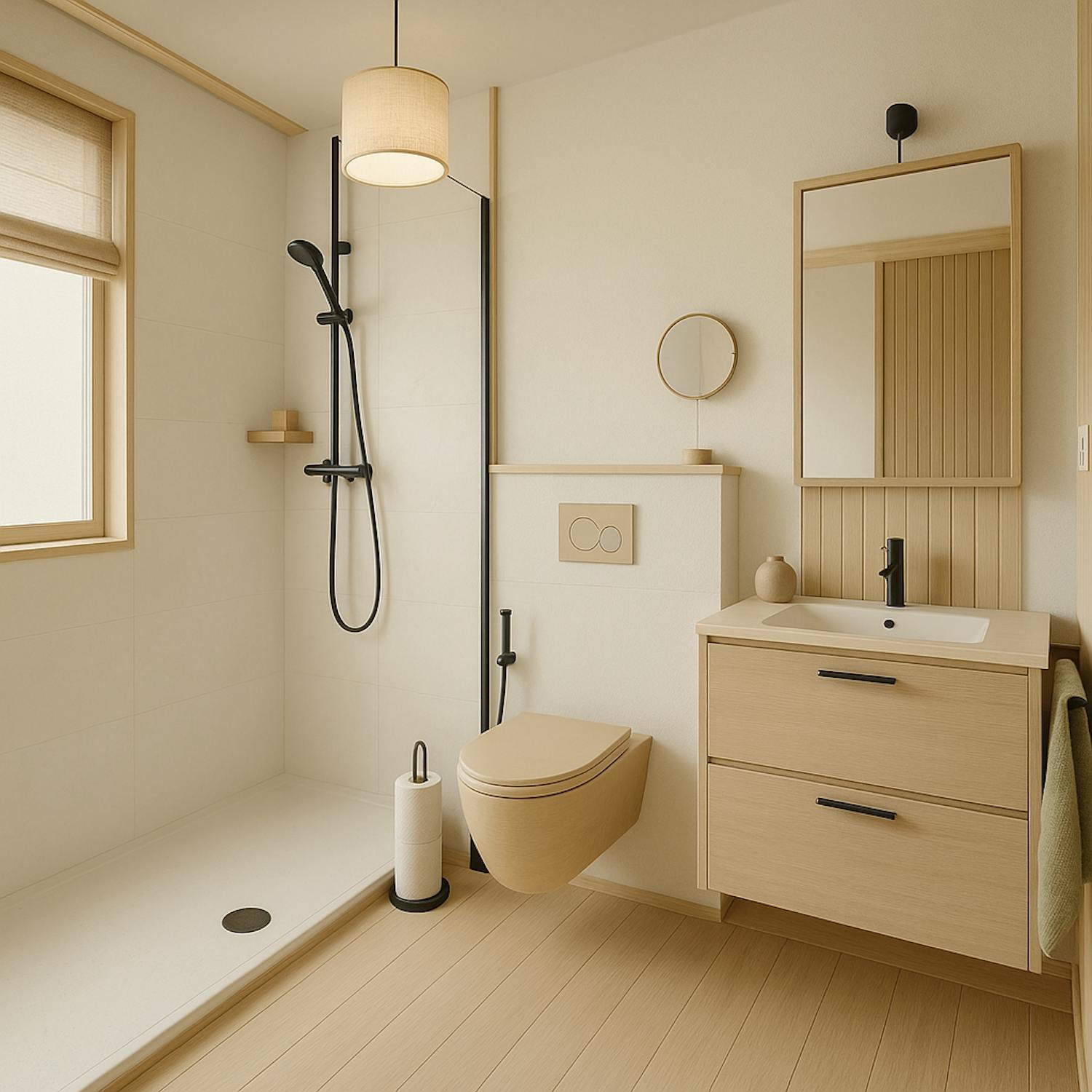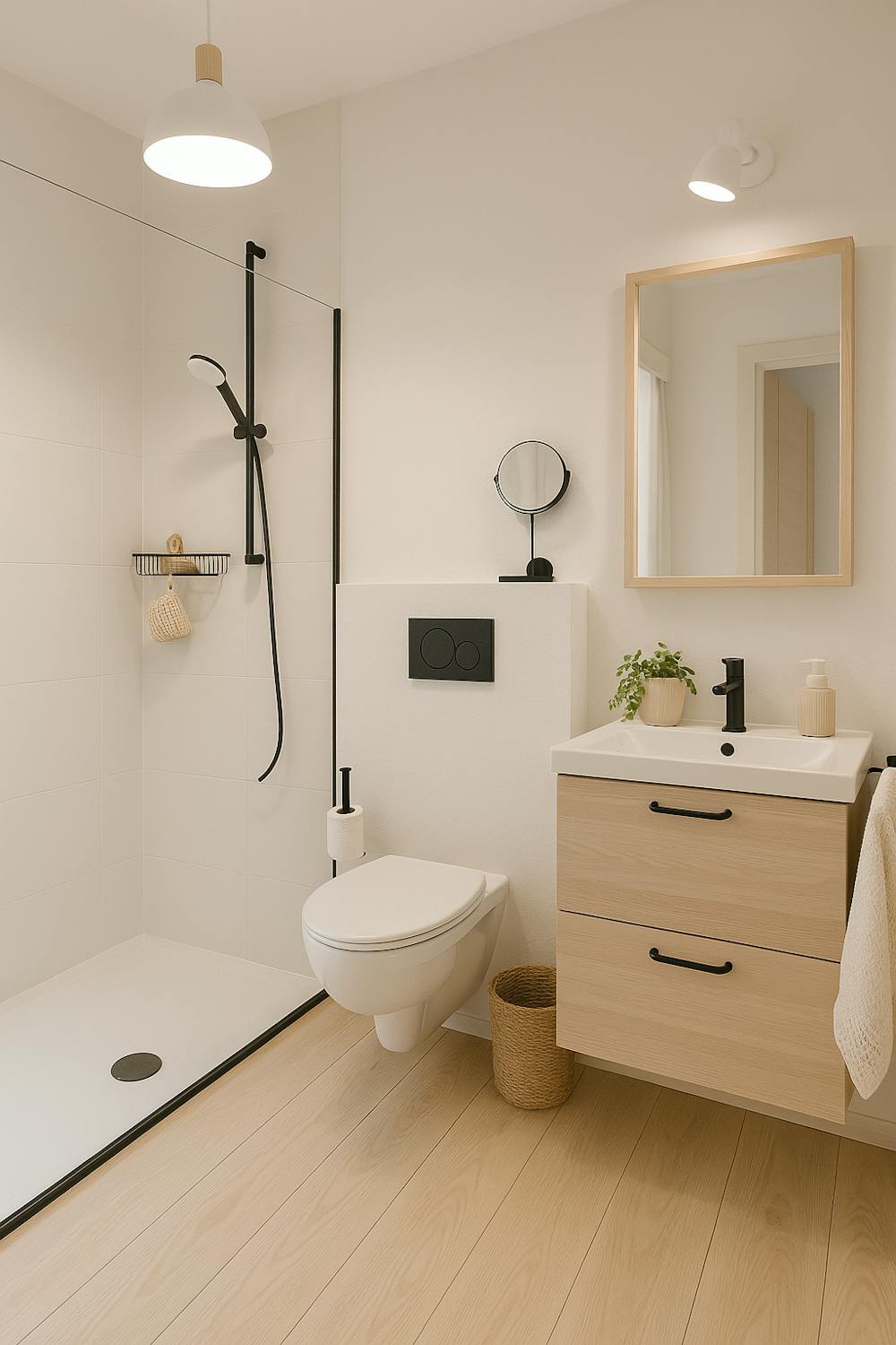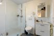 Badkamer met inloopdouche, lavabo meubel en spiegelkast