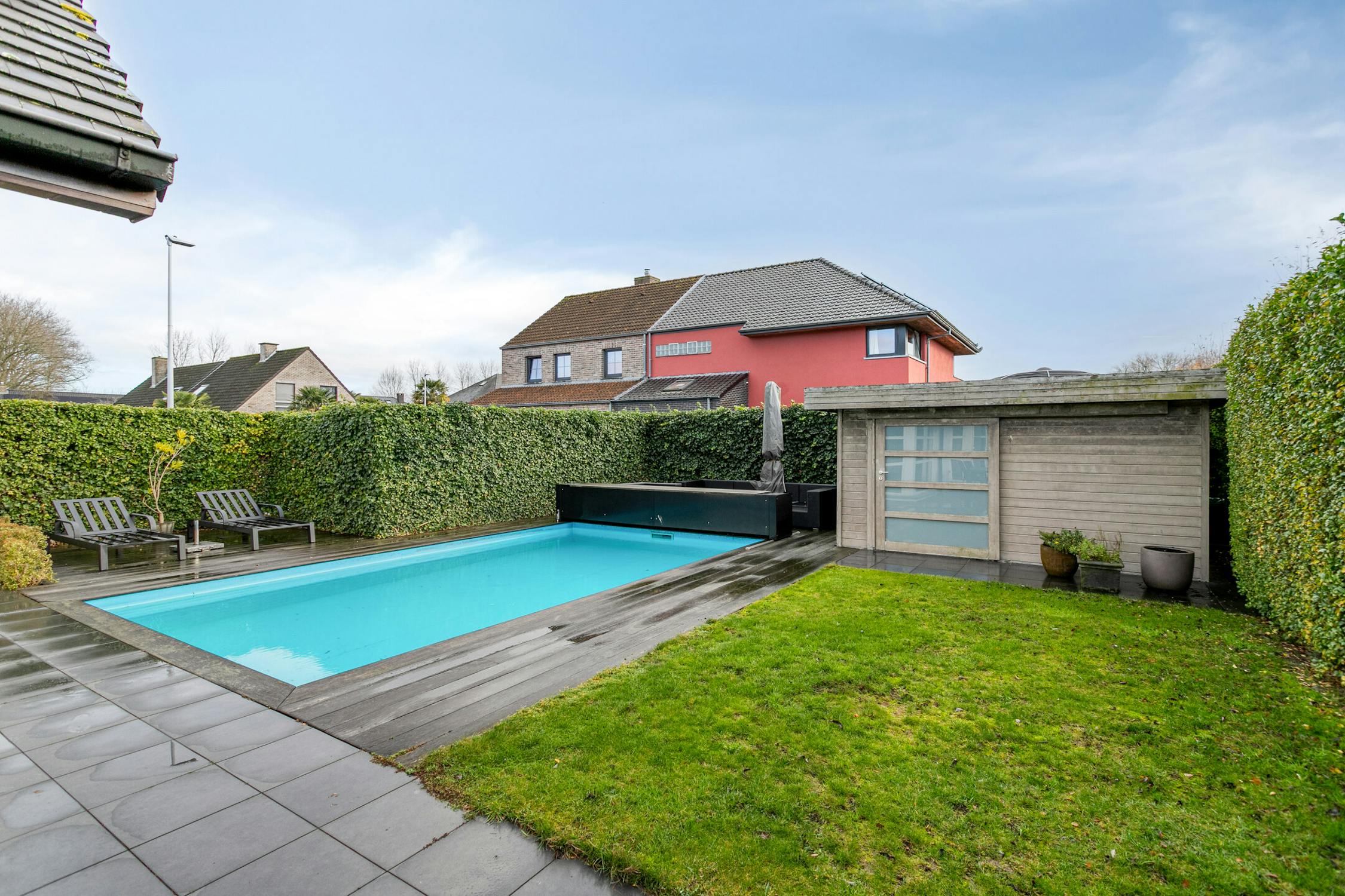 - oprit met plaats voor meer dan vier wagens, verzorgde tuin met terras en een verwarmd zwembad.