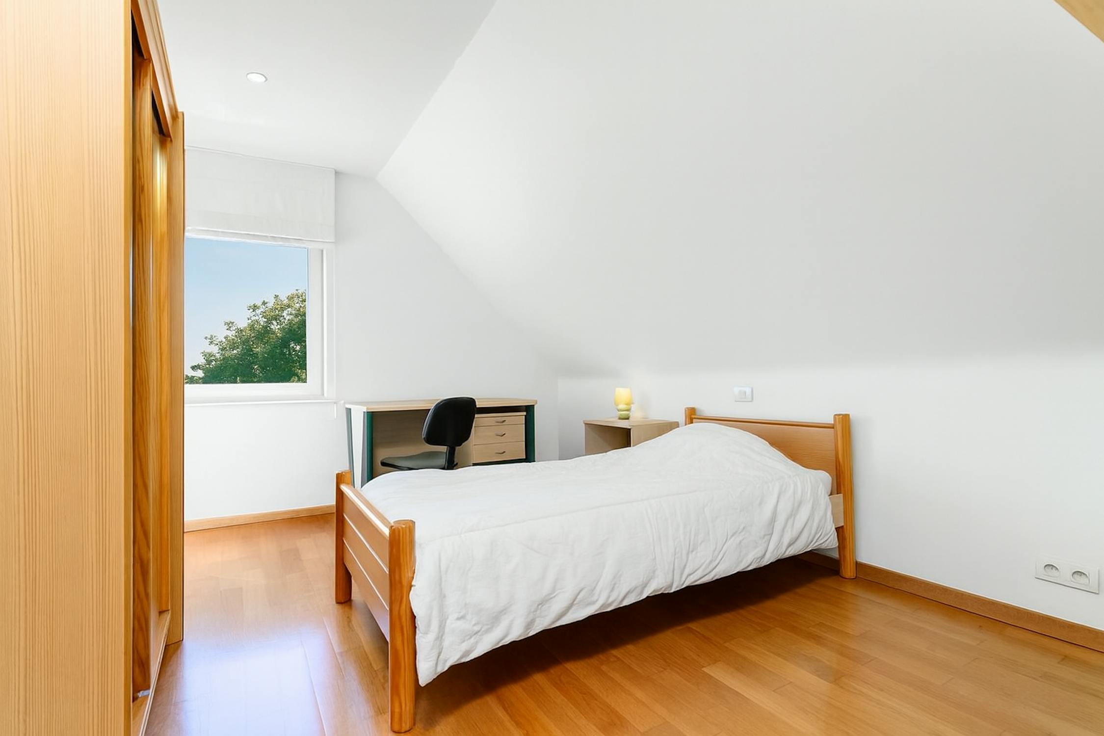 Op de eerste verdieping bevinden zich drie ruime slaapkamers, waaronder een master met ingebouwde dressing. Elk van de kamers is voorzien van een warme parketvloer. Verder op deze verdieping vindt u de badkamer, die is afgewerkt met een rustgevend kleurenpalet en uitgerust met een dubbele wastafel, inloopdouche, ligbad en een geïntegreerde sauna: een persoonlijke wellnessruimte in eigen huis.