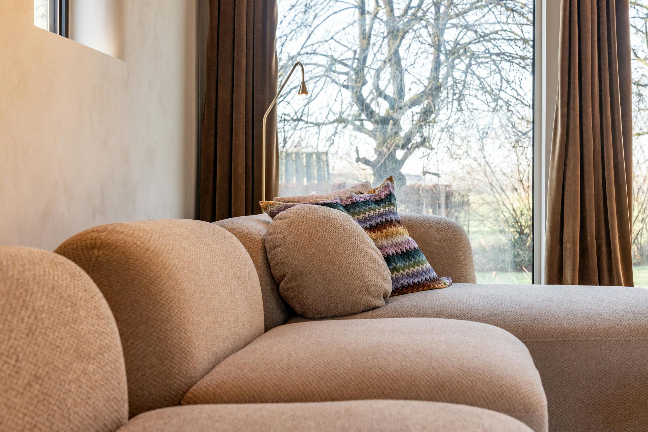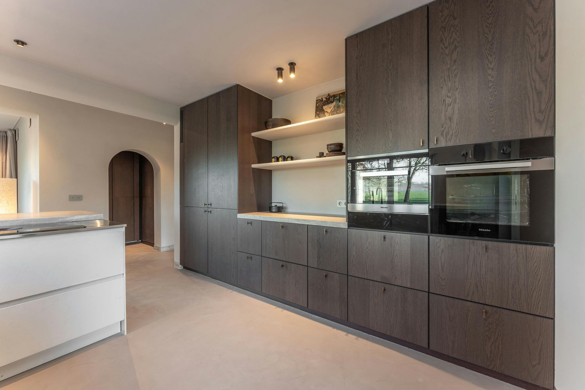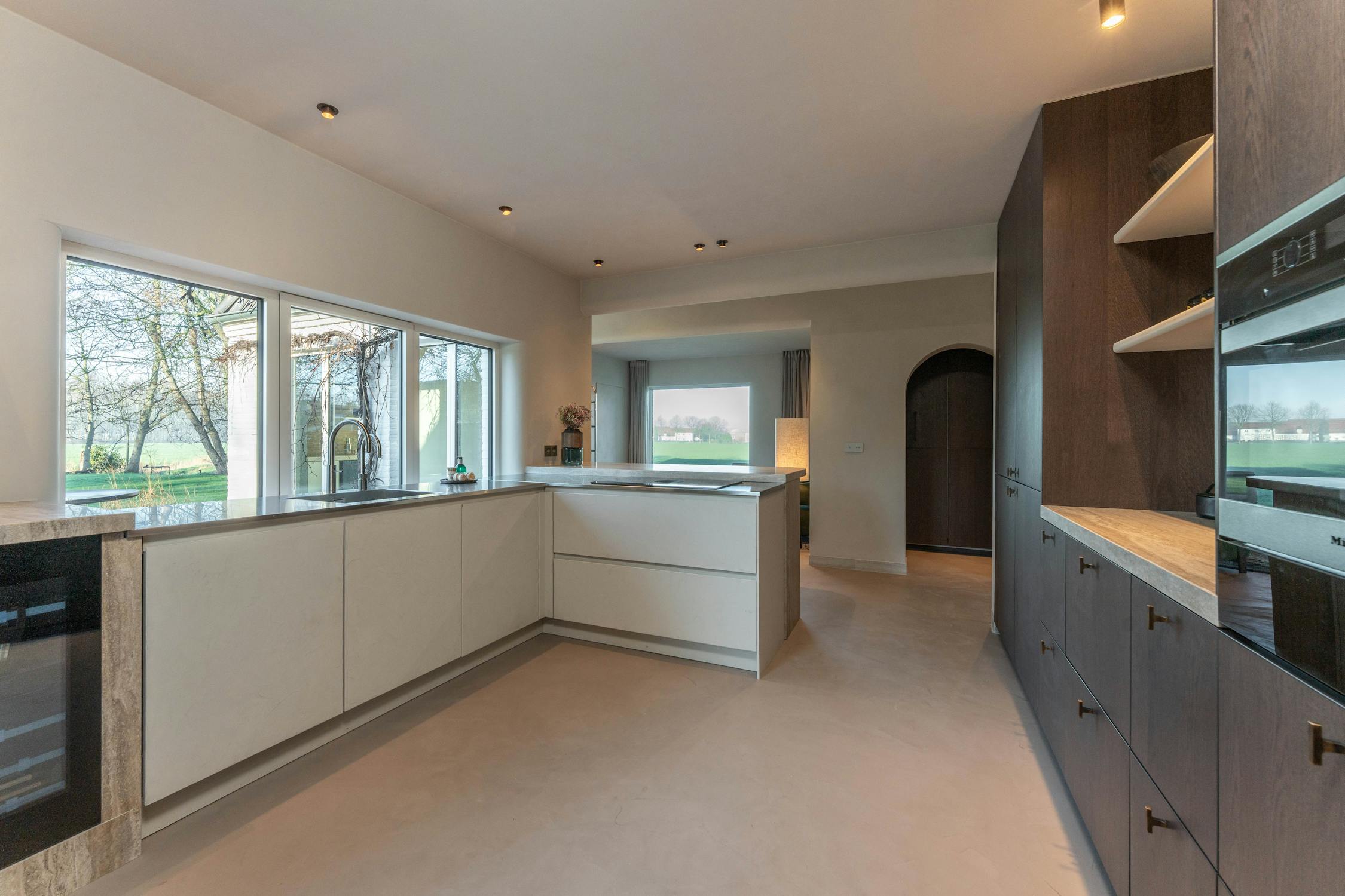 De leefkeuken is royaal opgevat en vormt een absolute blikvanger, waar u van aan de grote werkbladen via kamerhoge glaspartijen uitkijkt op de tuin en het omliggende groen. Aan deze zijde zorgen witte, greeploze kasten voor een strak en licht geheel, terwijl het andere deel van de keuken volledig werd uitgewerkt in warm, donker maatwerkhout dat tot aan het plafond reikt. Dit vakmanschap herbergt hoogwaardige Miele-toestellen en tal van opbergmogelijkheden. Het werkblad loopt subtiel over in een bar- en ontbijthoek die zich perfect leent voor informele momenten en gezellige ochtenden.