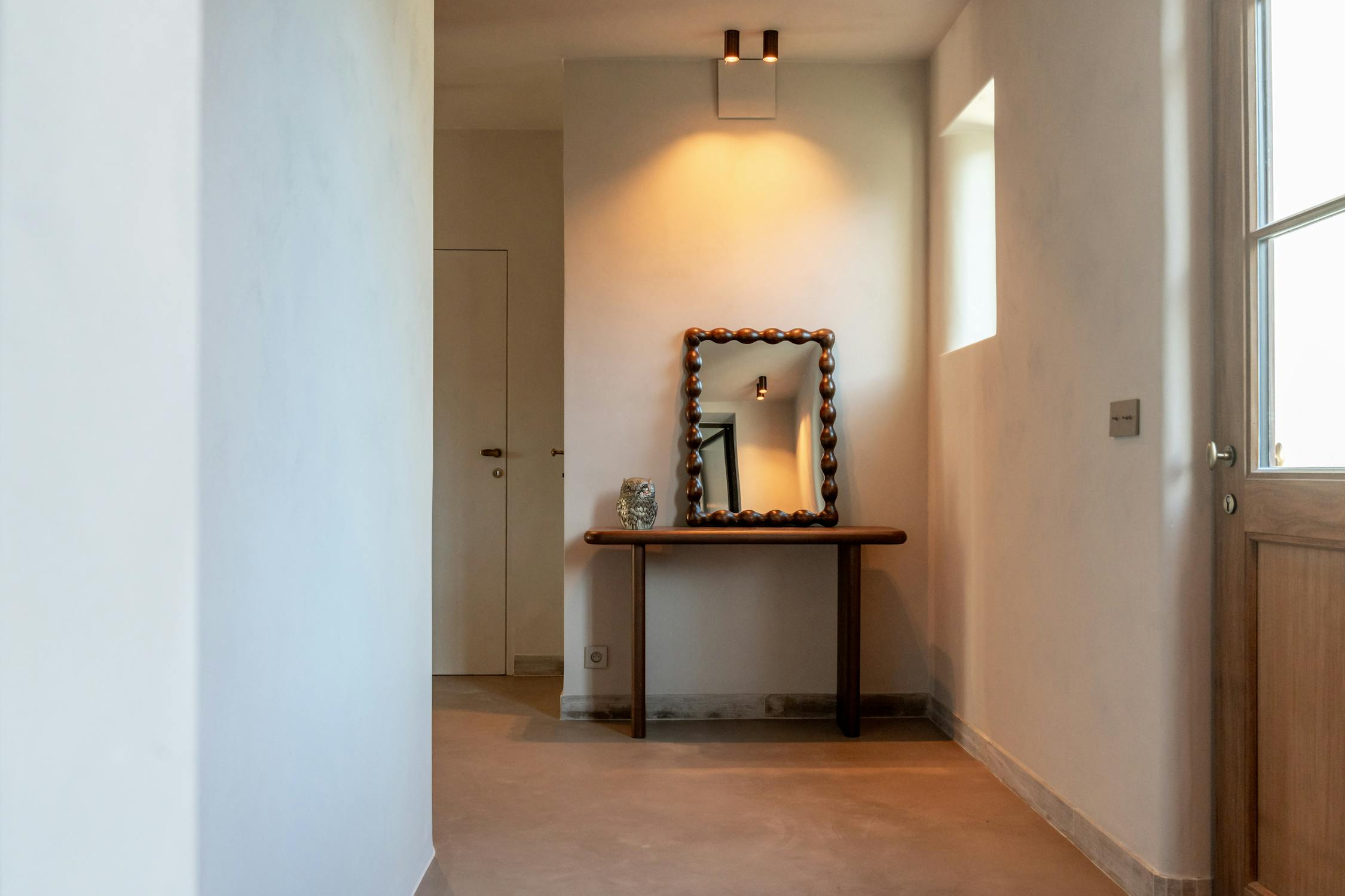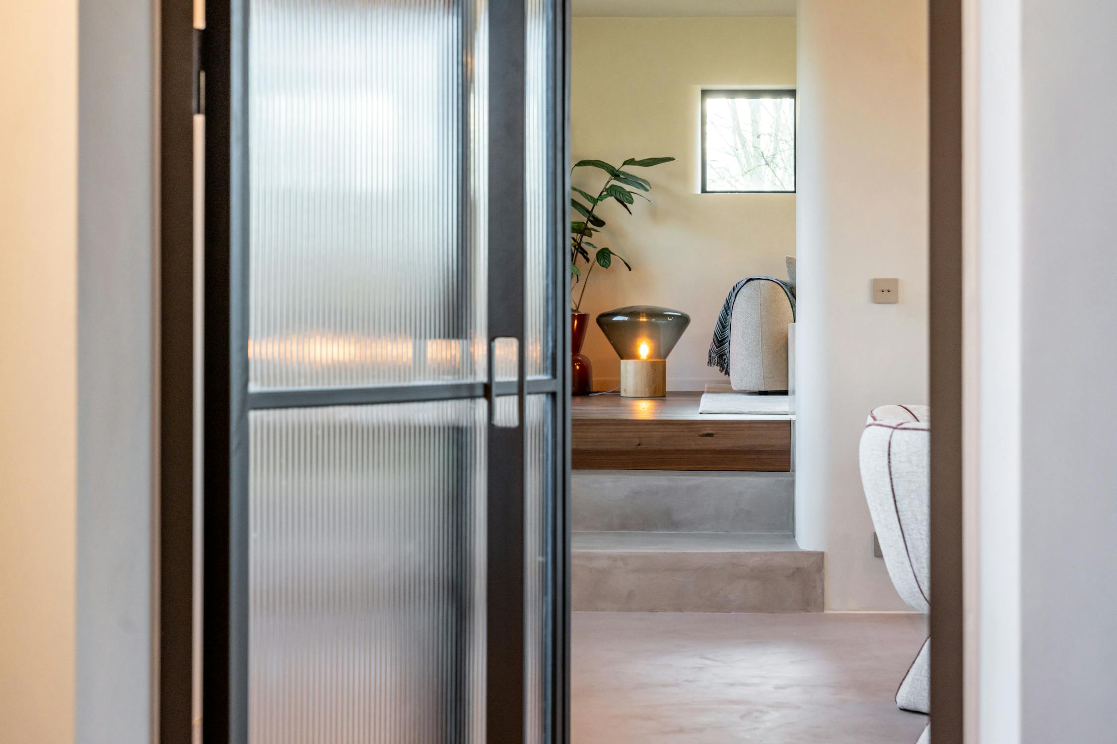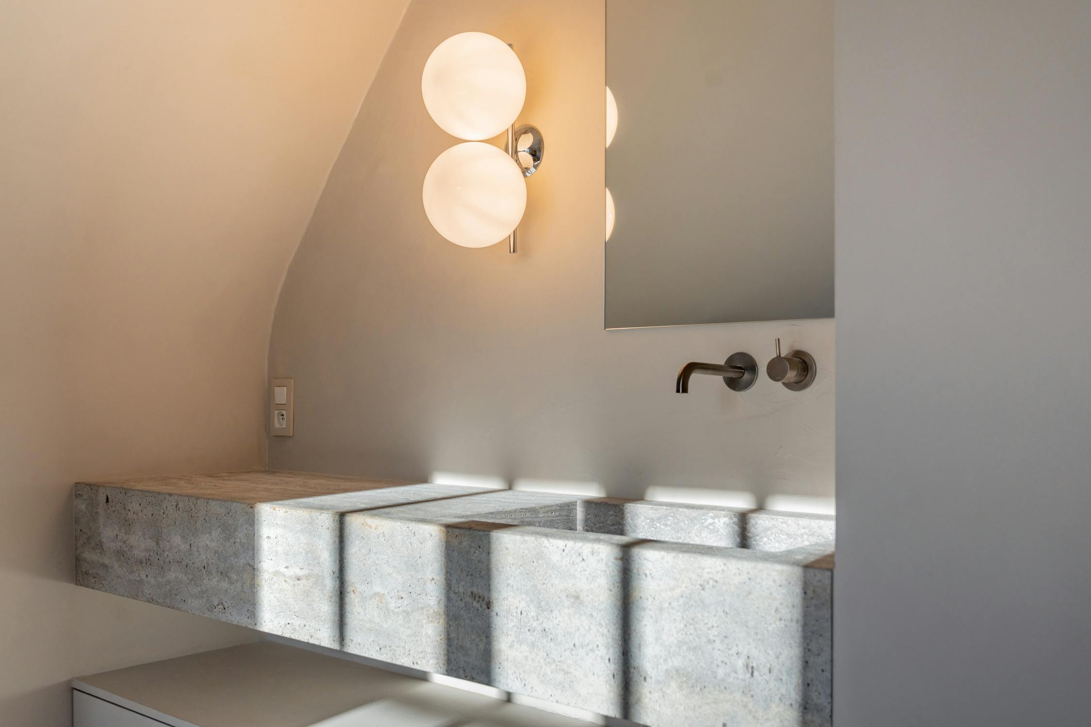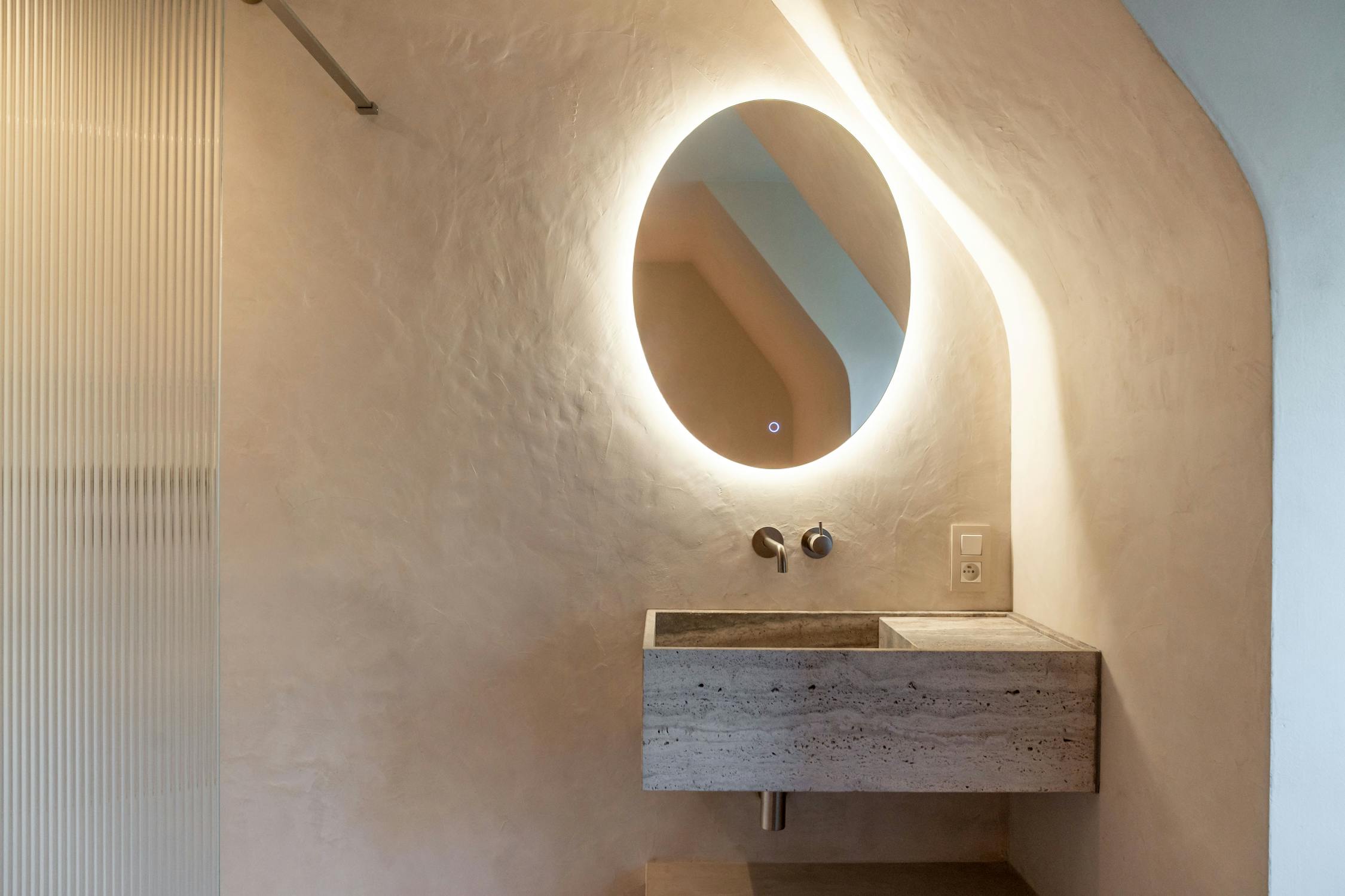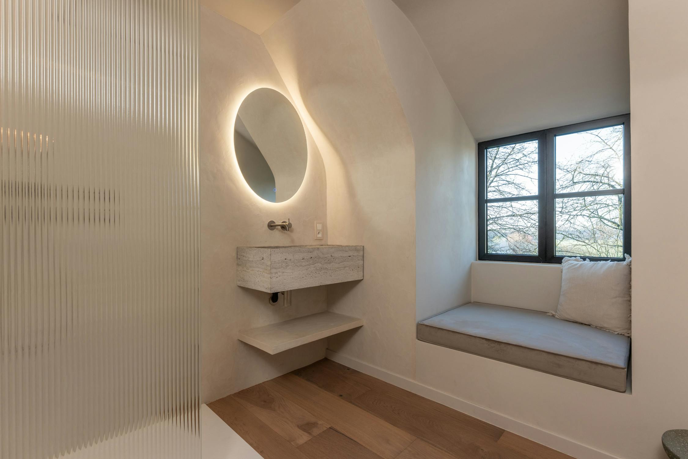 De badkamers zijn afgewerkt in zachte, natuurlijke materialen en lichte grijstinten die een rustgevend en verfijnd geheel vormen. De master badkamer beschikt over een ruime inloop-regendouche, toilet en een dubbel wasmeubel, afgewerkt met elegant maatwerk en gekalkverfde muren die extra diepte en karakter geven aan de ruimte. De aparte badkamer is uitgerust met een luxueus ingebouwd ligbad en de gastenkamer tot slot beschikt over een eigen royale inloop-regendouche.