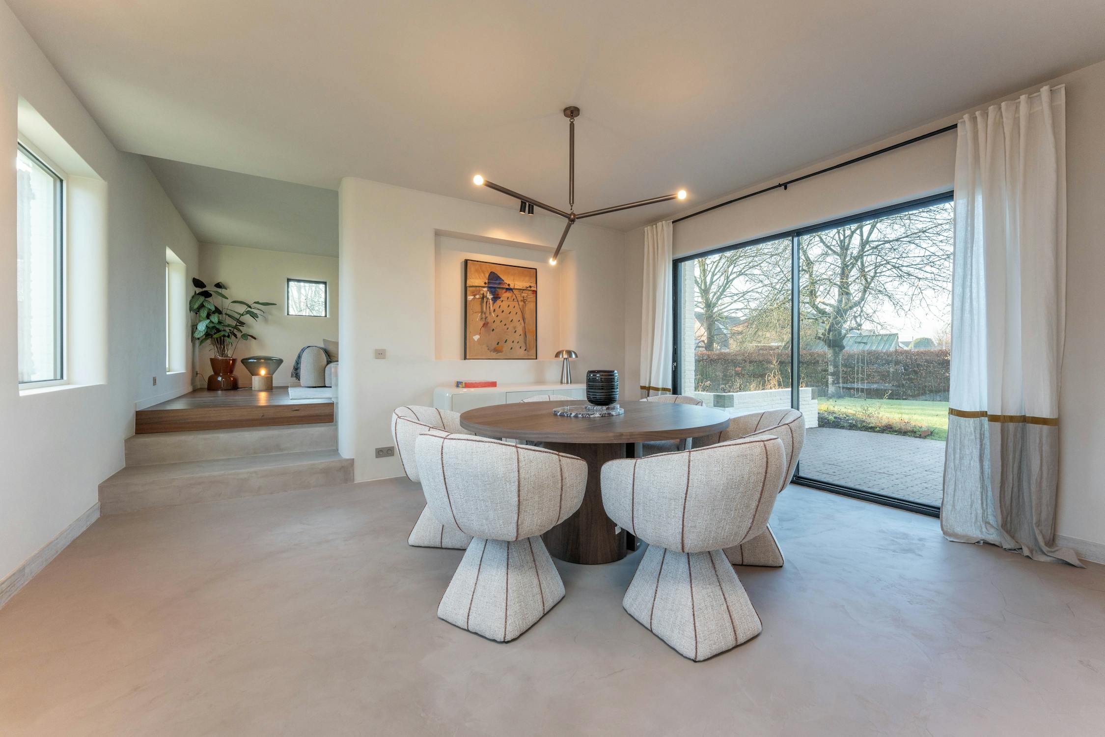 De leefruimtes zijn uitzonderlijk lichtrijk en vloeien harmonieus in elkaar over: de eetkamer is een bijzonder elegante en rustgevende ruimte, subtiel lager gelegen dan de woonkamer, wat zorgt voor een speels niveauverschil en een natuurlijke zonering binnen het leefgedeelte. De ruimte wordt gekenmerkt door haar sobere, verfijnde afwerking en een zachte materialiteit die perfect aansluit bij het hedendaagse karakter van de woning. Grote raampartijen laten het daglicht overvloedig binnenstromen en openen de eetkamer volledig naar de tuin. In de leefruimte zorgen een donkere parketvloer, een strak geïntegreerde houthaard en grote raampartijen voor een warme, uitnodigende sfeer met eveneens een uitgesproken binnen-buitengevoel.