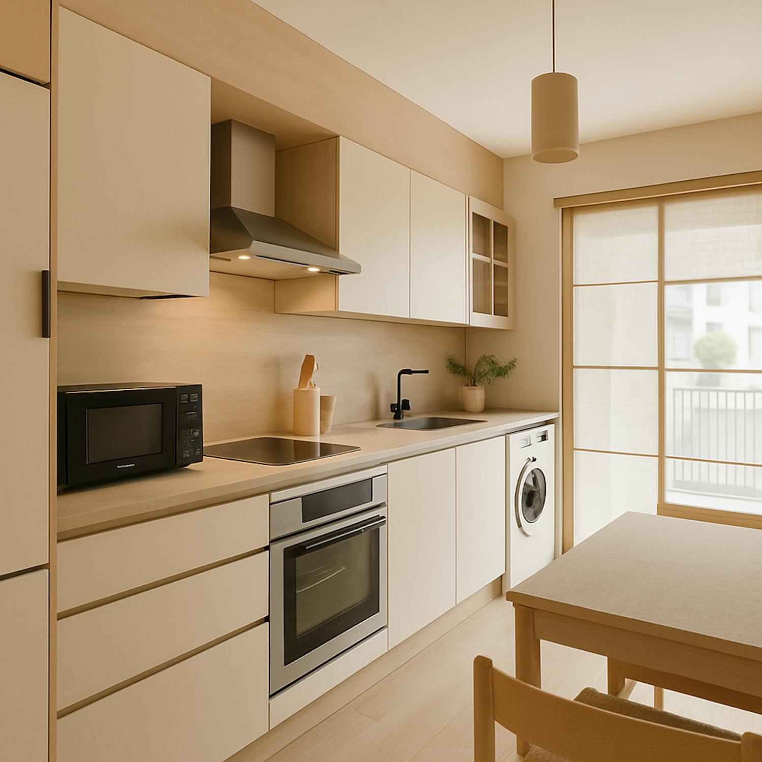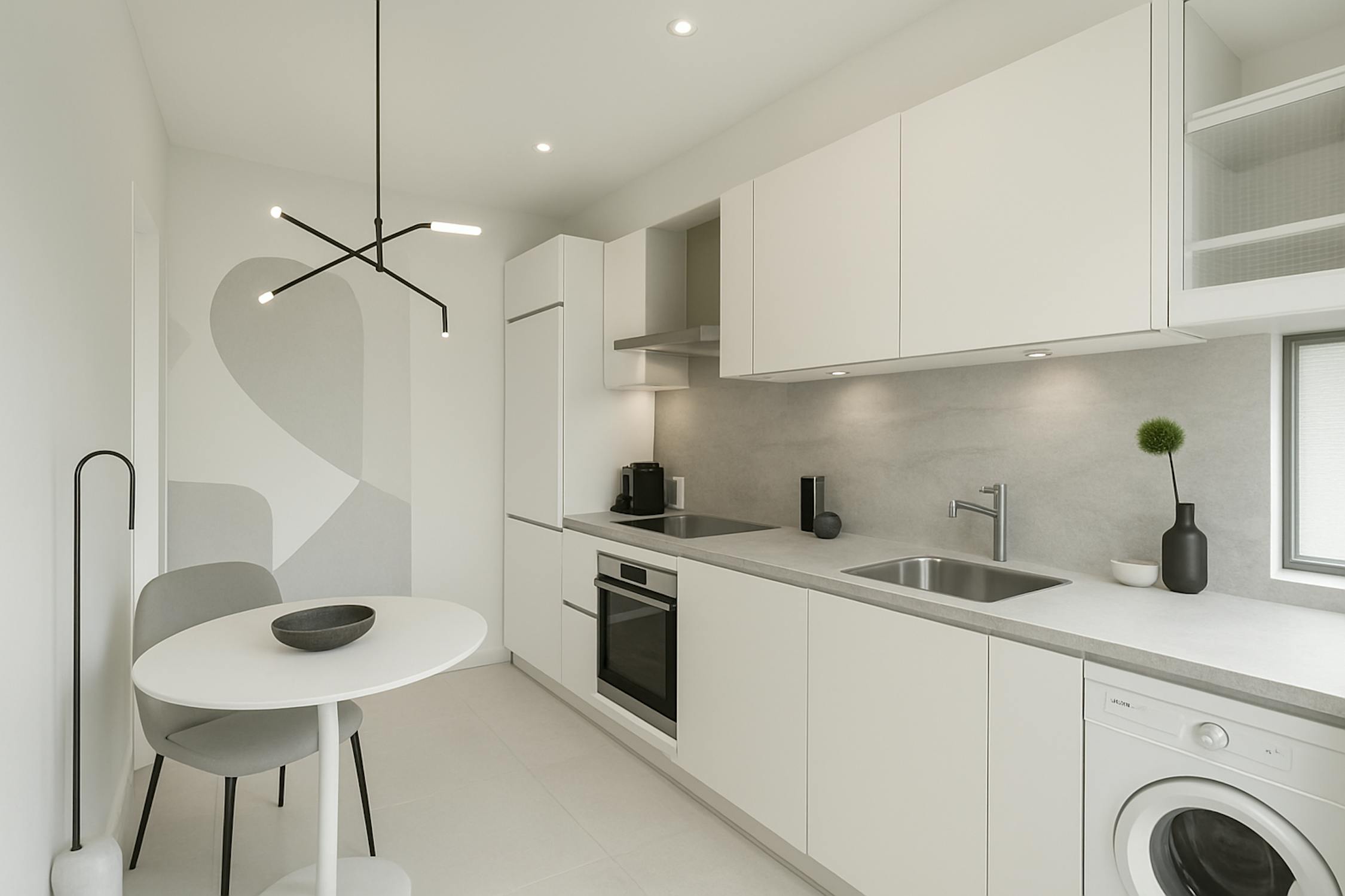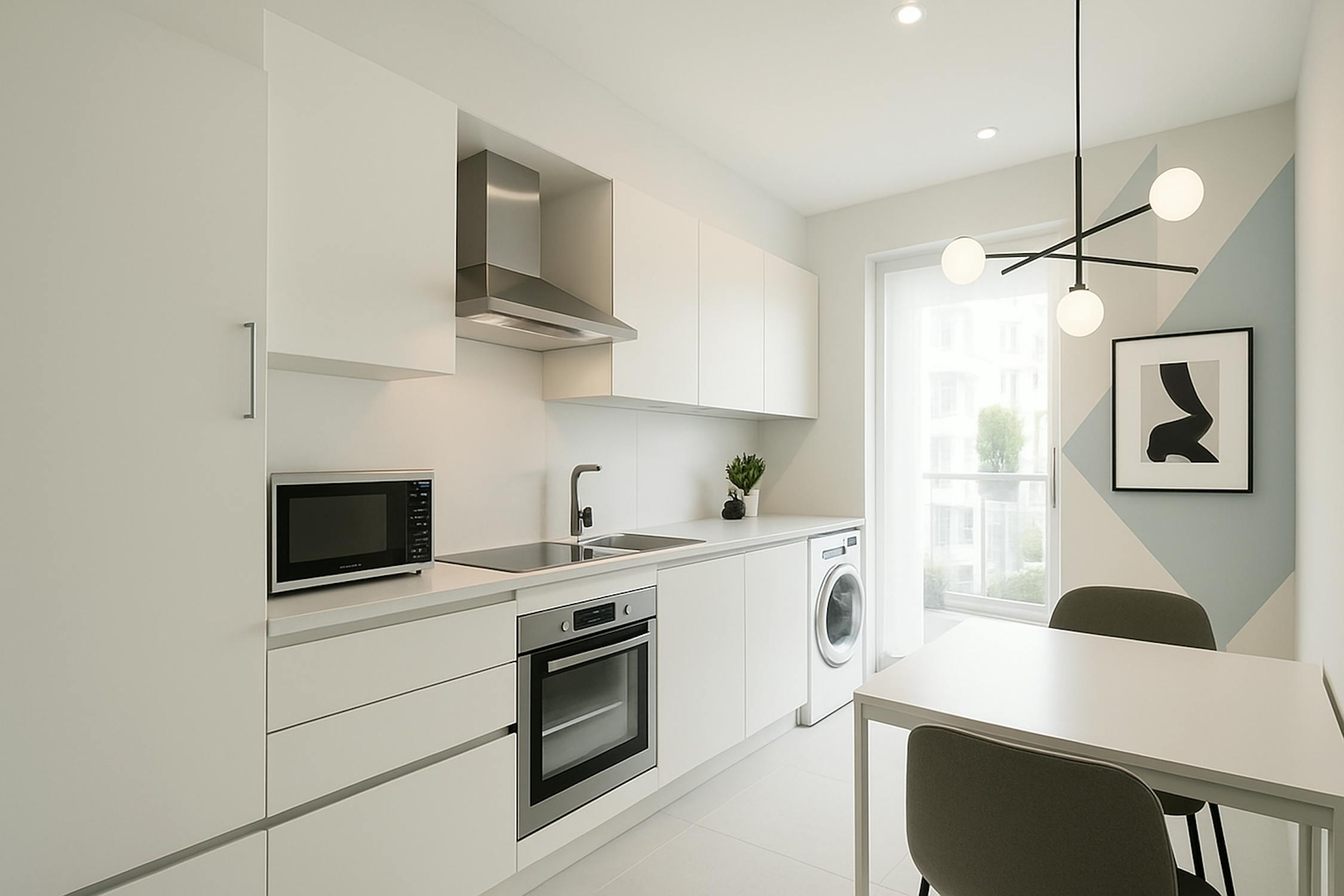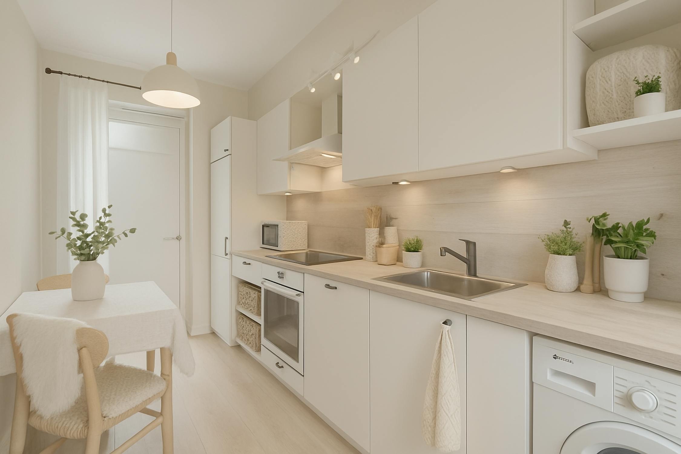 - keuken uitgerust met een keramische kookplaat, spoeltafel, vaatwas, oven, frigo met vriesvakje en aansluiting wasmachine
