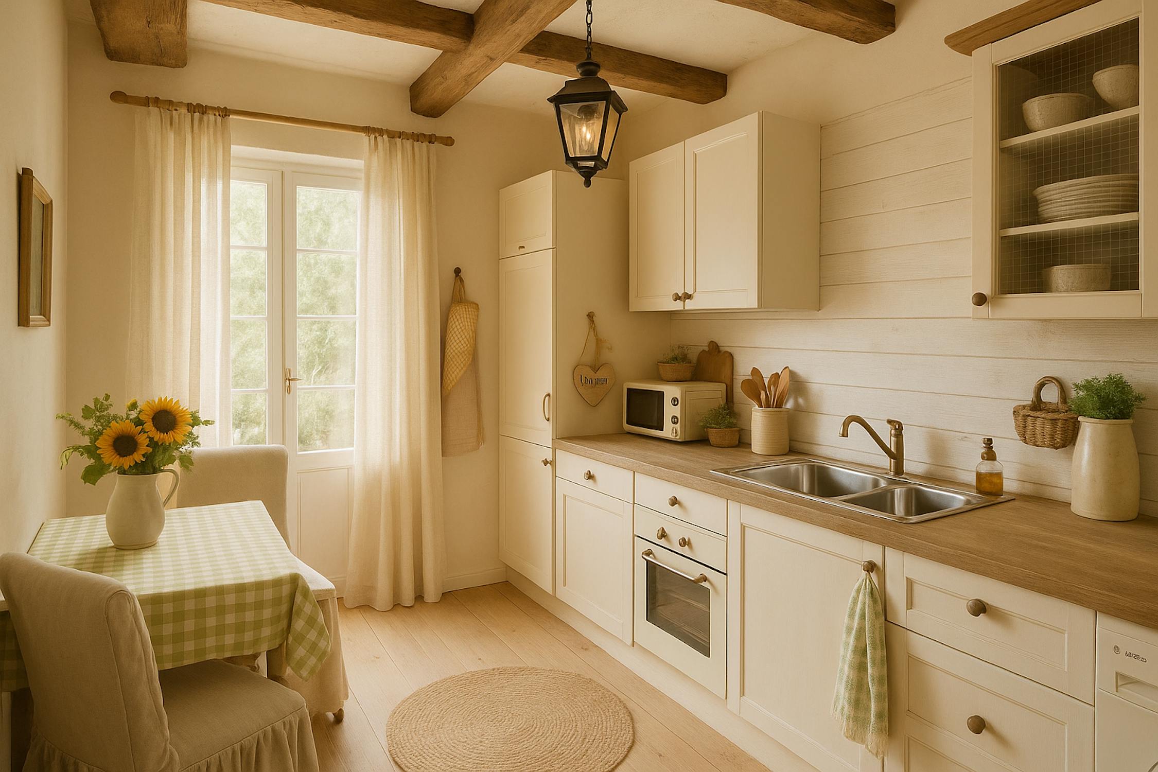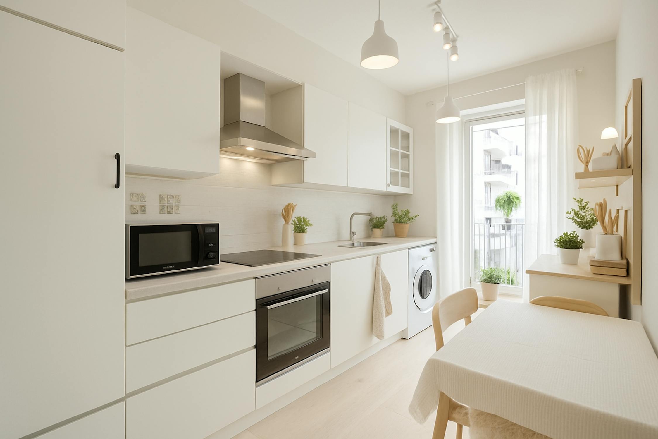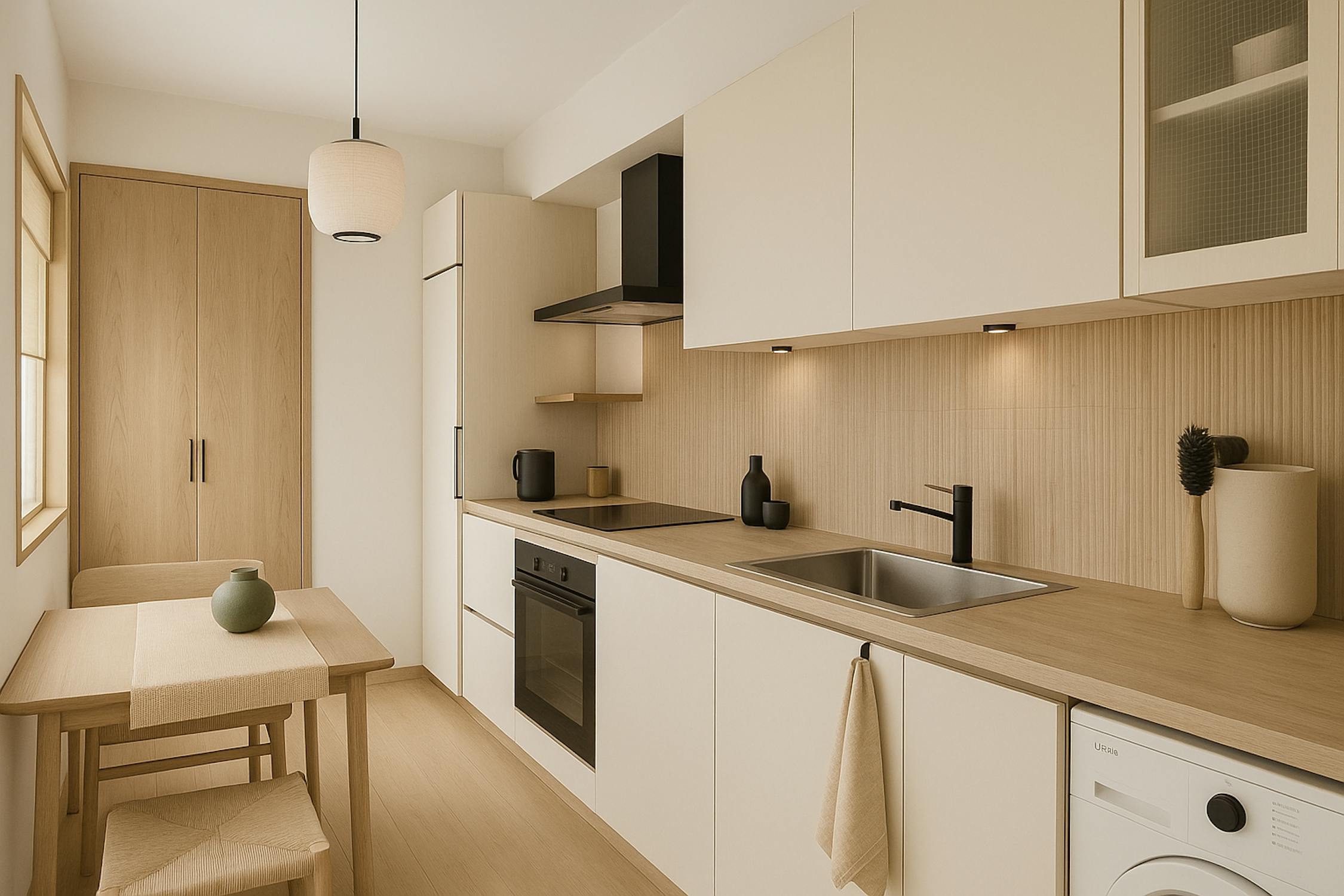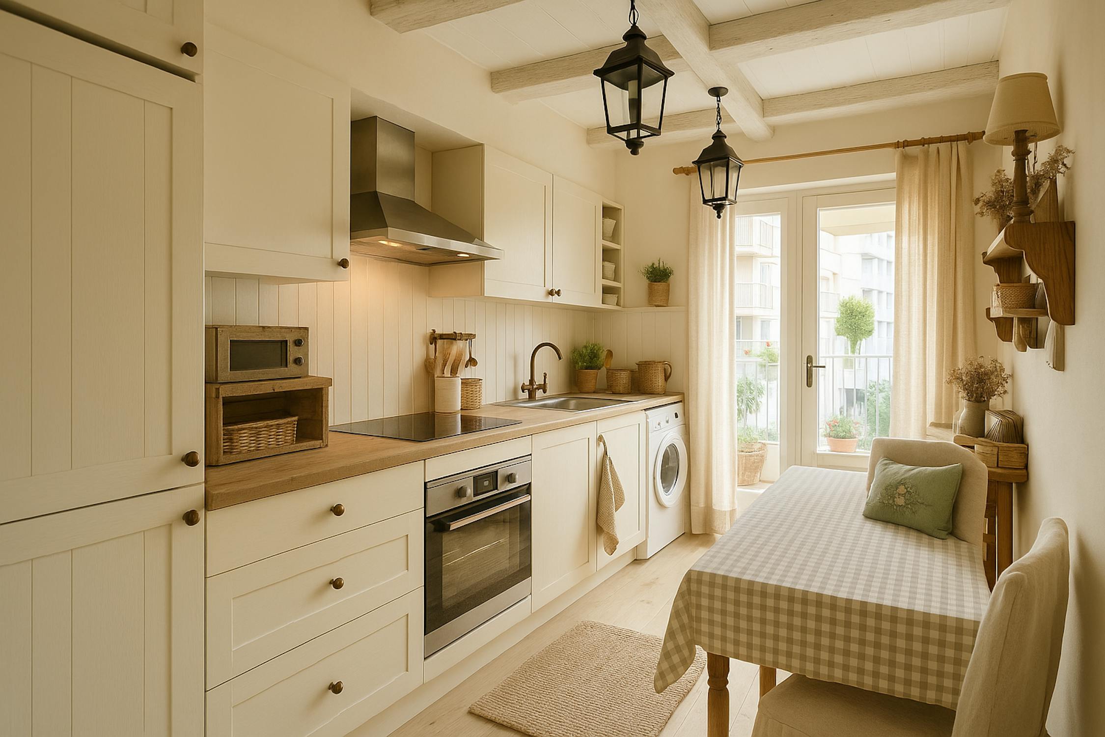 - keuken uitgerust met een keramische kookplaat, spoeltafel, vaatwas, oven, frigo met vriesvakje en aansluiting wasmachine