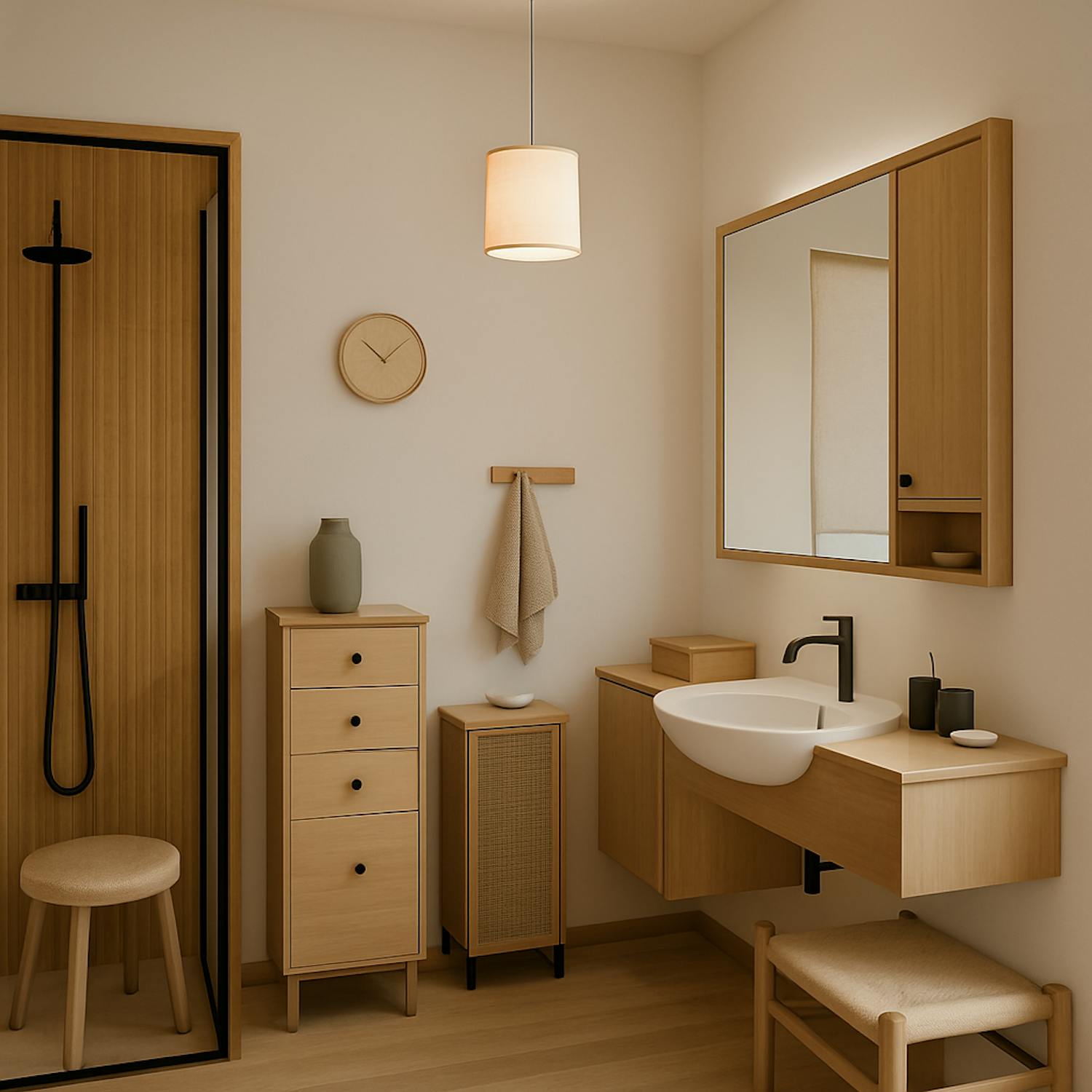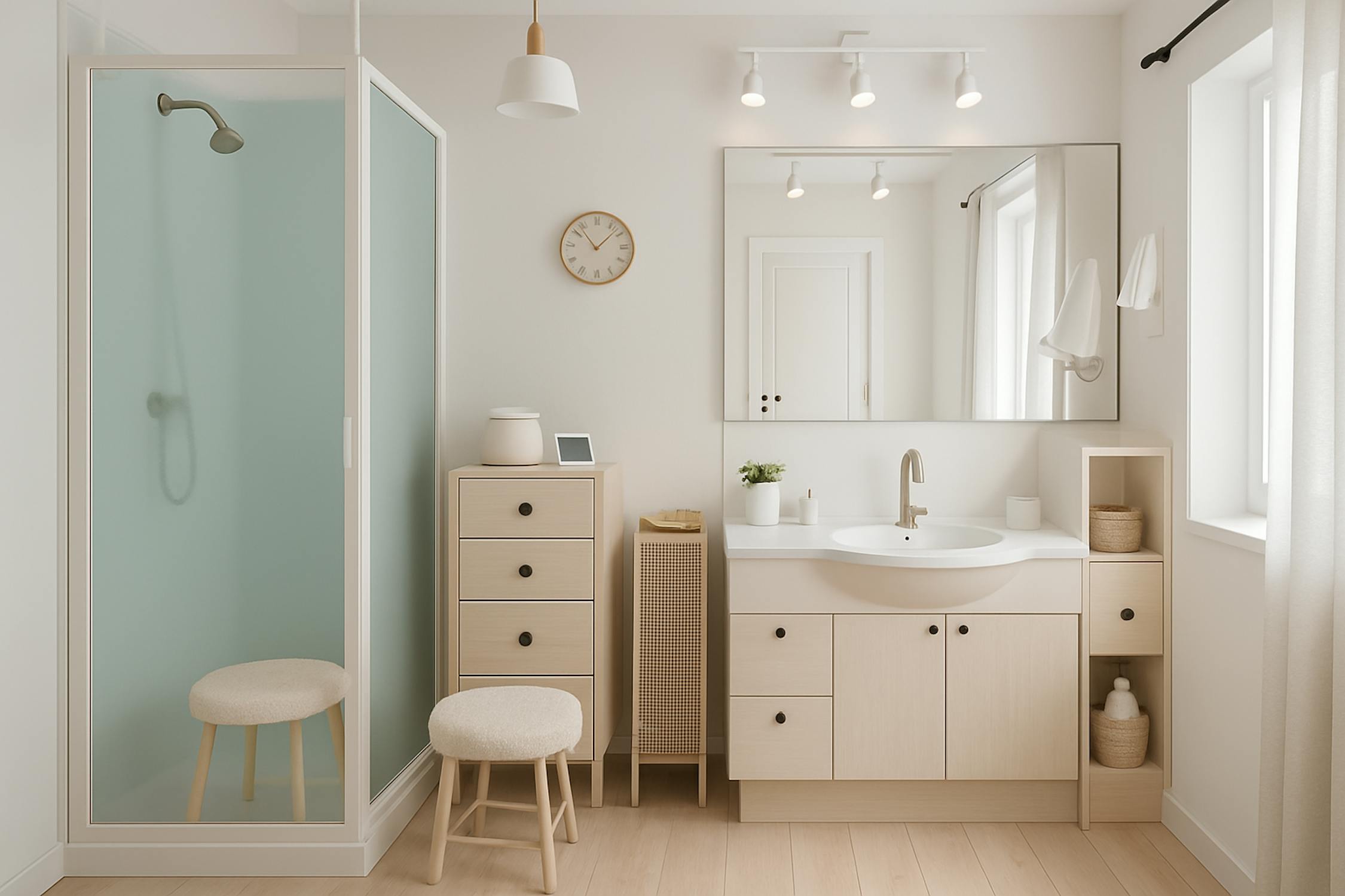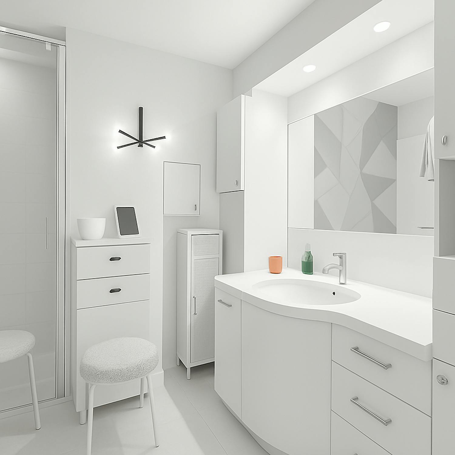 - badkamer voorzien van een badkamermeubel met lavabo, douche en toilet