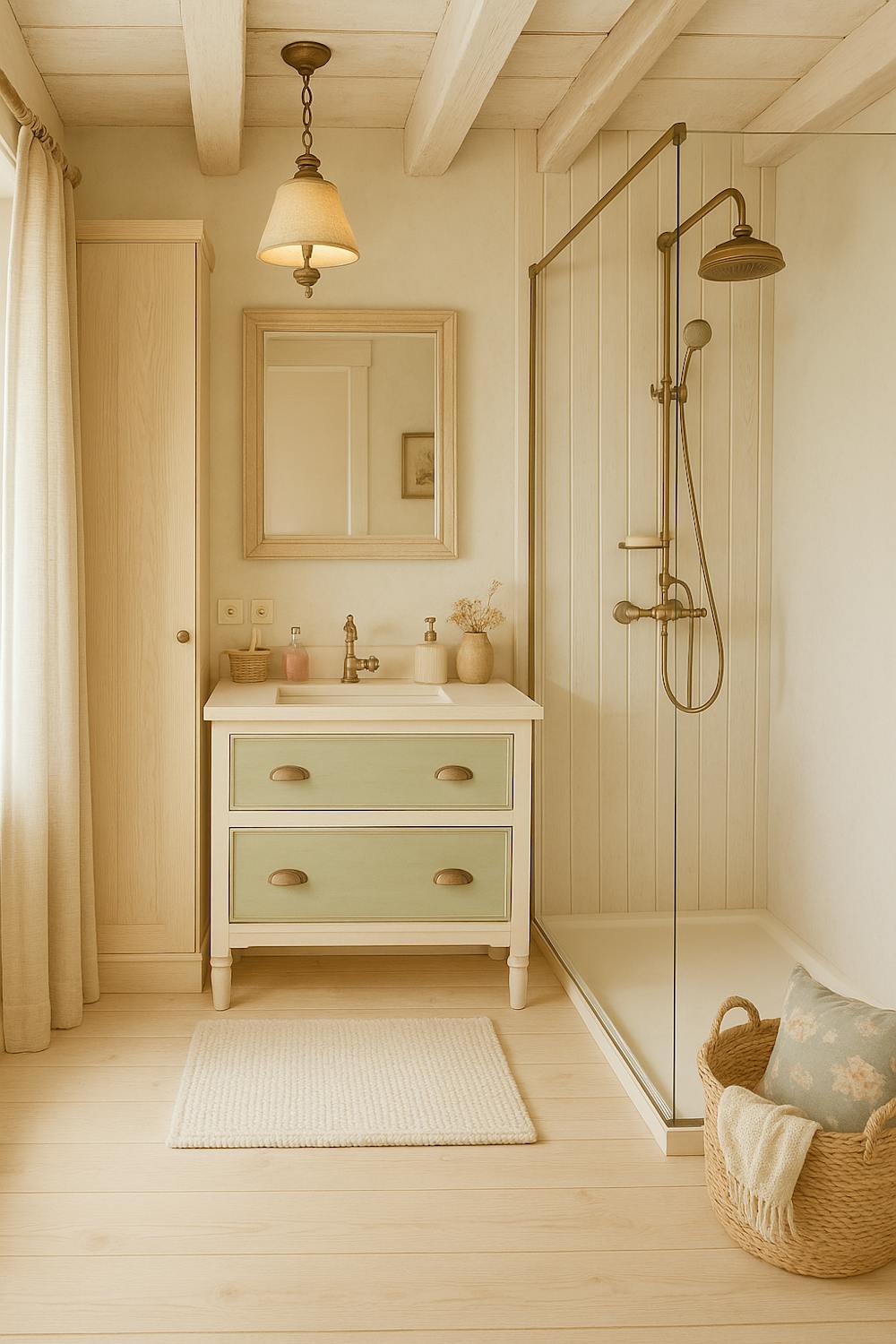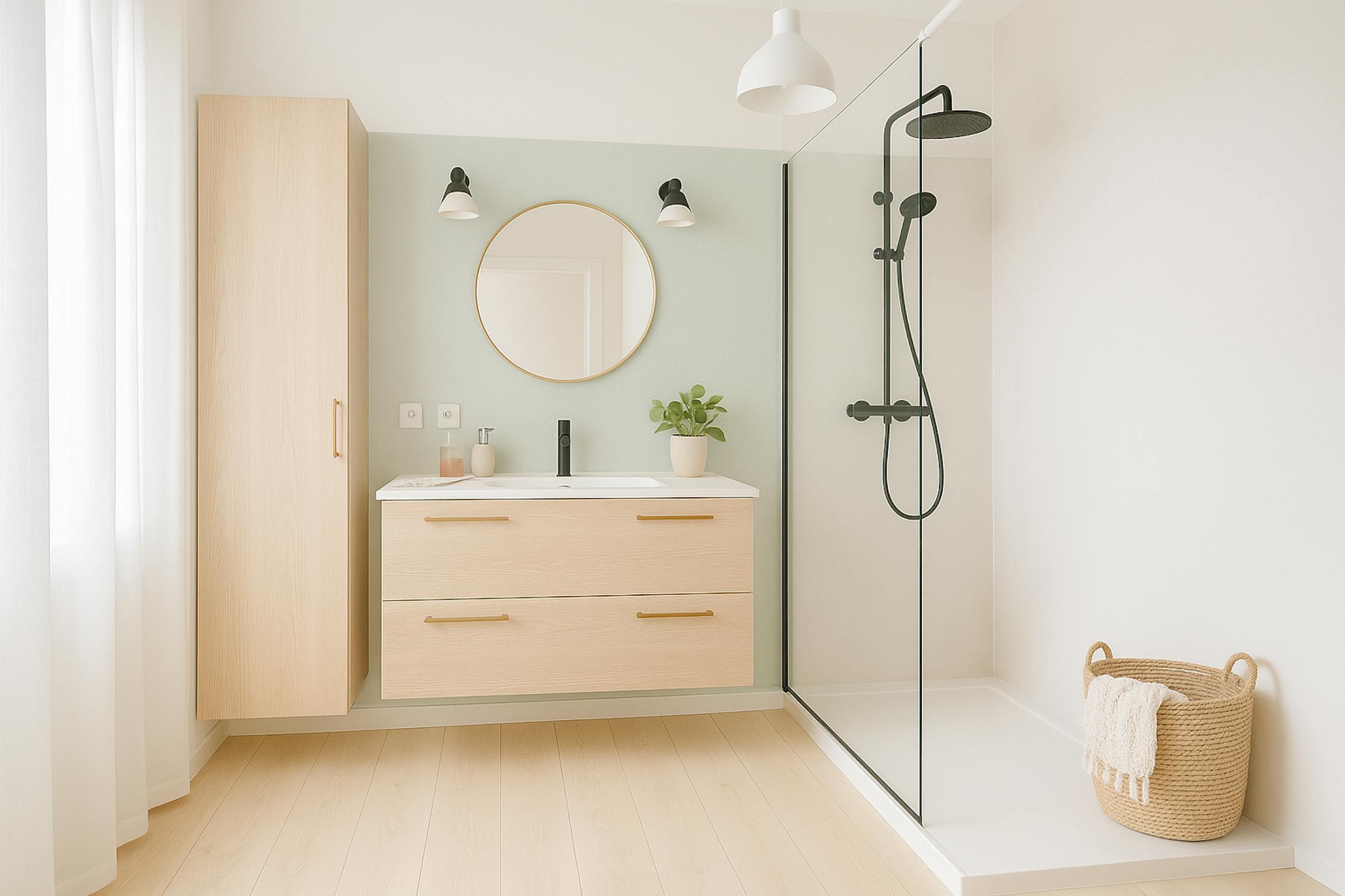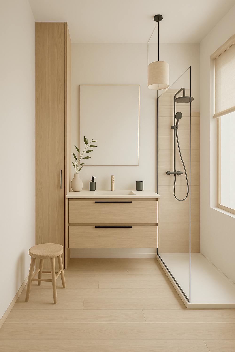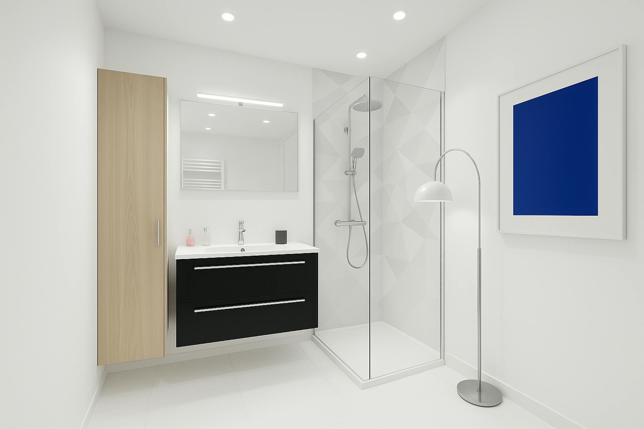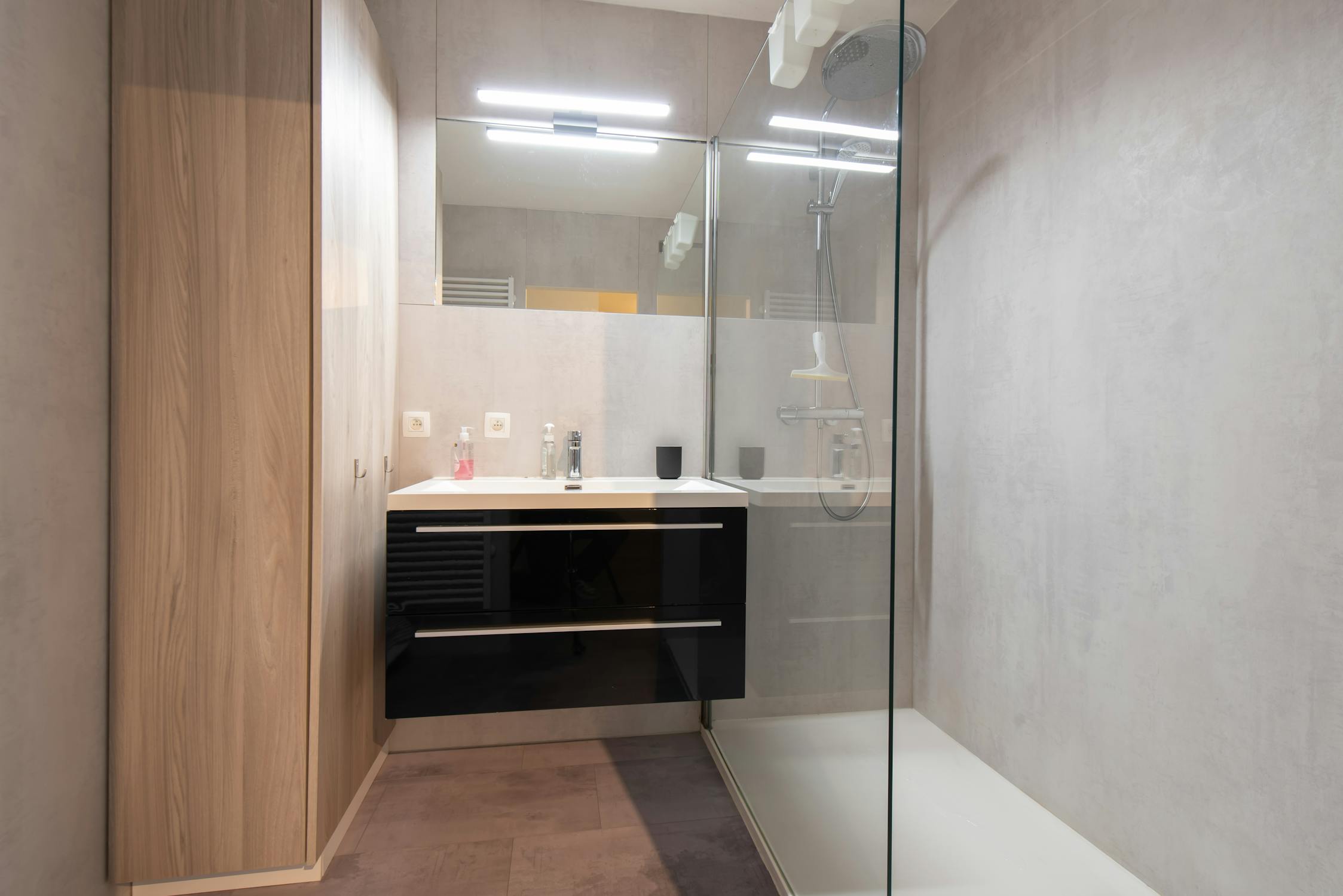- badkamer uitgerust met een inloopregendouche, badkamermeubel en opbergkast